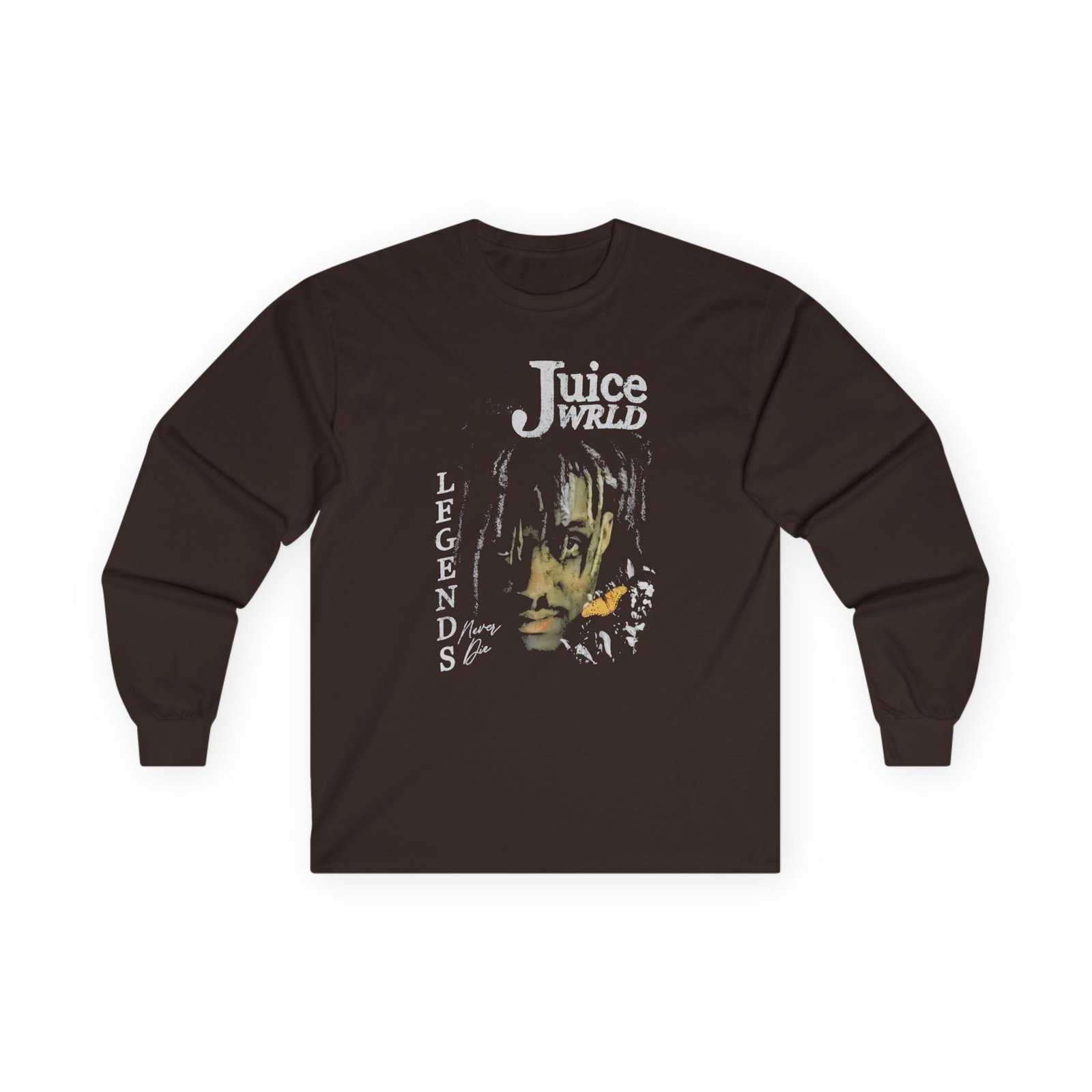 A bit more formal than a standard-issue t-shirt, the Legends Never Die Juice Wrld ultra cotton long sleeve tee is a clear comfort winner. The sleeves also act as a nice frame. There are no side seams. The shoulders are taped for improved durability. This makes for a good fitting around the shoulders and neck. The cotton used for these shirts is environmentally friendly.