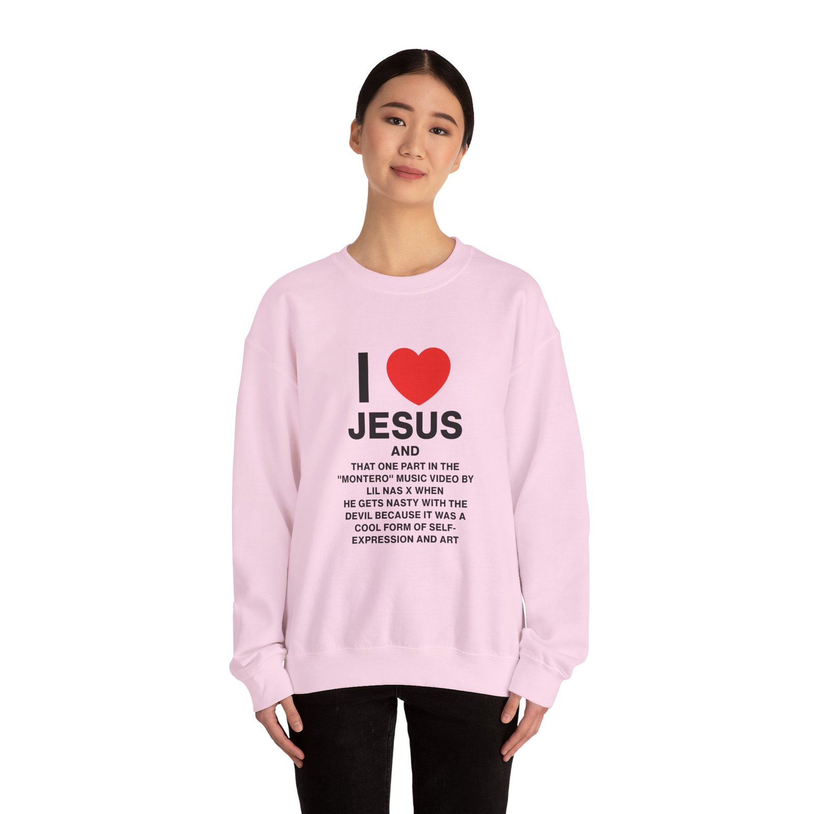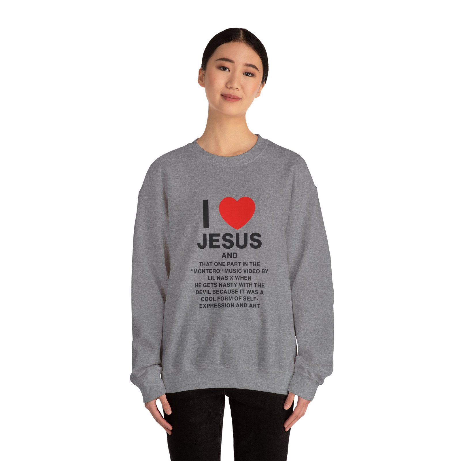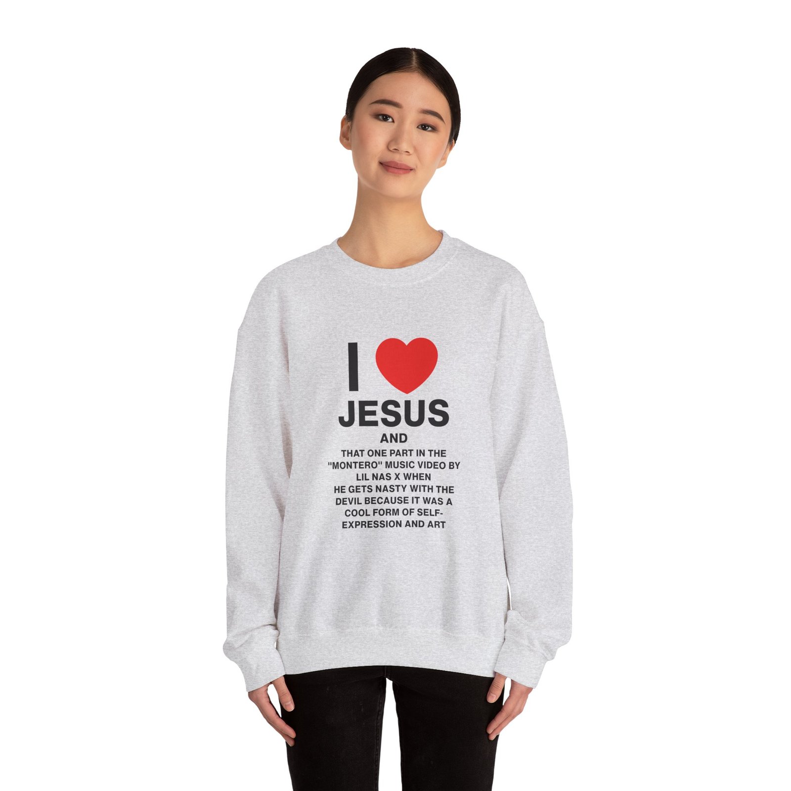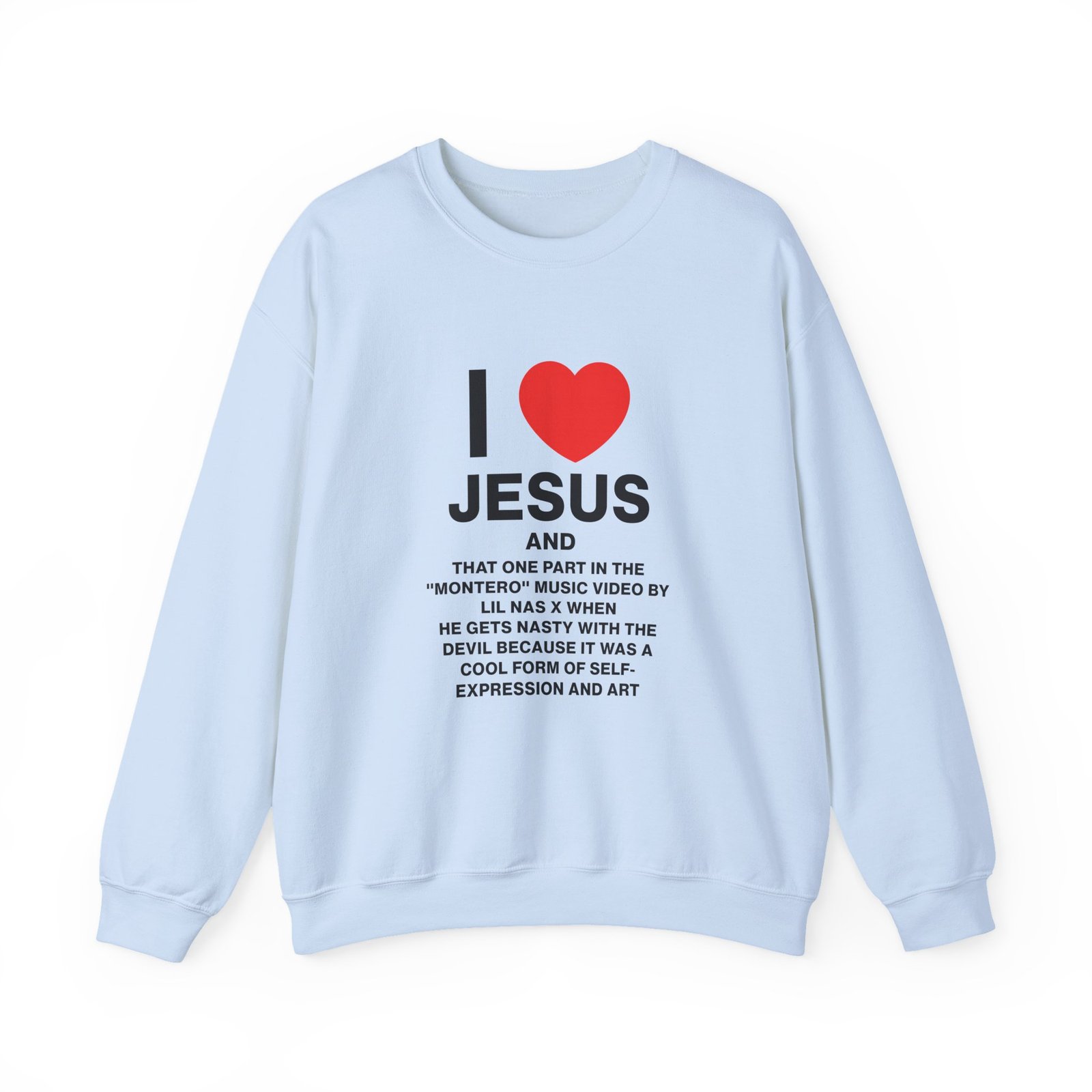 Ideal for any situation, a Lil Nas X I Love Jesus and Montero unisex heavy blend crewneck sweatshirt is pure comfort. These garments are made from polyester and cotton. This combination helps designs come out looking fresh and beautiful. The collar is ribbed knit, so it retains its shape even after washing. There are no itchy side seams on these sweaters.