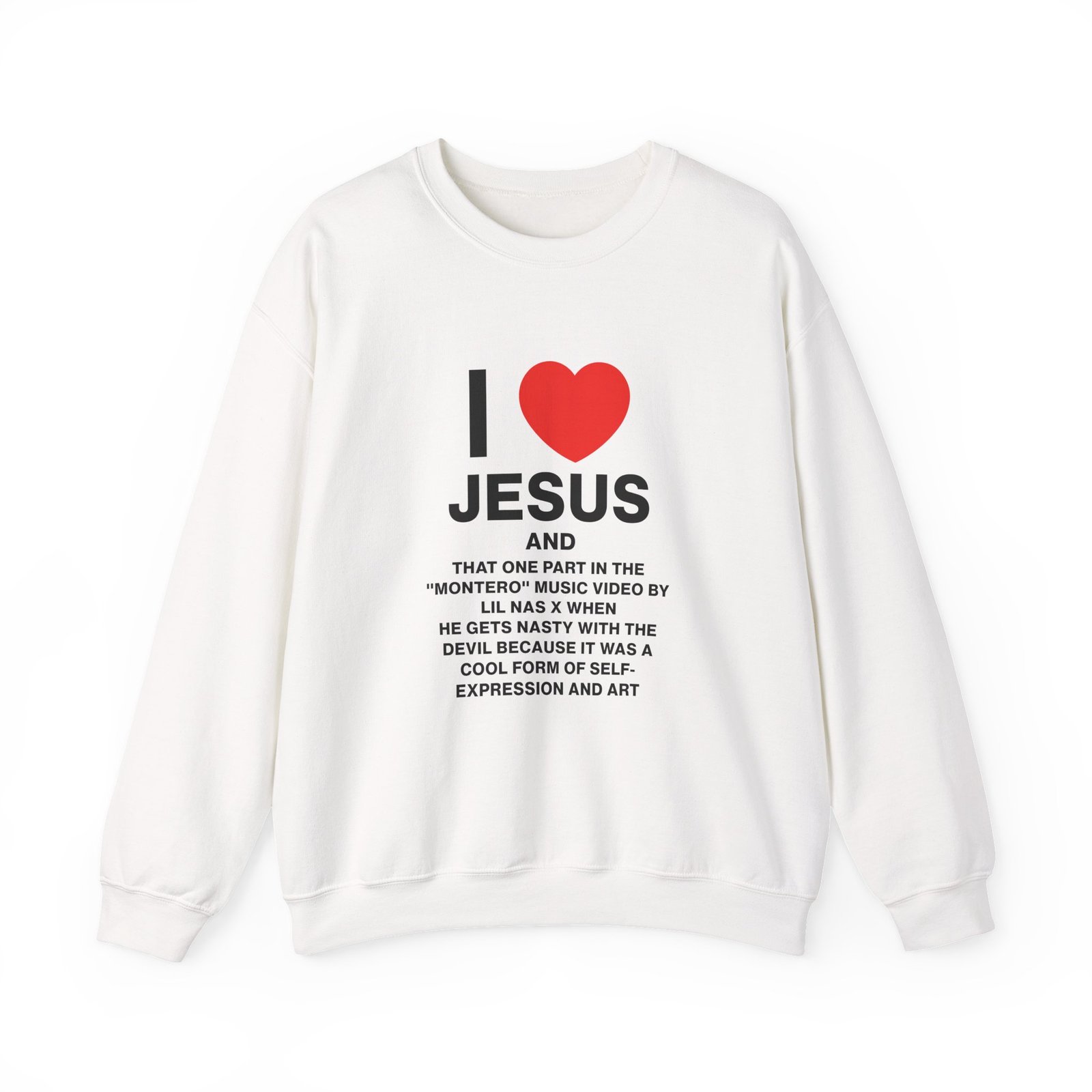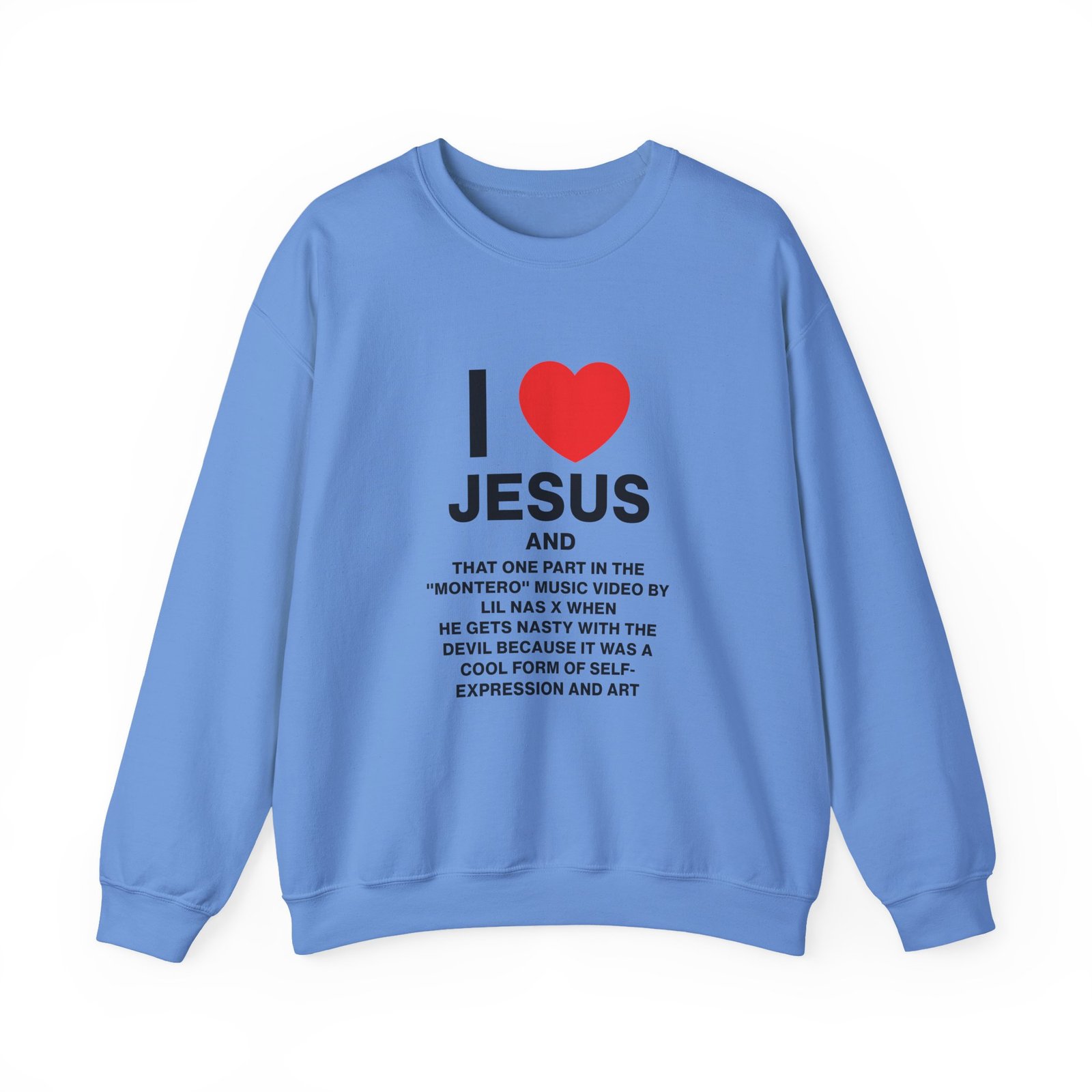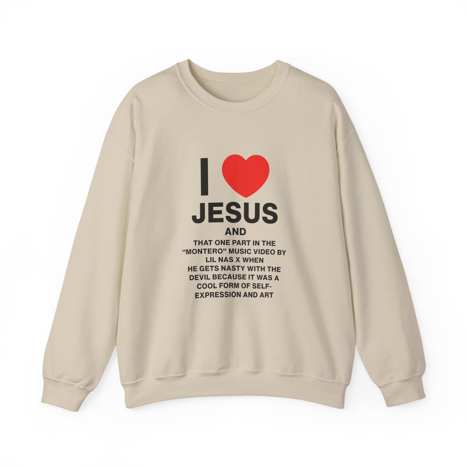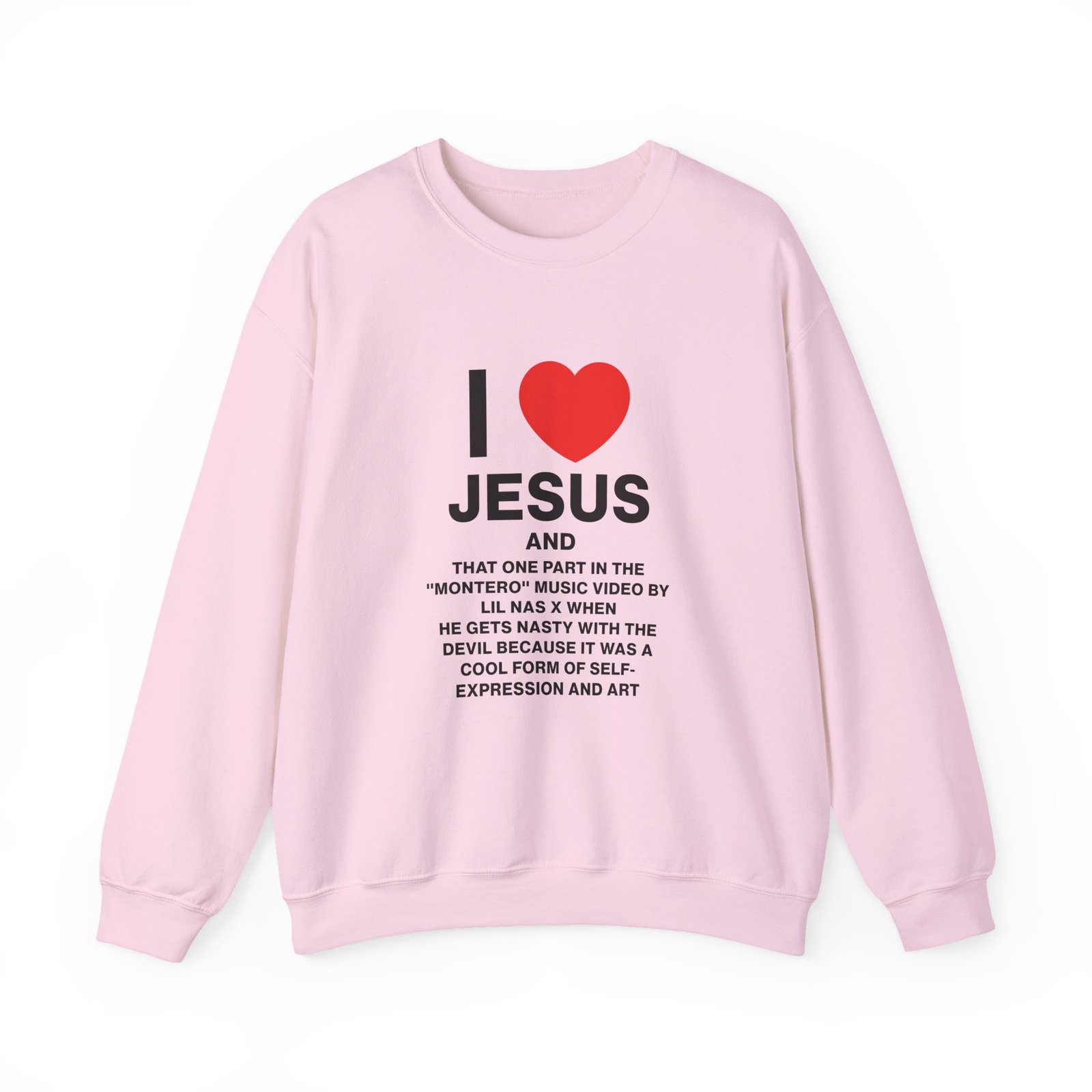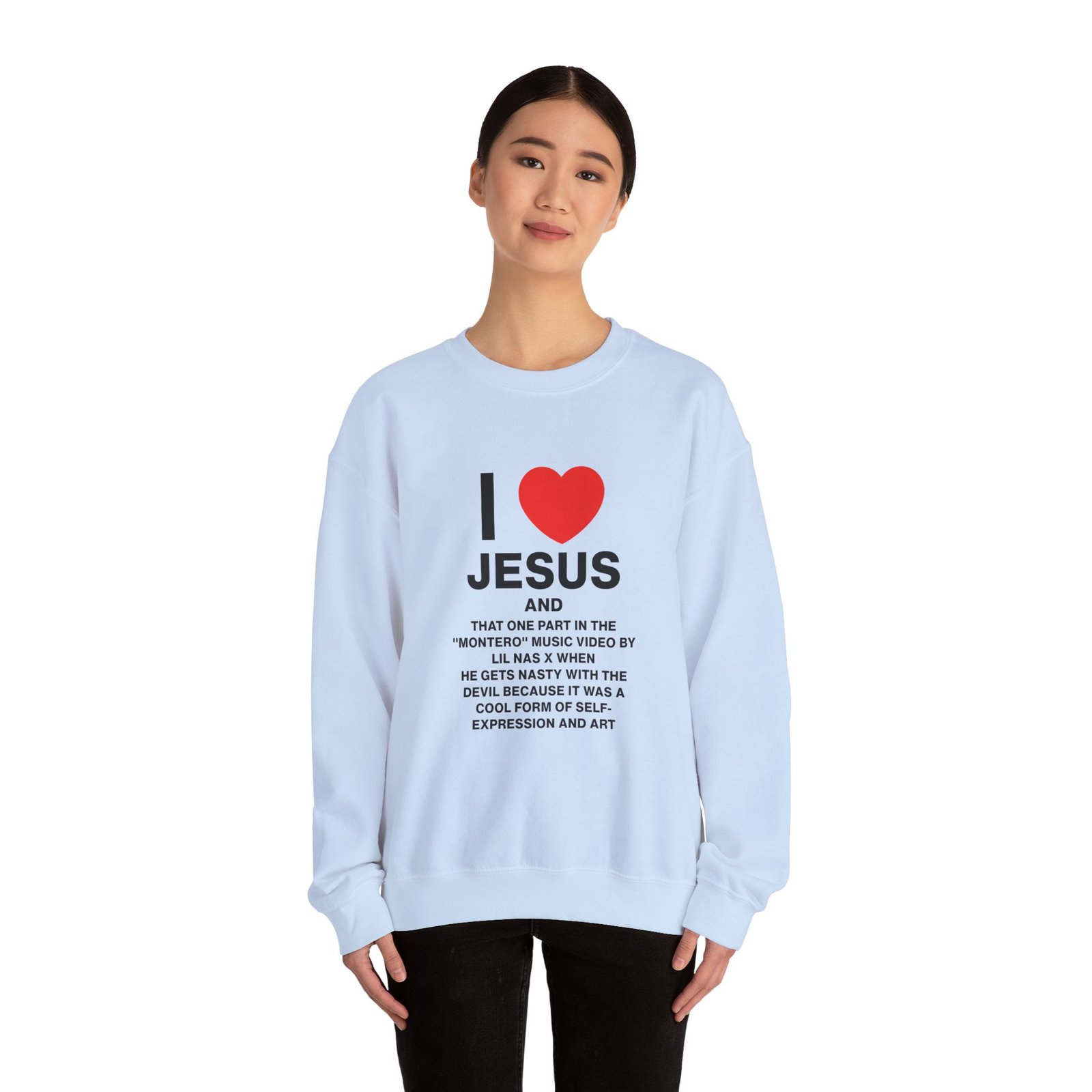 Ideal for any situation, a Lil Nas X I Love Jesus and Montero unisex heavy blend crewneck sweatshirt is pure comfort. These garments are made from polyester and cotton. This combination helps designs come out looking fresh and beautiful. The collar is ribbed knit, so it retains its shape even after washing. There are no itchy side seams on these sweaters.