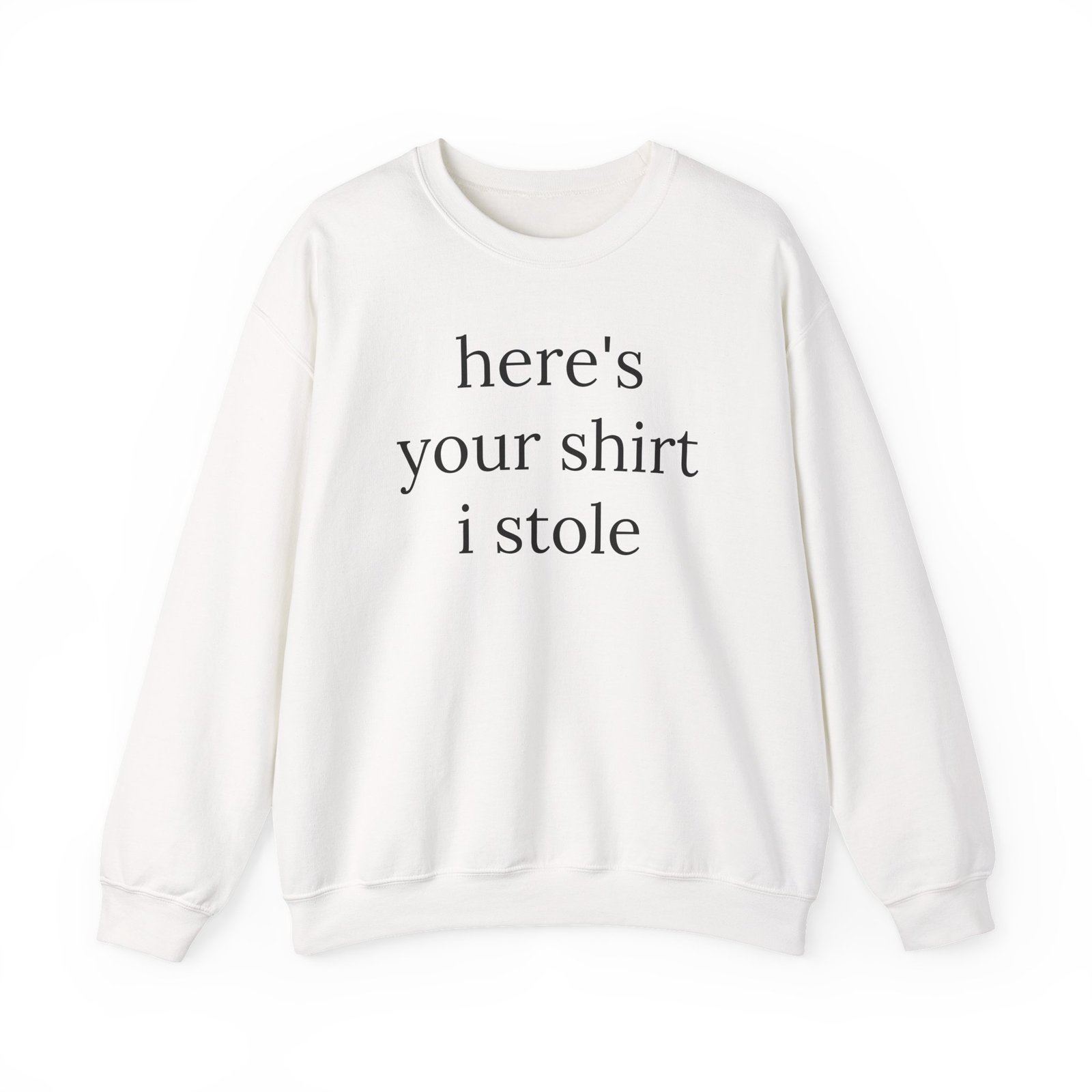 Ideal for any situation, a Lizzy Mcalpine Here's Your Shirt I Stole unisex heavy blend crewneck sweatshirt is pure comfort. These garments are made from polyester and cotton. This combination helps designs come out looking fresh and beautiful. The collar is ribbed knit, so it retains its shape even after washing. There are no itchy side seams on these sweaters.