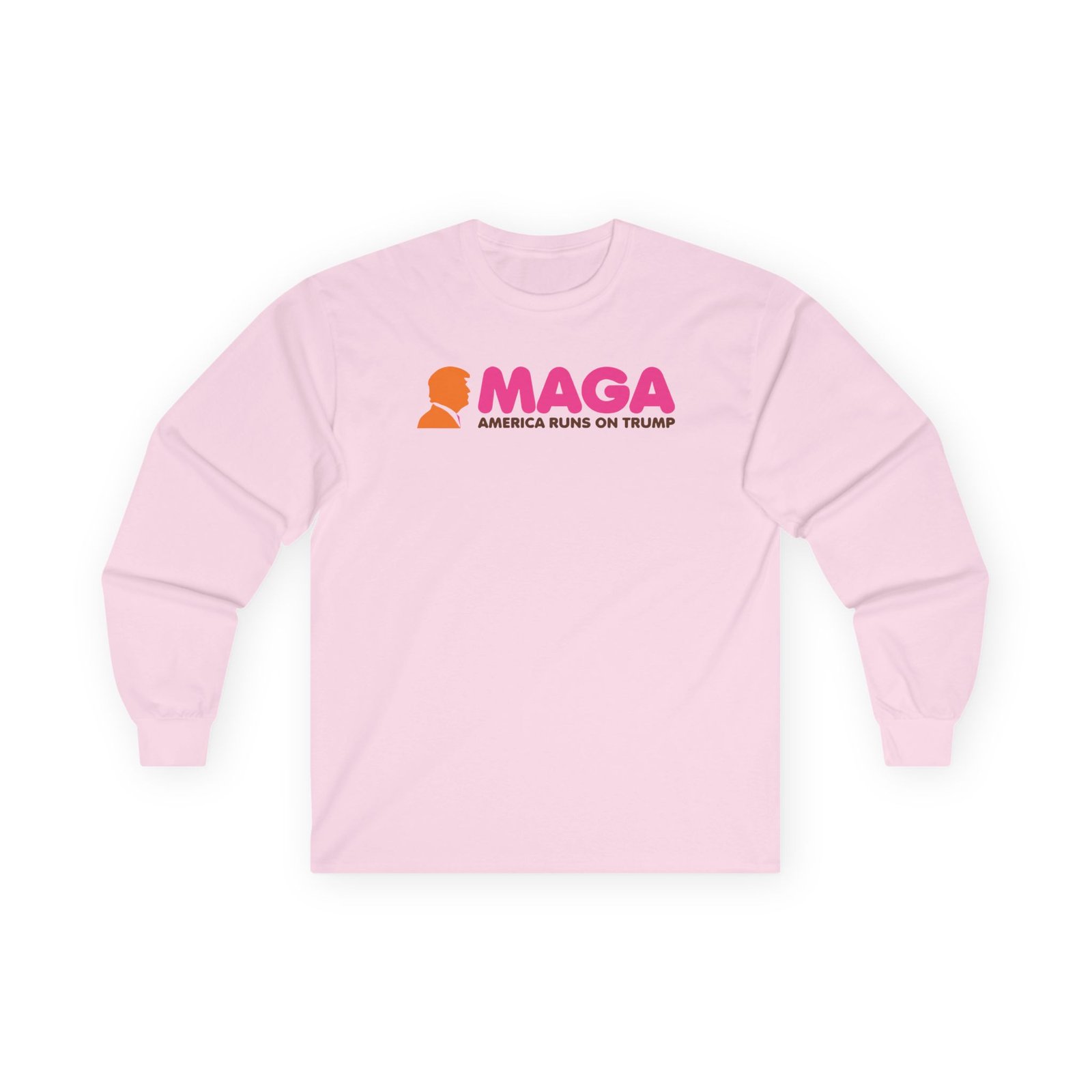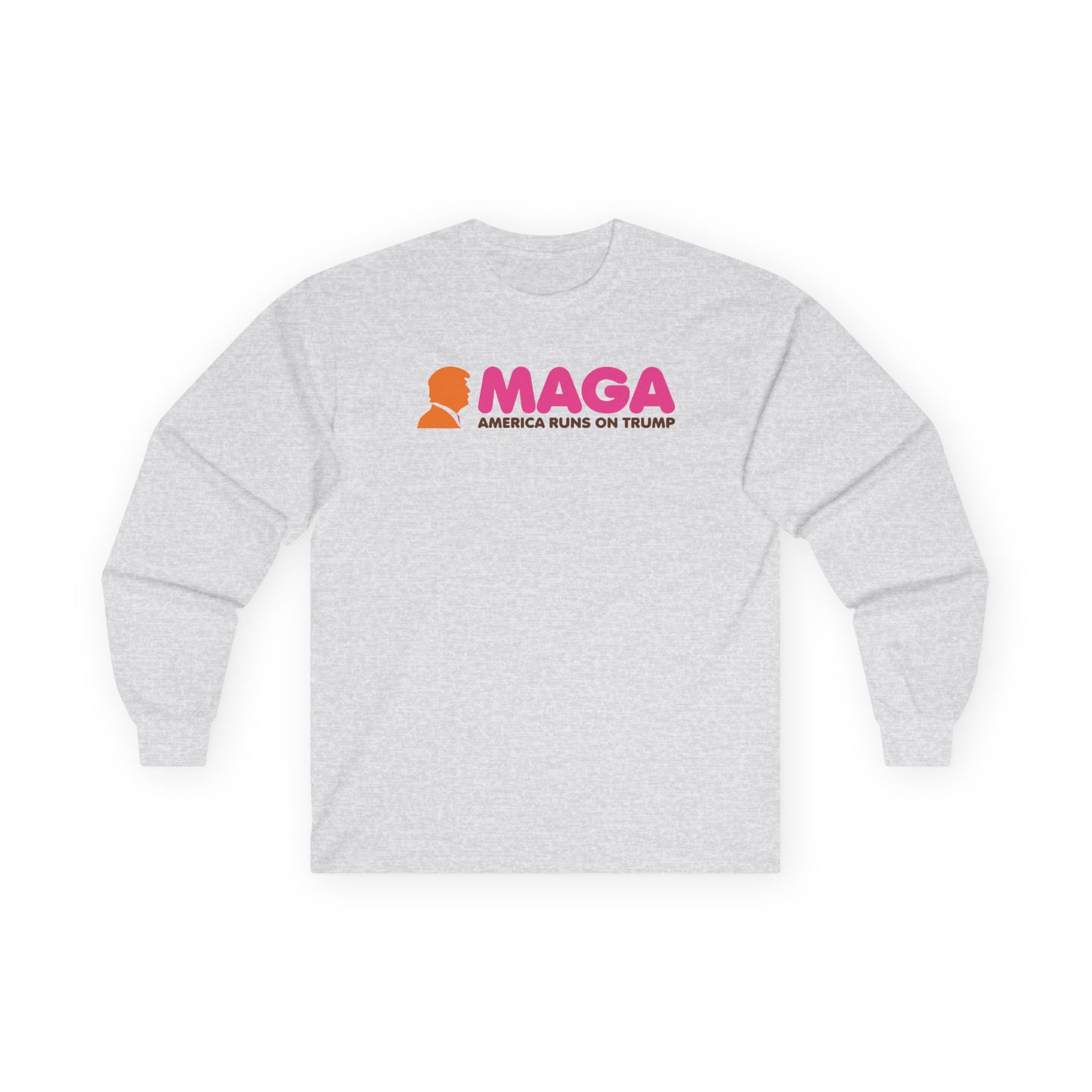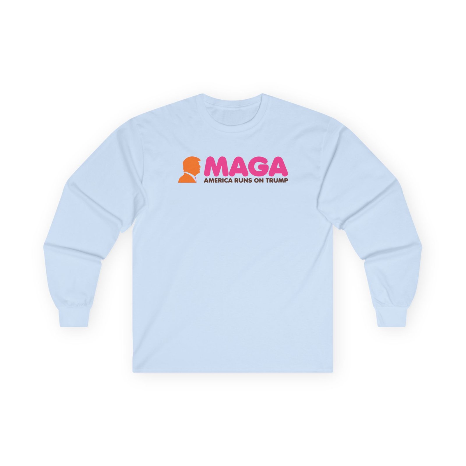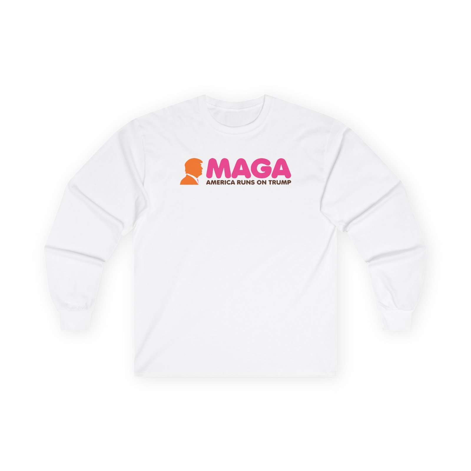 A bit more formal than a standard-issue t-shirt, the Louder With Crowder America Runs on Trump ultra cotton long sleeve tee is a clear comfort winner. The sleeves also act as a nice frame. There are no side seams. The shoulders are taped for improved durability. This makes for a good fitting around the shoulders and neck. The cotton used for these shirts is environmentally friendly.