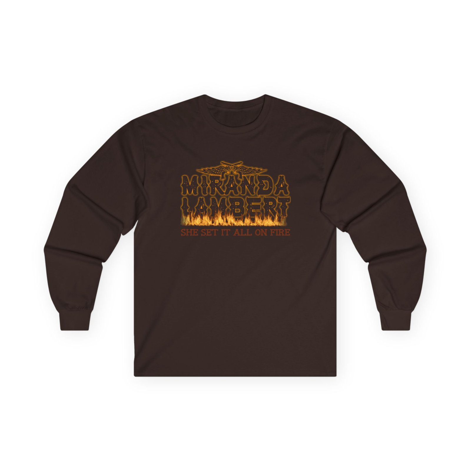 A bit more formal than a standard-issue t-shirt, the Miranda Lambert Set It All on Fire ultra cotton long sleeve tee is a clear comfort winner. The sleeves also act as a nice frame. There are no side seams. The shoulders are taped for improved durability. This makes for a good fitting around the shoulders and neck. The cotton used for these shirts is environmentally friendly.