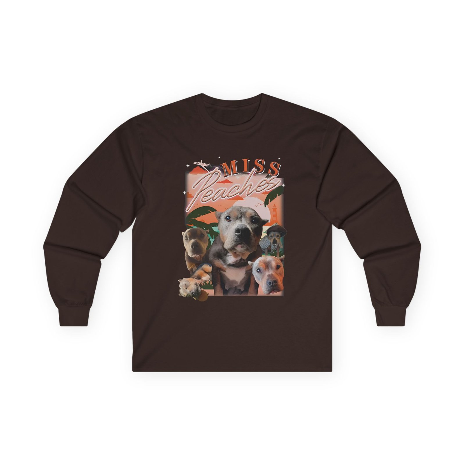 A bit more formal than a standard-issue t-shirt, the Miss Peaches Faces ultra cotton long sleeve tee is a clear comfort winner. The sleeves also act as a nice frame. There are no side seams. The shoulders are taped for improved durability. This makes for a good fitting around the shoulders and neck. The cotton used for these shirts is environmentally friendly.