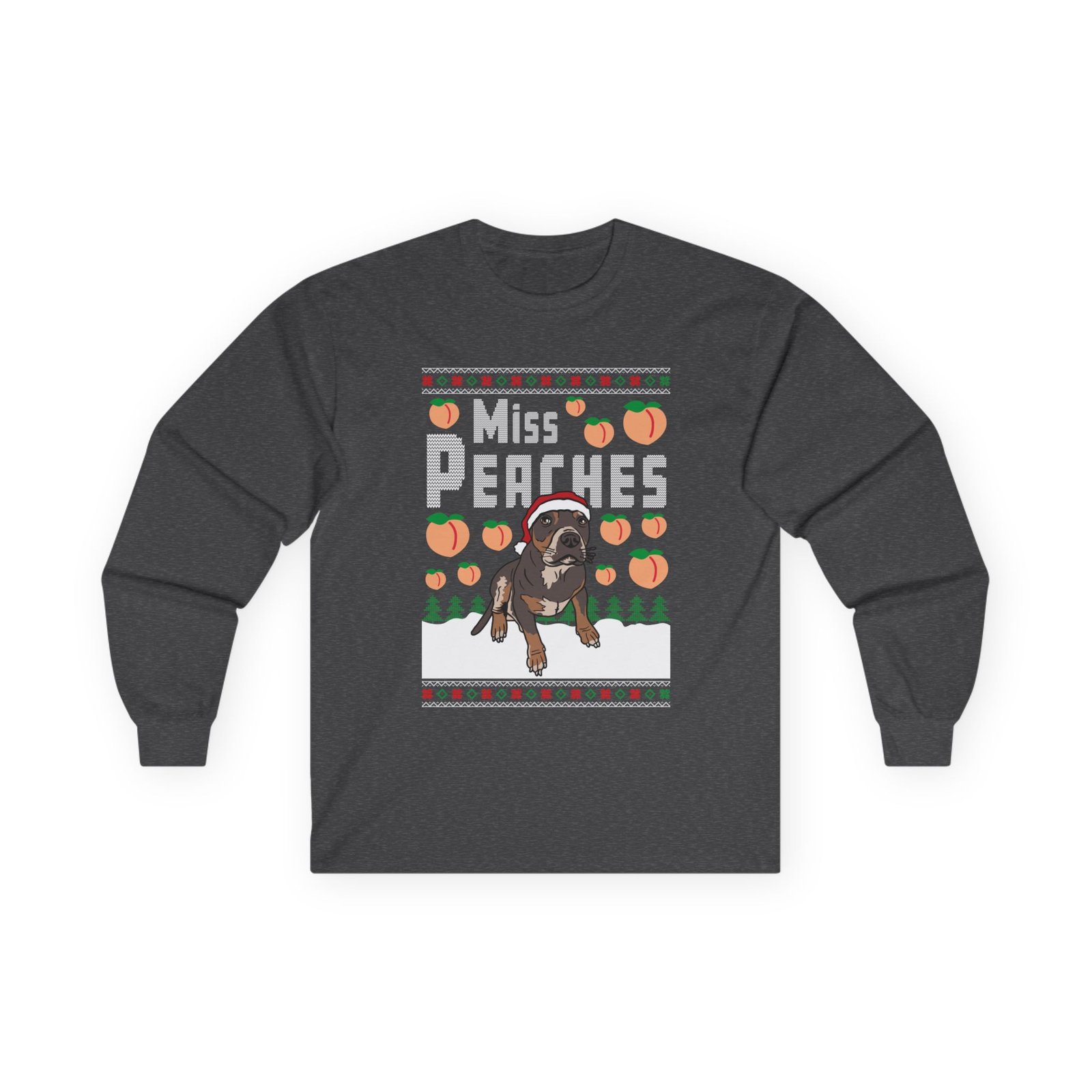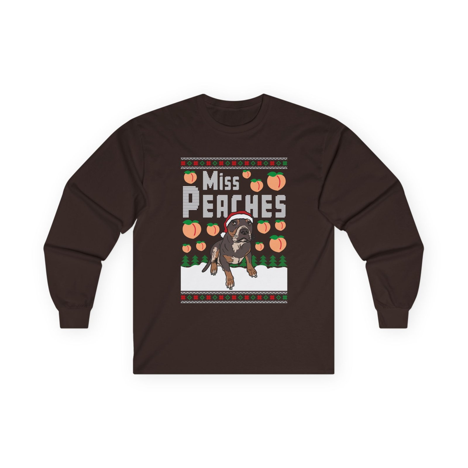 A bit more formal than a standard-issue t-shirt, the Miss Peaches Ugly Christmas ultra cotton long sleeve tee is a clear comfort winner. The sleeves also act as a nice frame. There are no side seams. The shoulders are taped for improved durability. This makes for a good fitting around the shoulders and neck. The cotton used for these shirts is environmentally friendly.