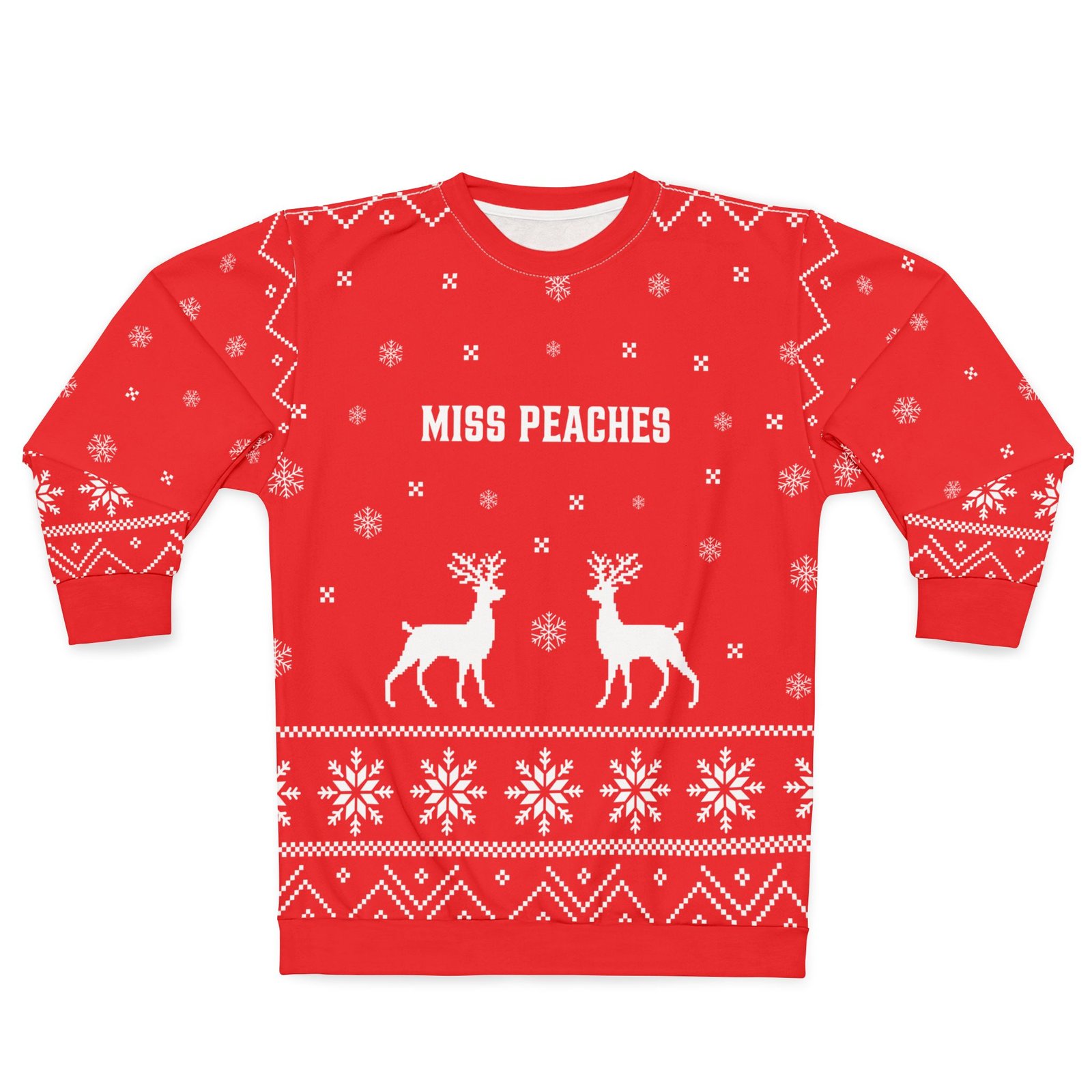 This all over print Miss Peaches crewneck sweatshirt is the perfect example of cool. With quality all-over printing capabilities, you won’t be worried about white lines at the seams. This fleece is custom cut and sewn, featuring a crew neck and set-in sleeves to keep you warm.