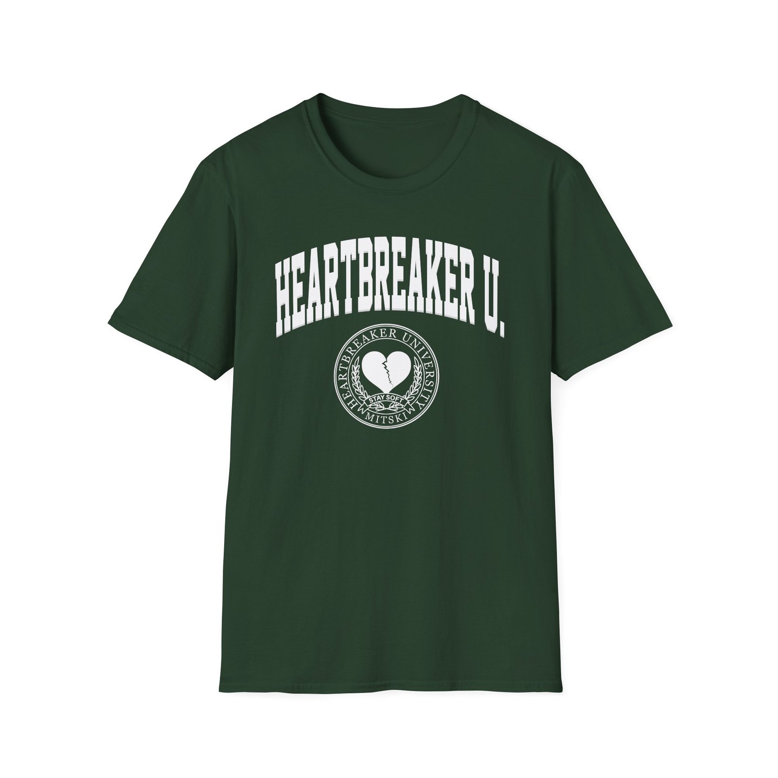 The Mitski Heartbreaker University unisex soft-style t-shirt puts a new spin on casual comfort. Made from very soft materials, this tee is 100% cotton for solid colors. Heather colors and sports grey include polyester. The shoulders have twill tape for improved durability. There are no side seams. The collar is made with ribbed knitting to prevent curling damage.
