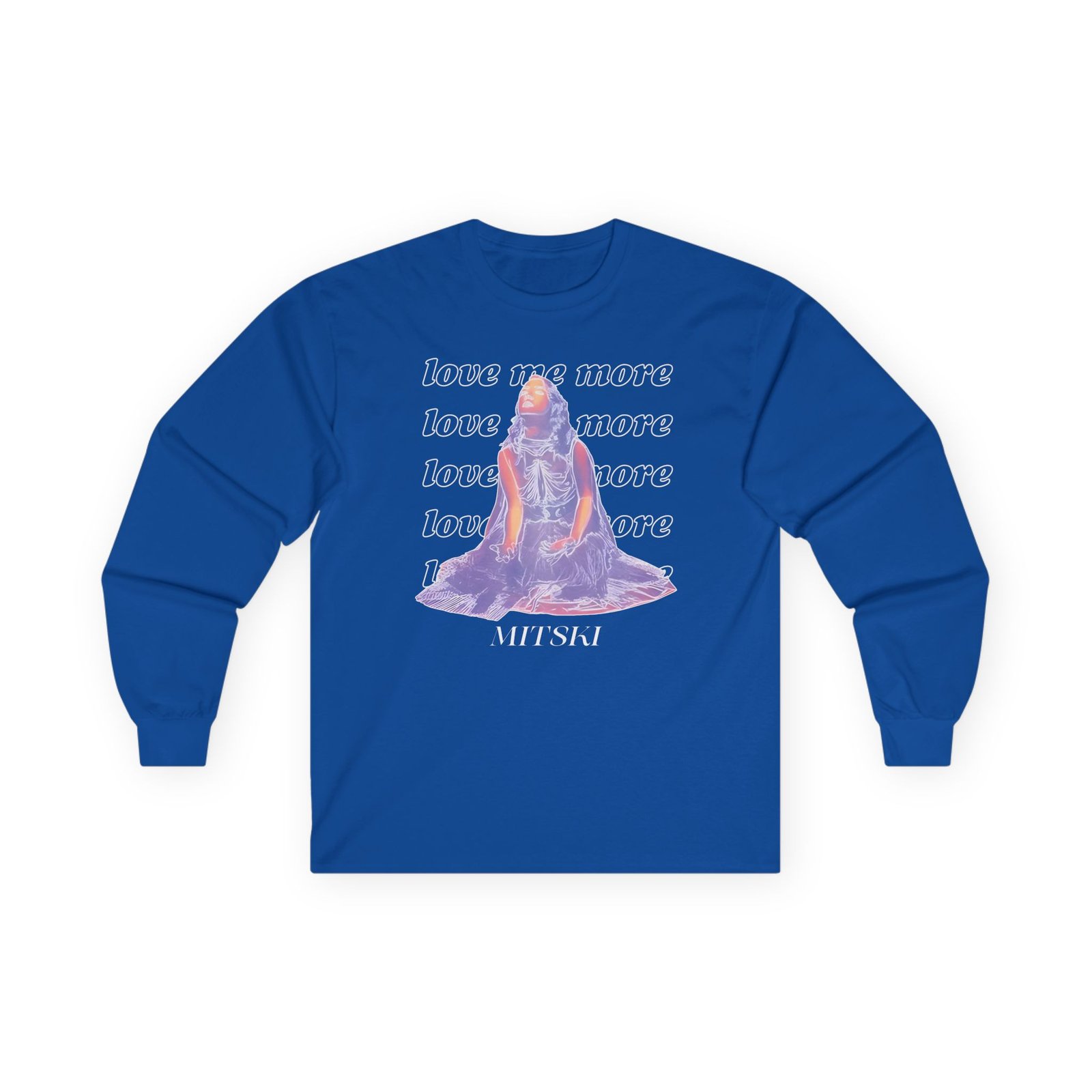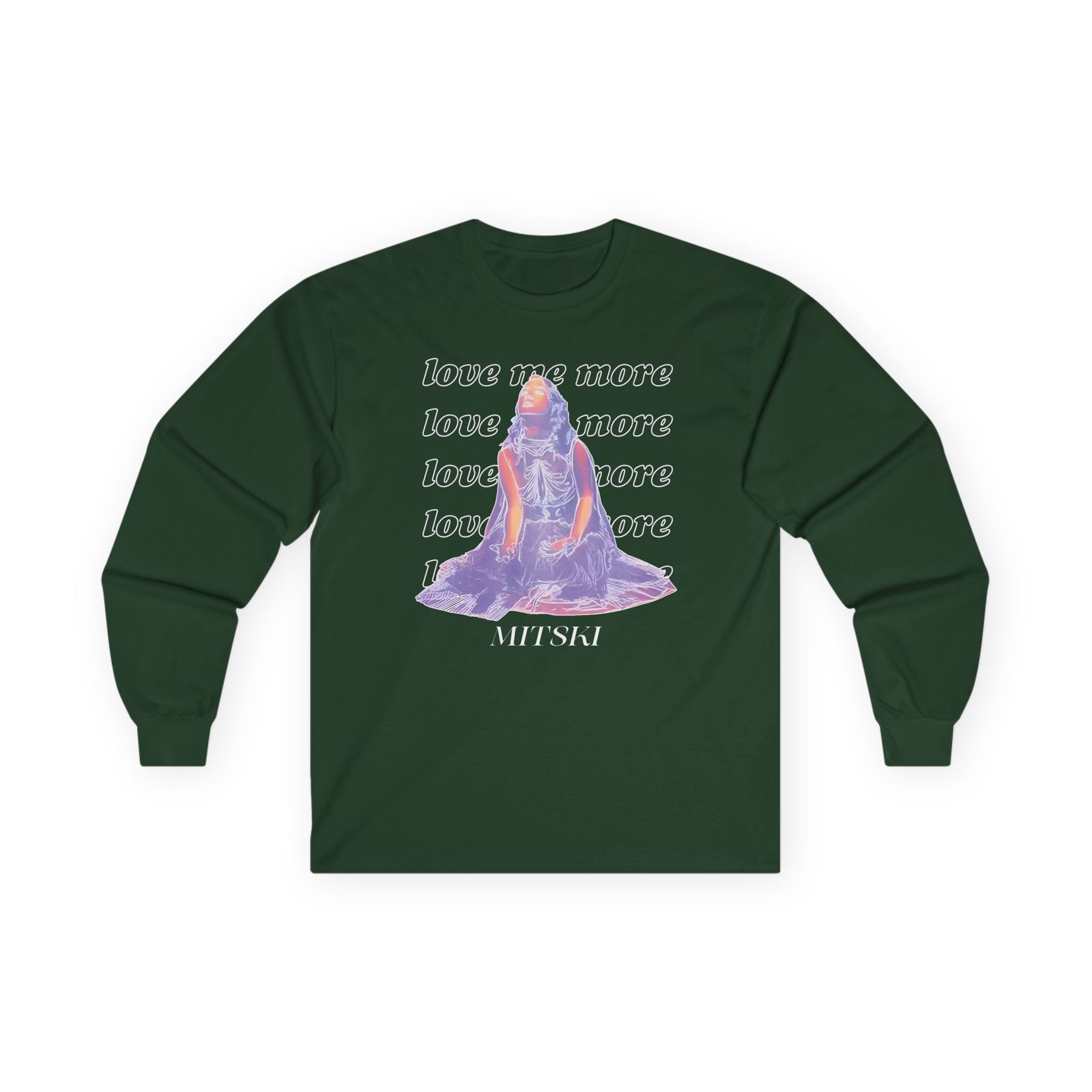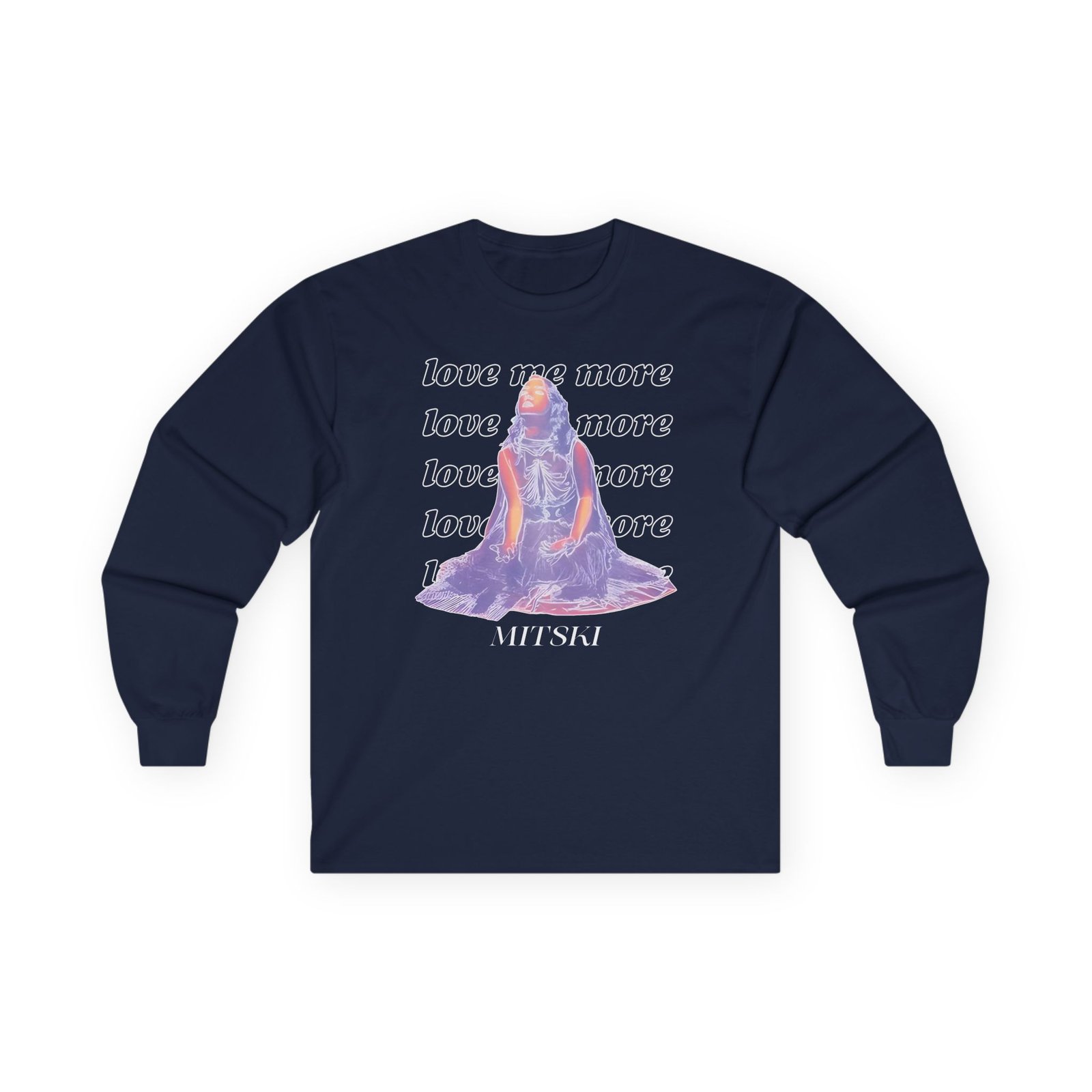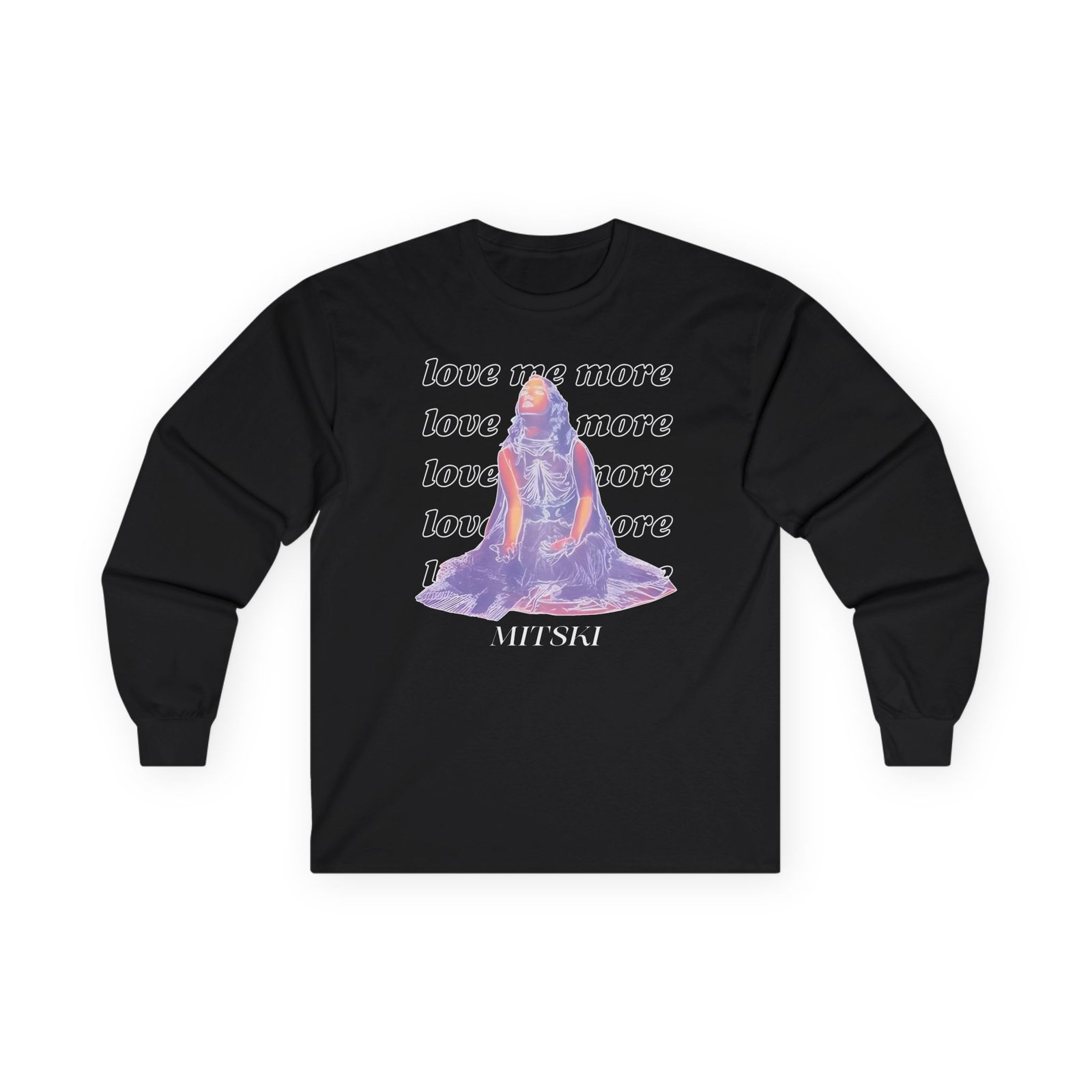 A bit more formal than a standard-issue t-shirt, the Mitski Love Me More ultra cotton long sleeve tee is a clear comfort winner. The sleeves also act as a nice frame. There are no side seams. The shoulders are taped for improved durability. This makes for a good fitting around the shoulders and neck. The cotton used for these shirts is environmentally friendly.