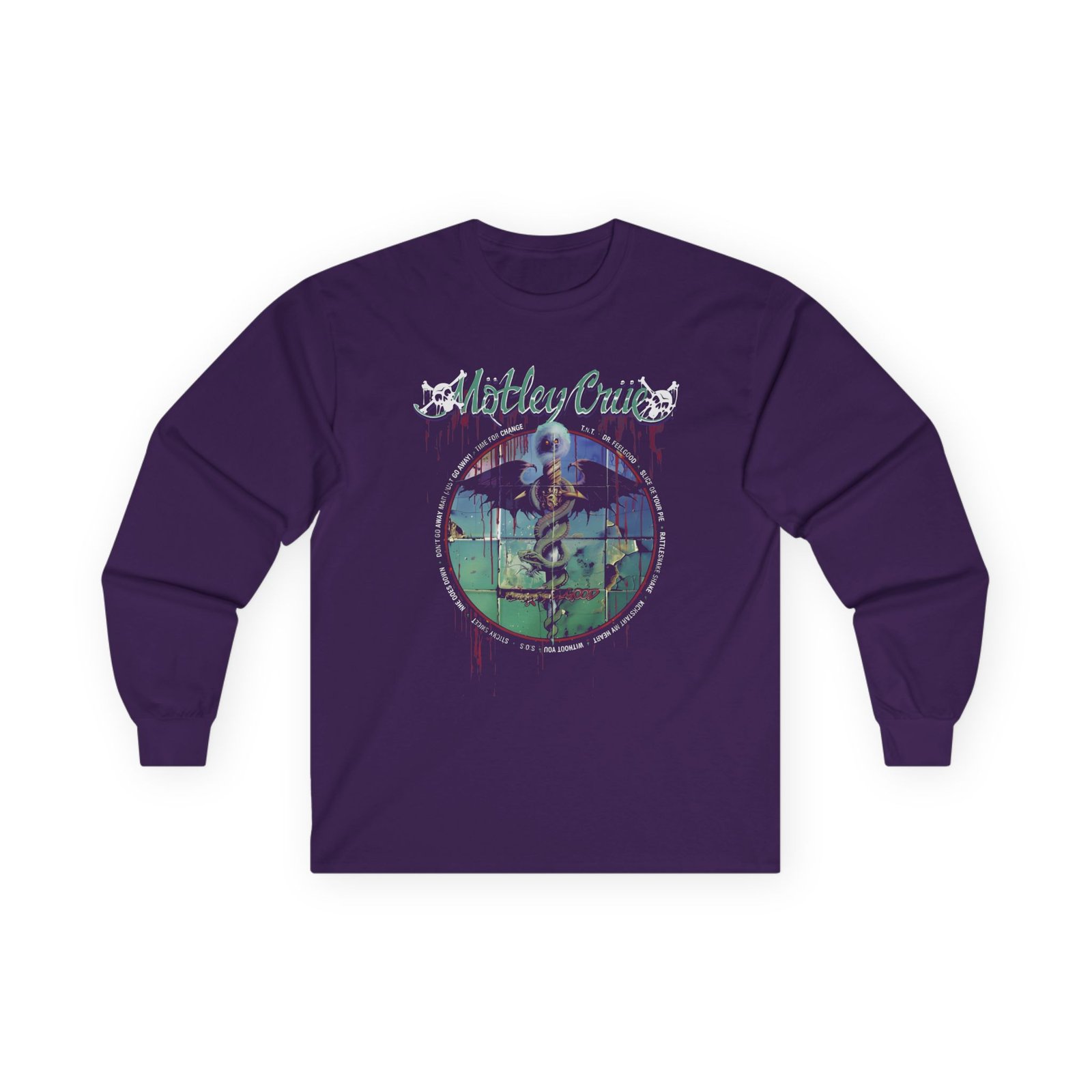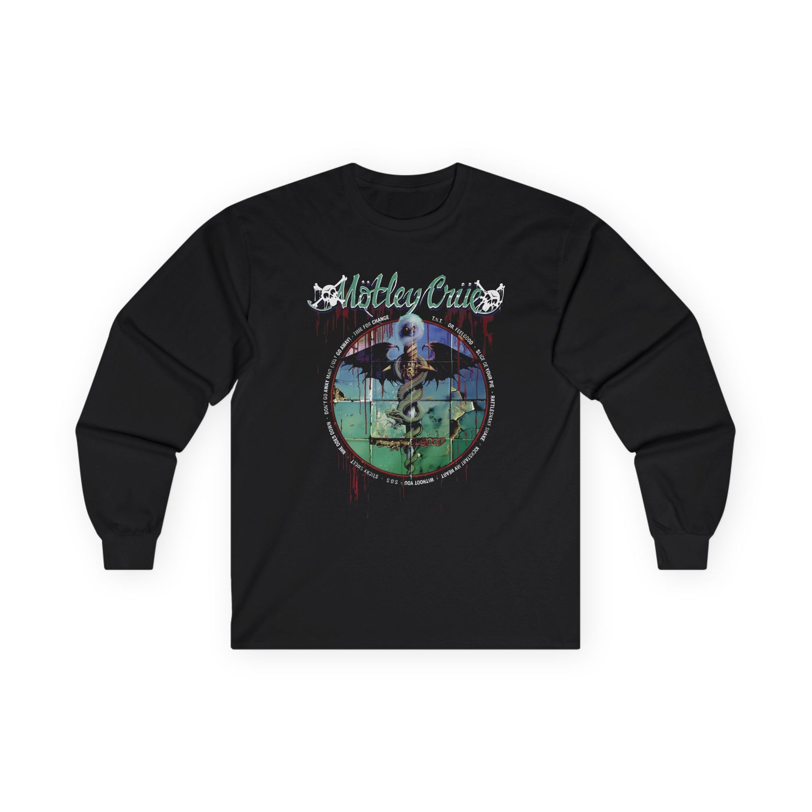 A bit more formal than a standard-issue t-shirt, the Motley Crue 35th Anniversary ultra cotton long sleeve tee is a clear comfort winner. The sleeves also act as a nice frame. There are no side seams. The shoulders are taped for improved durability. This makes for a good fitting around the shoulders and neck. The cotton used for these shirts is environmentally friendly.