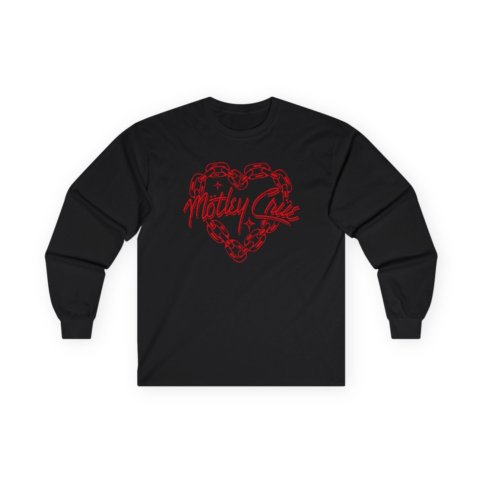 A bit more formal than a standard-issue t-shirt, the Motley Crue Chain Heart ultra cotton long sleeve tee is a clear comfort winner. The sleeves also act as a nice frame. There are no side seams. The shoulders are taped for improved durability. This makes for a good fitting around the shoulders and neck. The cotton used for these shirts is environmentally friendly.