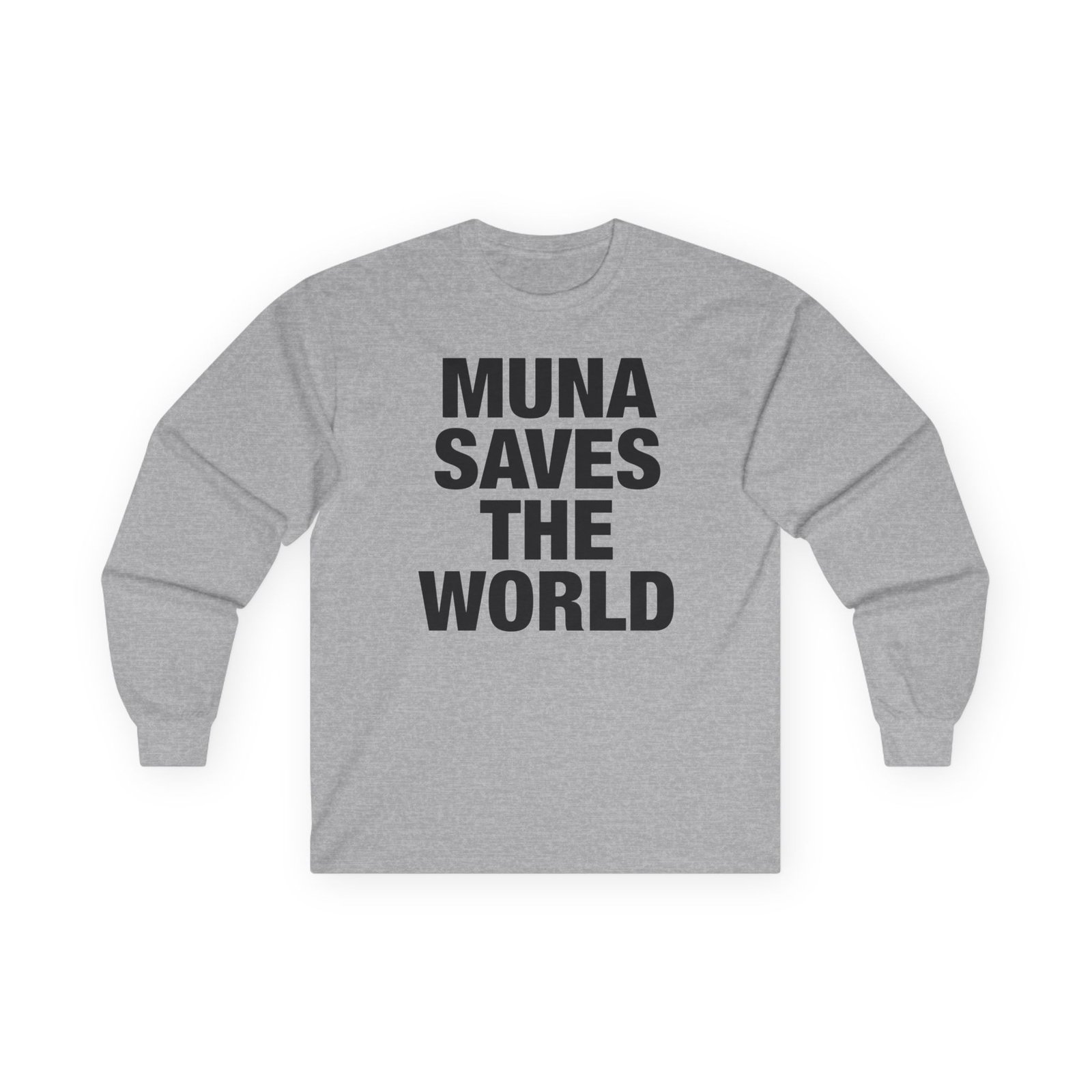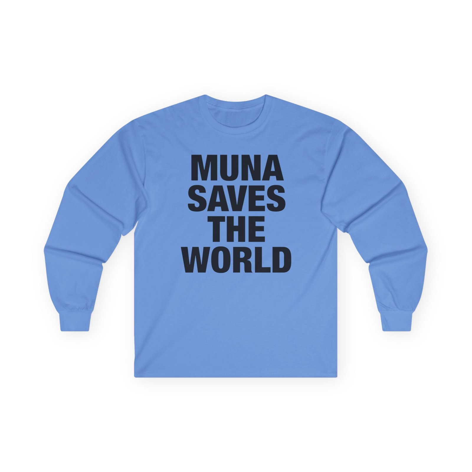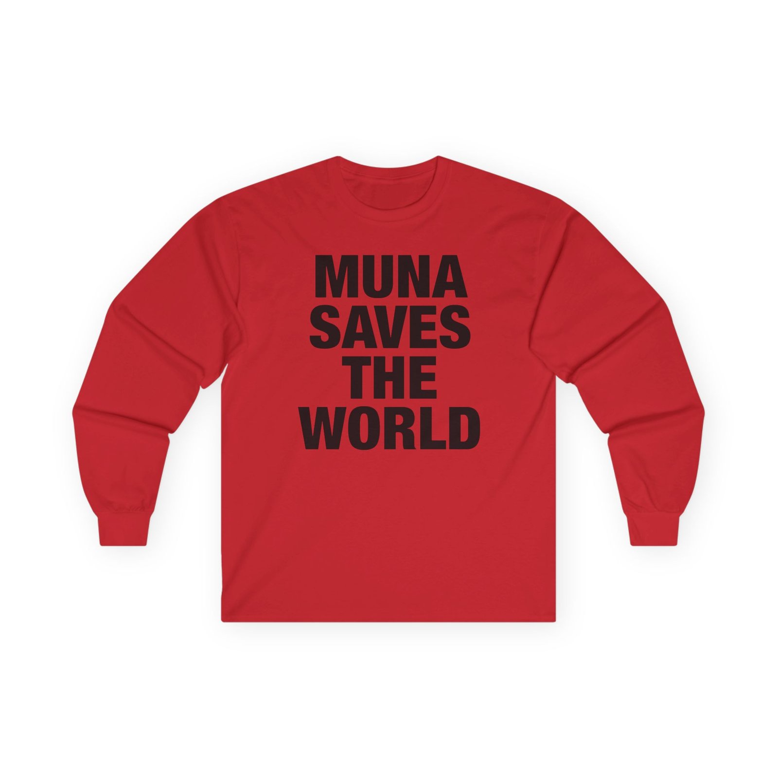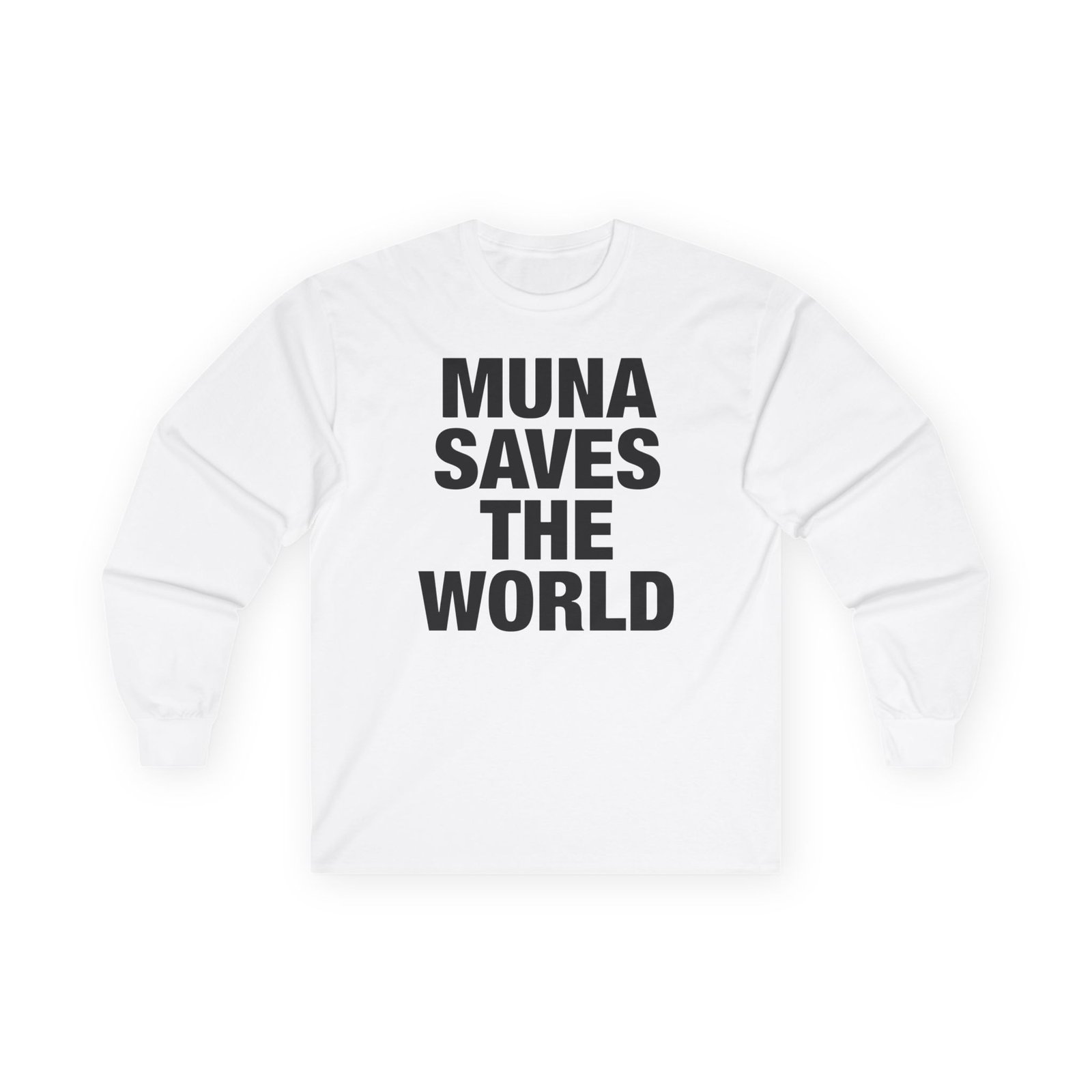 A bit more formal than a standard-issue t-shirt, the Muna Saves the World ultra cotton long sleeve tee is a clear comfort winner. The sleeves also act as a nice frame. There are no side seams. The shoulders are taped for improved durability. This makes for a good fitting around the shoulders and neck. The cotton used for these shirts is environmentally friendly.