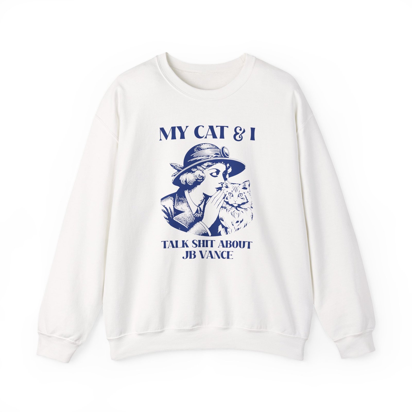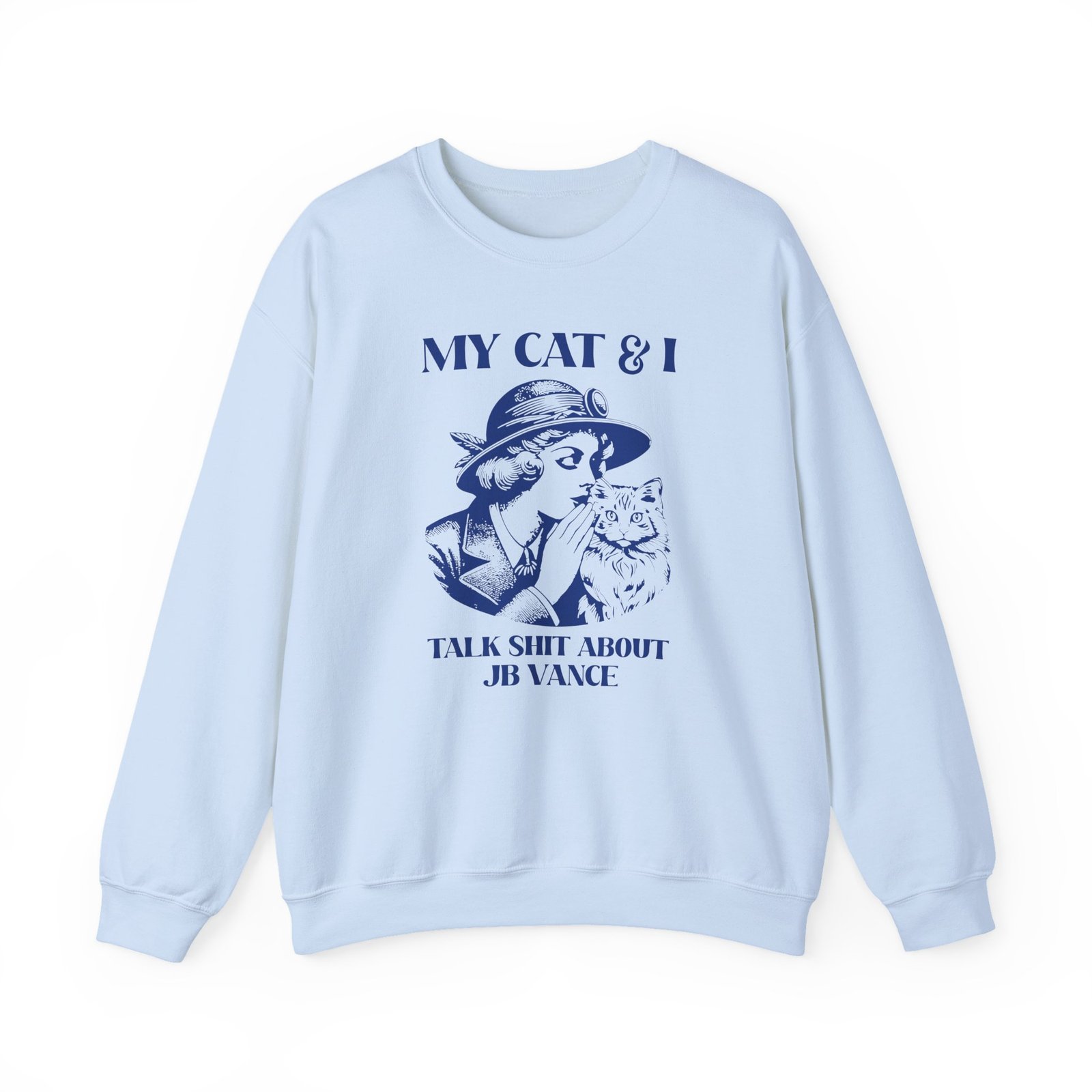 Ideal for any situation, a My Cat and I Talk Shit About Jd Vance unisex heavy blend crewneck sweatshirt is pure comfort. These garments are made from polyester and cotton. This combination helps designs come out looking fresh and beautiful. The collar is ribbed knit, so it retains its shape even after washing. There are no itchy side seams on these sweaters.
