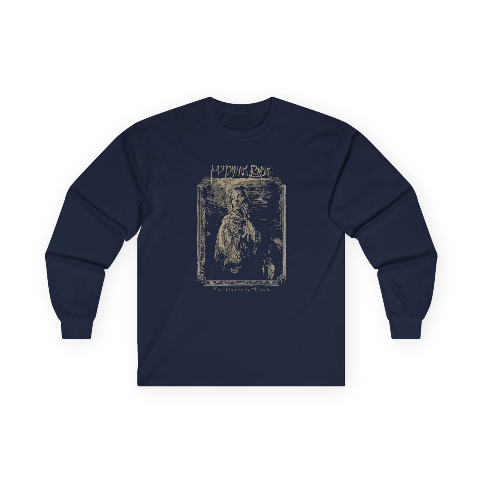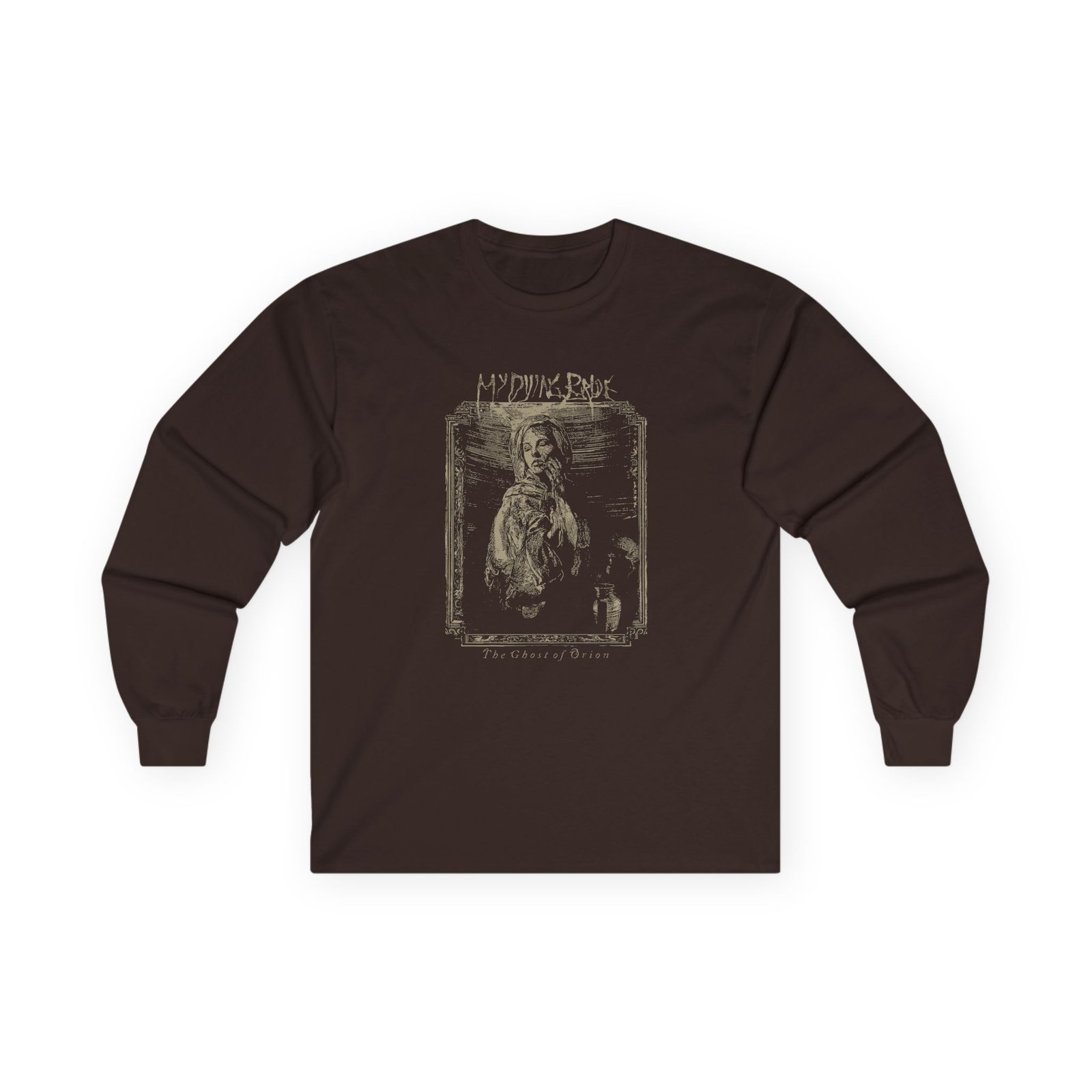 A bit more formal than a standard-issue t-shirt, the My Dying Bride the Ghost of Orion Woodcut ultra cotton long sleeve tee is a clear comfort winner. The sleeves also act as a nice frame. There are no side seams. The shoulders are taped for improved durability. This makes for a good fitting around the shoulders and neck. The cotton used for these shirts is environmentally friendly.