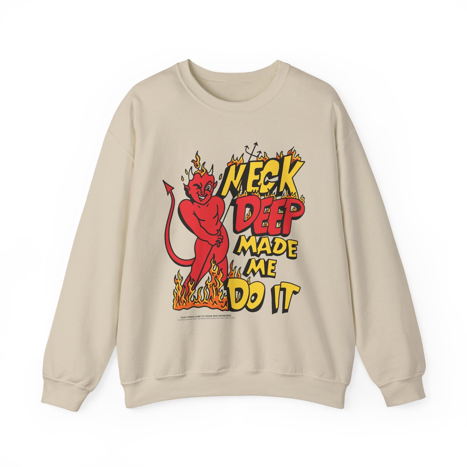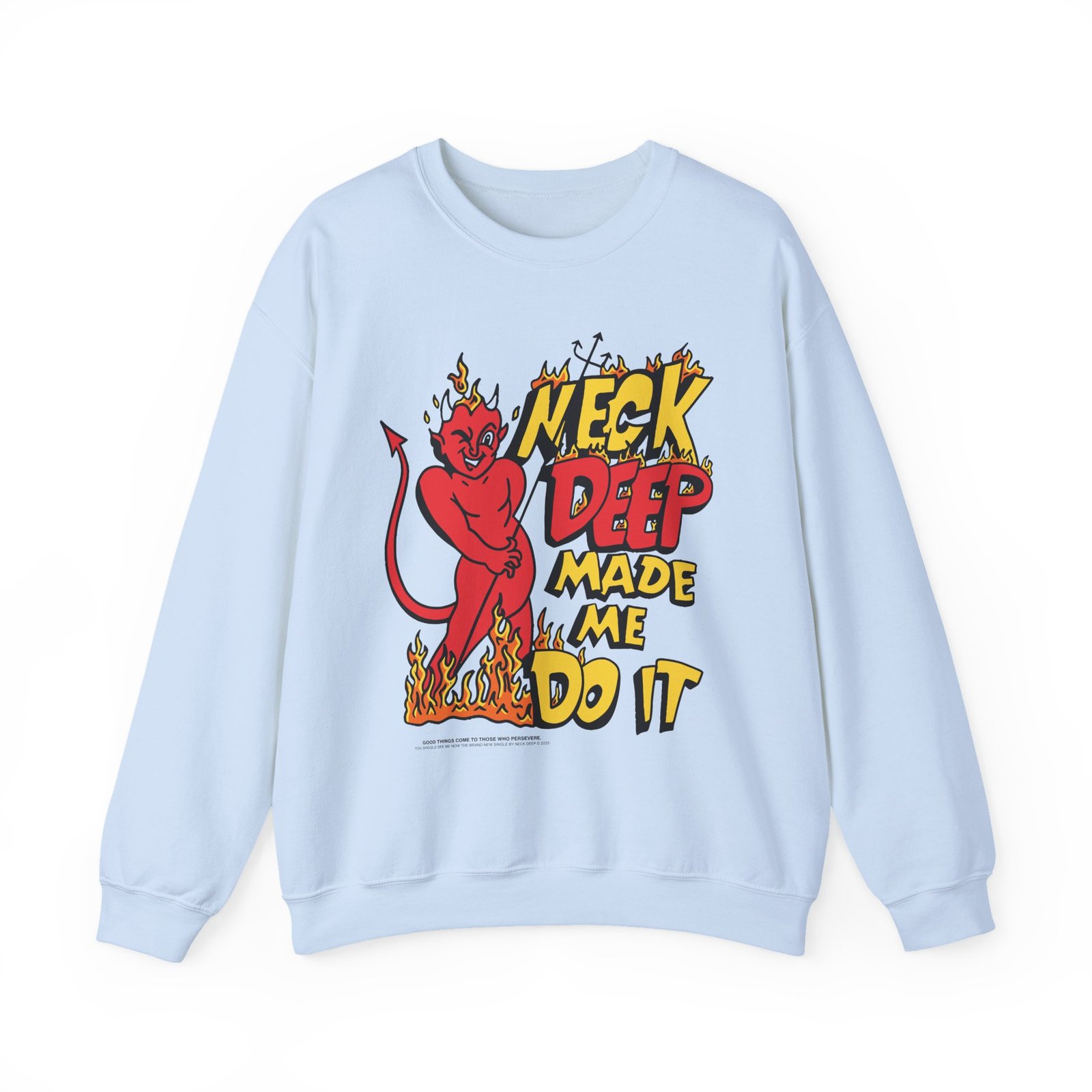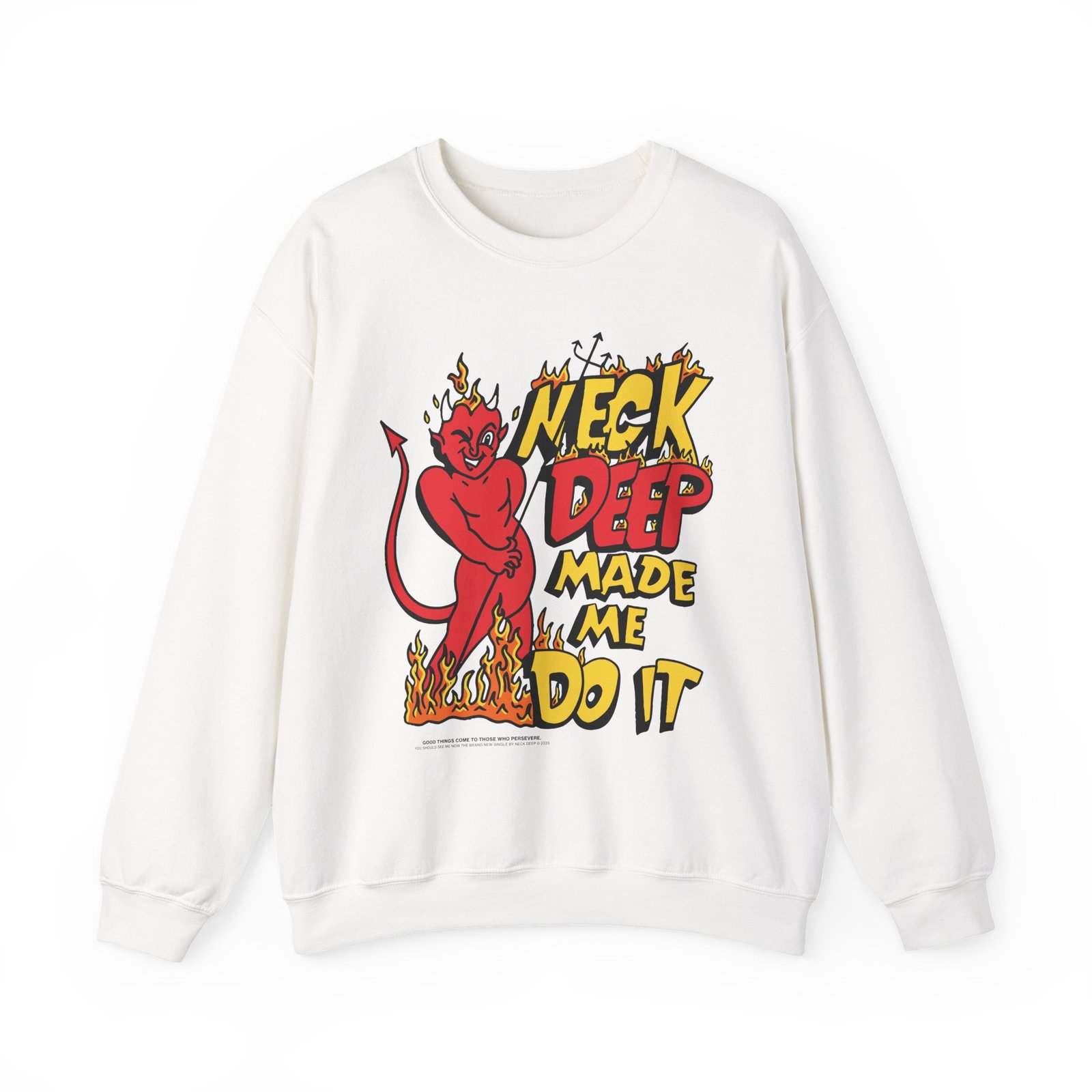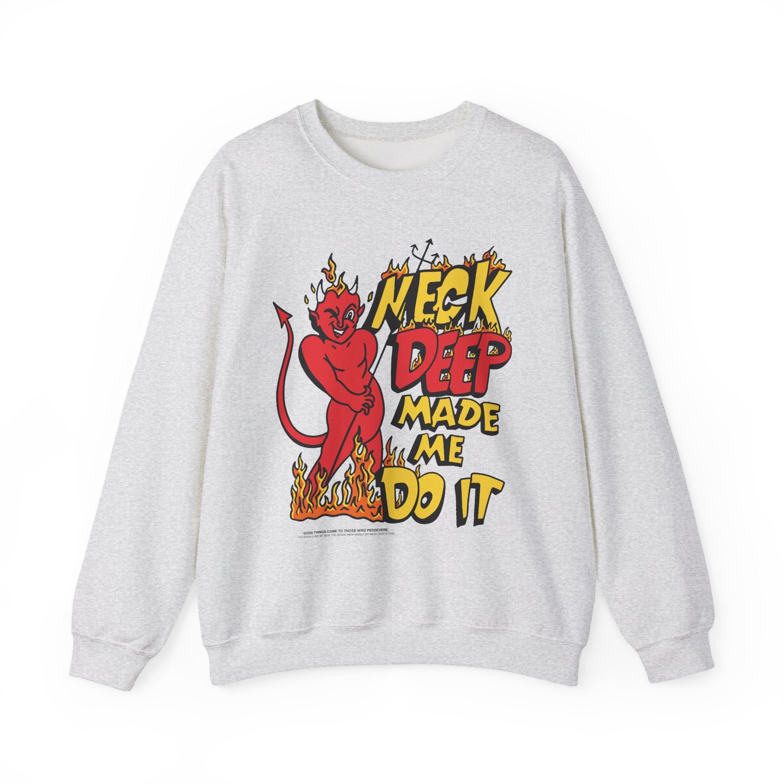 Ideal for any situation, a Neck Deep Made Me Do It unisex heavy blend crewneck sweatshirt is pure comfort. These garments are made from polyester and cotton. This combination helps designs come out looking fresh and beautiful. The collar is ribbed knit, so it retains its shape even after washing. There are no itchy side seams on these sweaters.