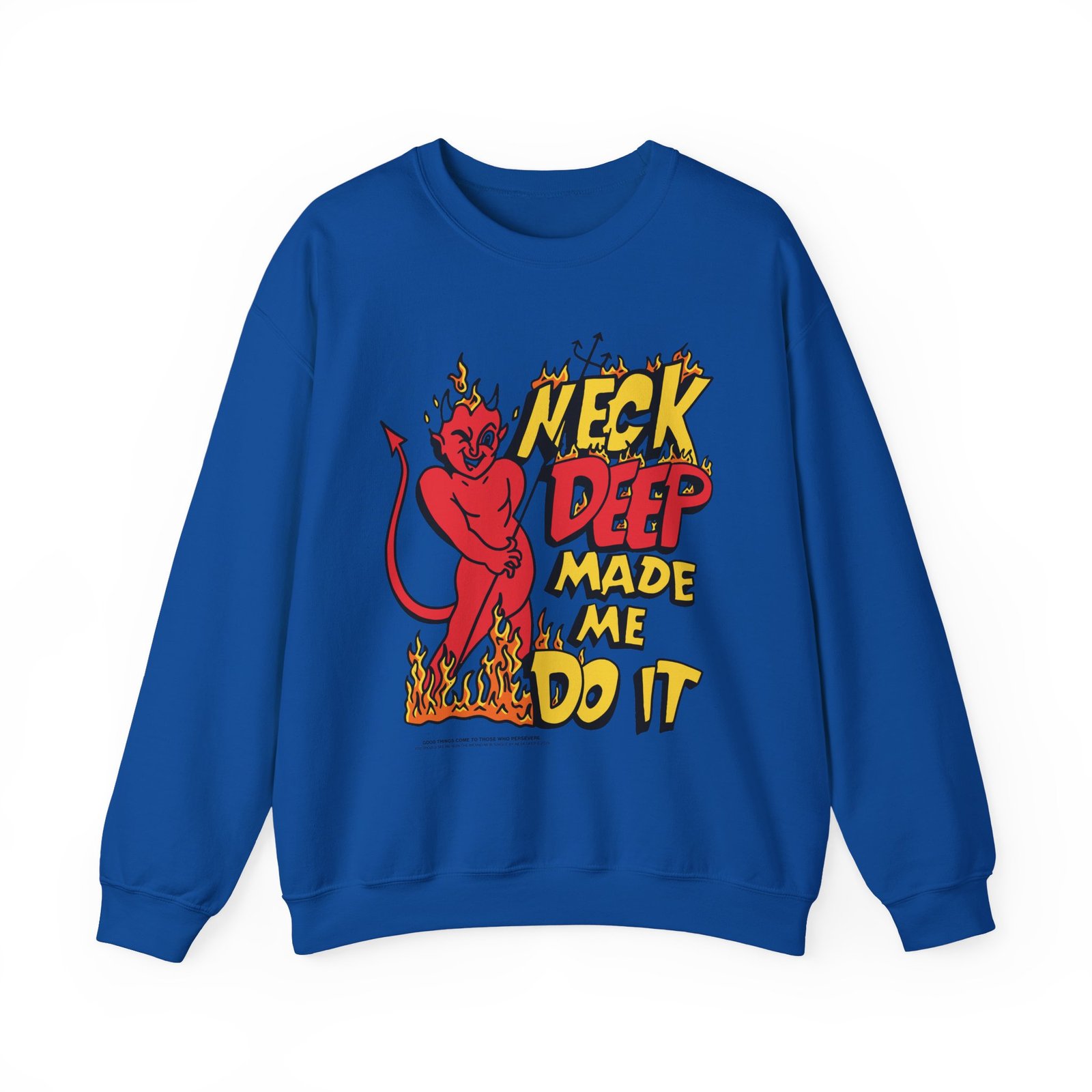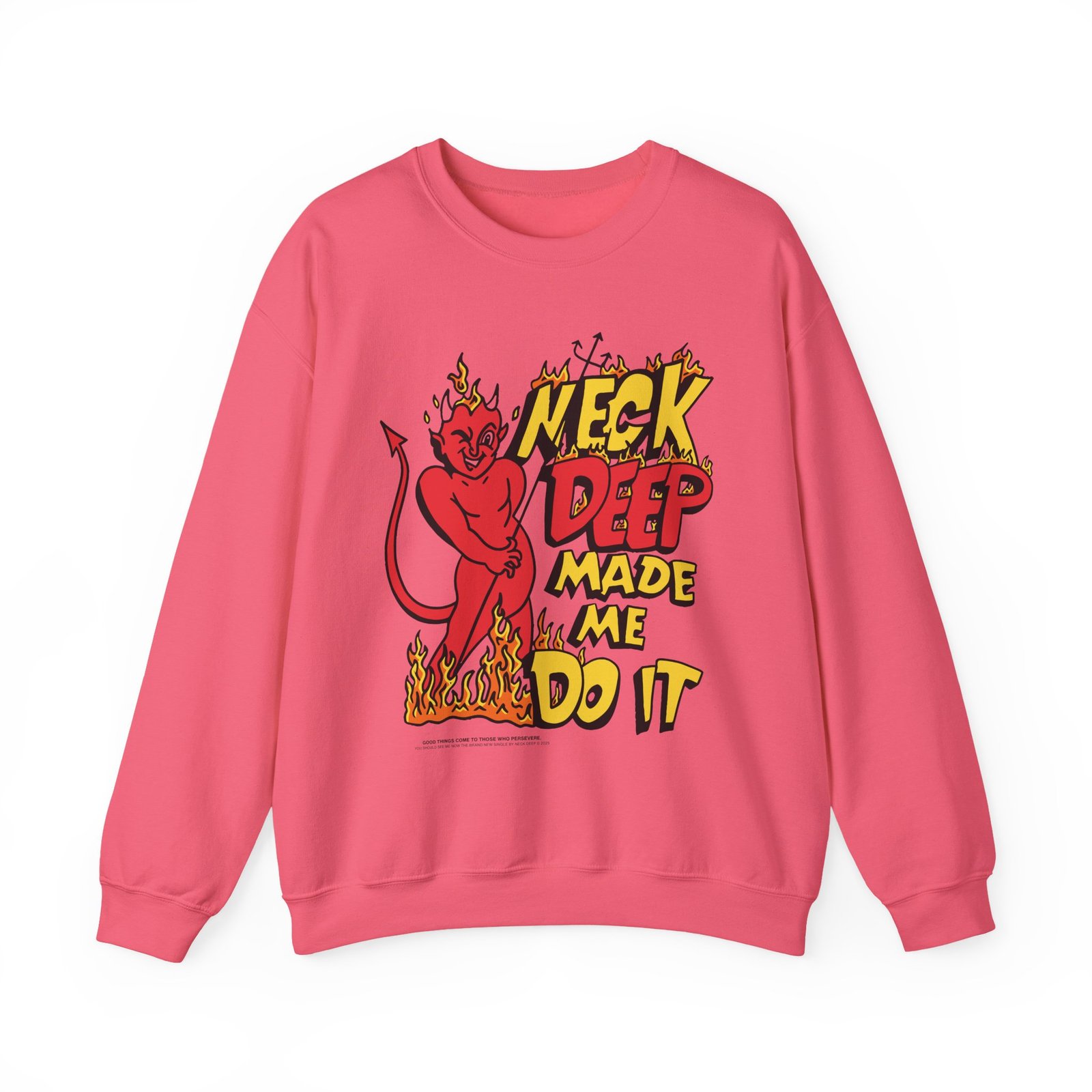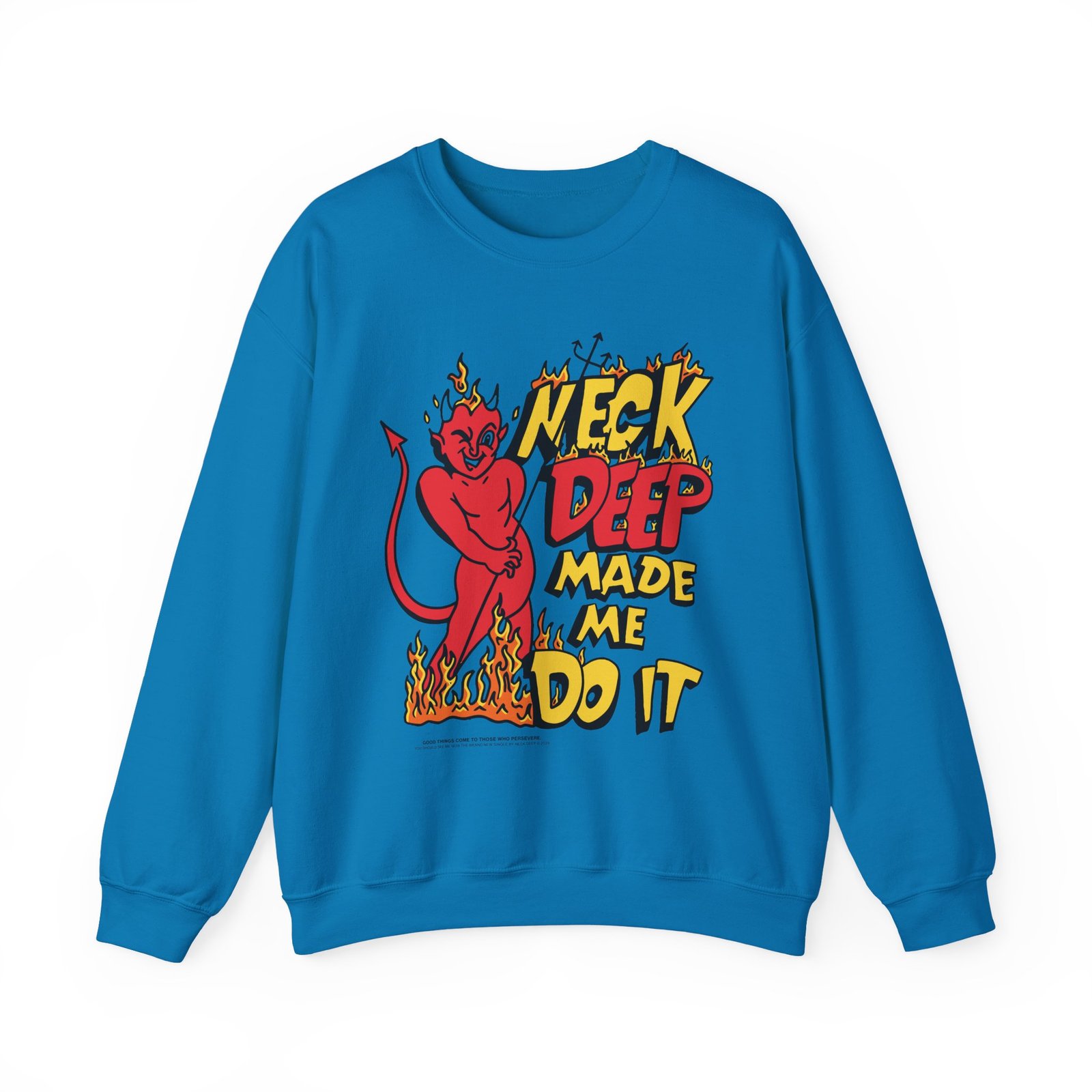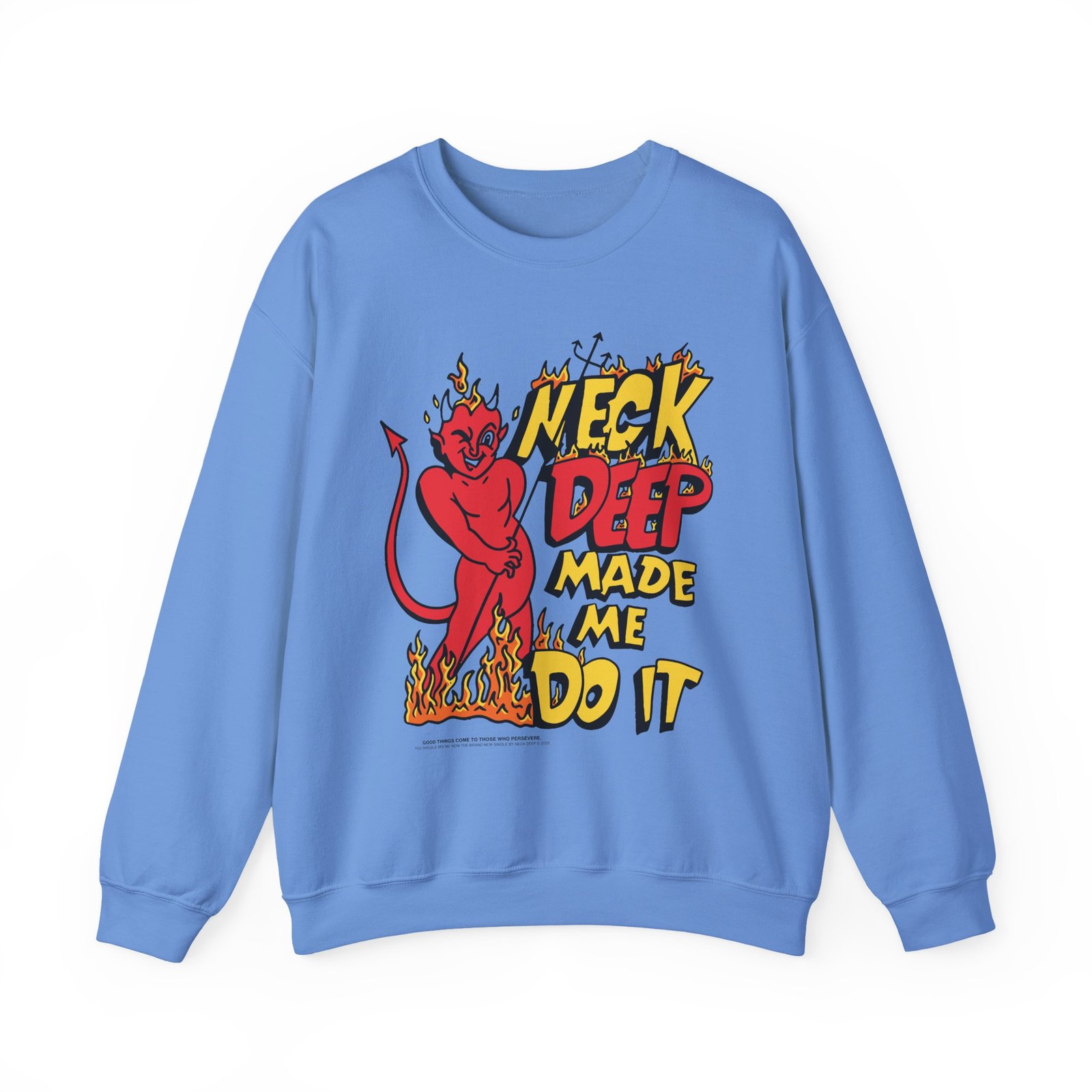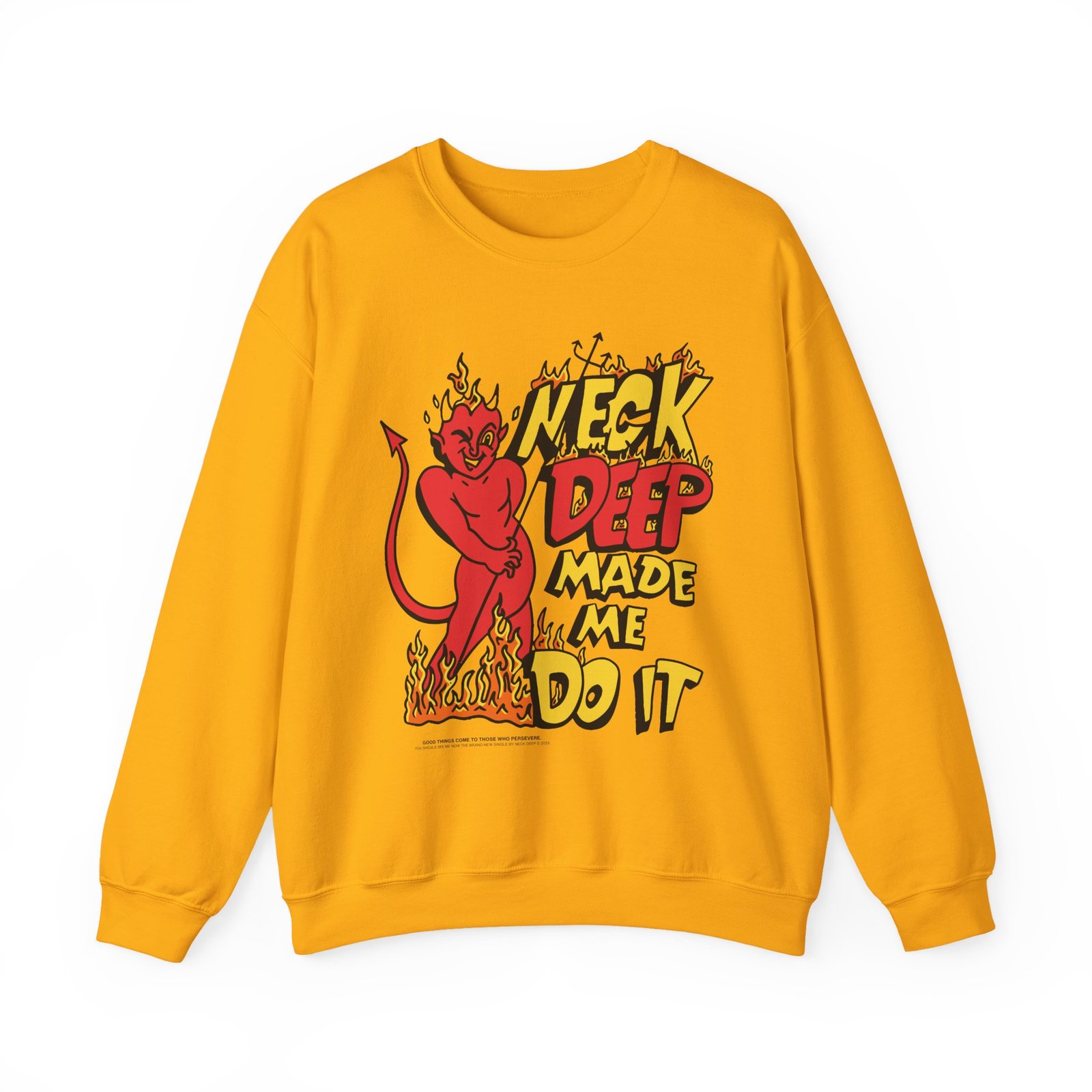 Ideal for any situation, a Neck Deep Made Me Do It unisex heavy blend crewneck sweatshirt is pure comfort. These garments are made from polyester and cotton. This combination helps designs come out looking fresh and beautiful. The collar is ribbed knit, so it retains its shape even after washing. There are no itchy side seams on these sweaters.