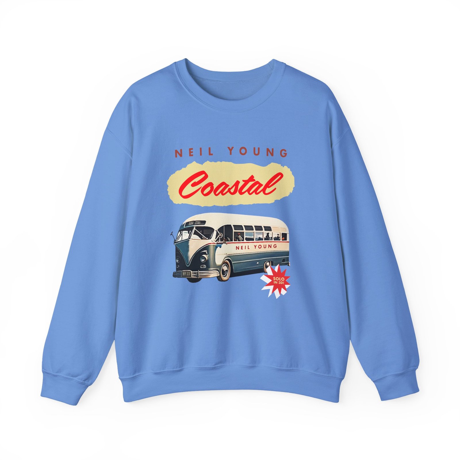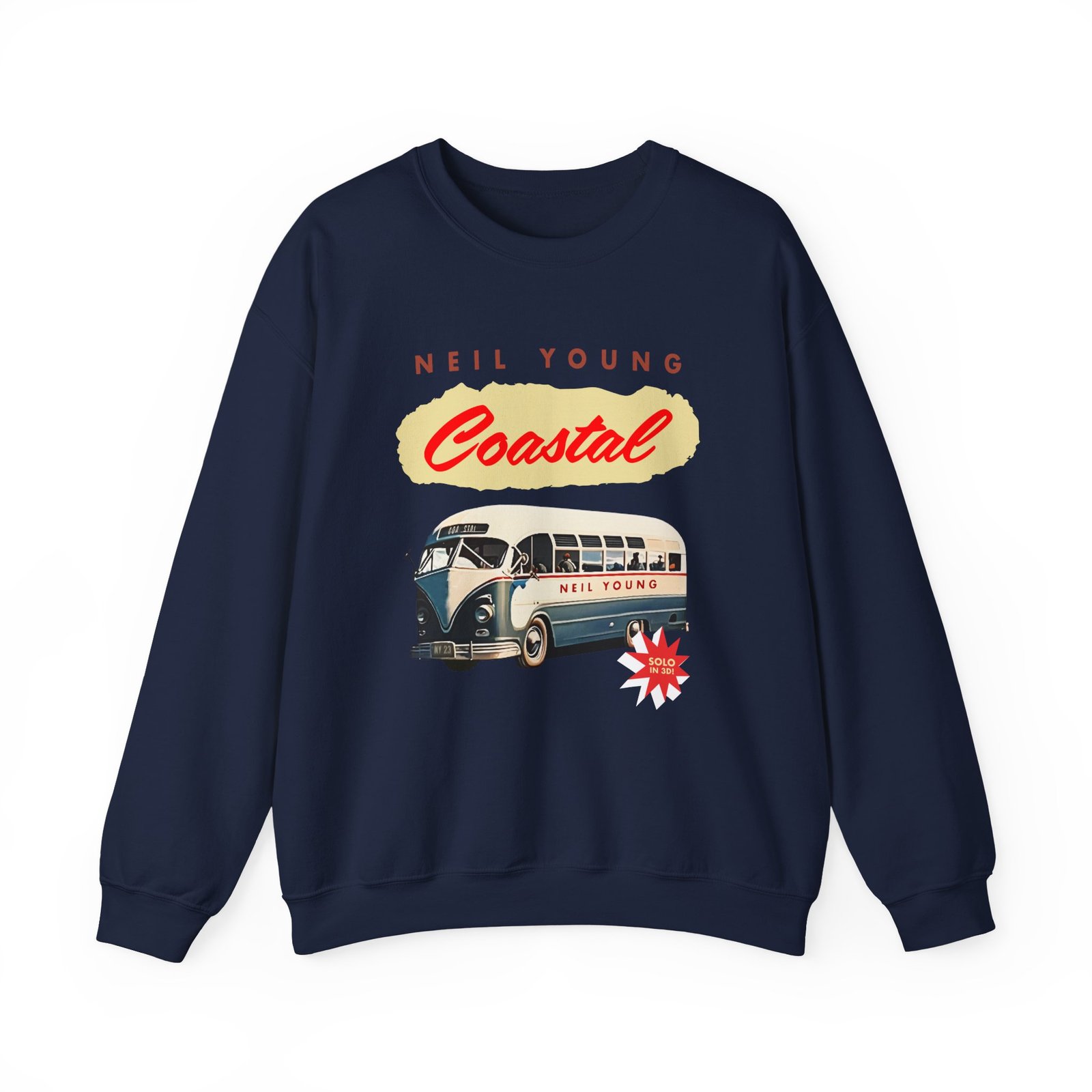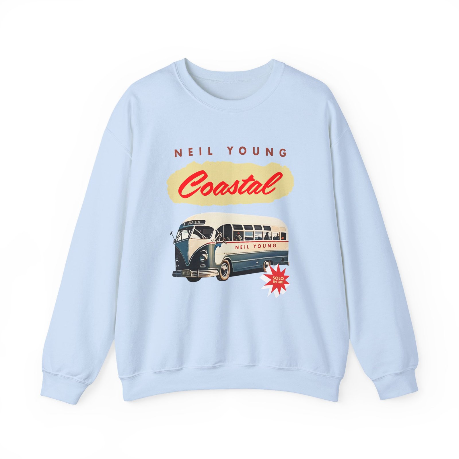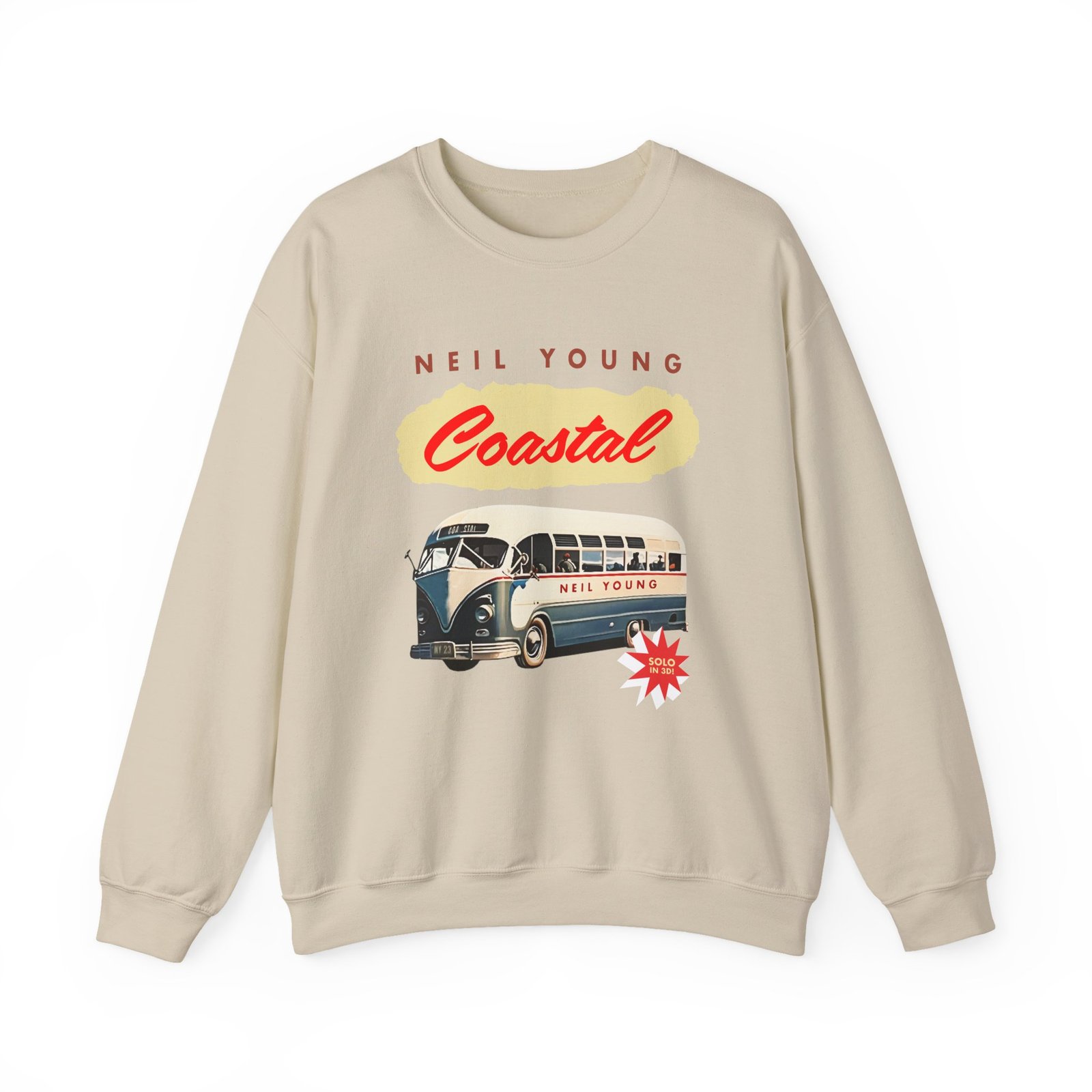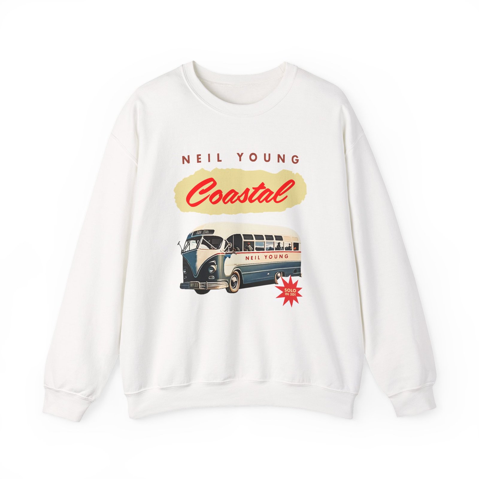 Ideal for any situation, a Neil Young Coastal Bus unisex heavy blend crewneck sweatshirt is pure comfort. These garments are made from polyester and cotton. This combination helps designs come out looking fresh and beautiful. The collar is ribbed knit, so it retains its shape even after washing. There are no itchy side seams on these sweaters.