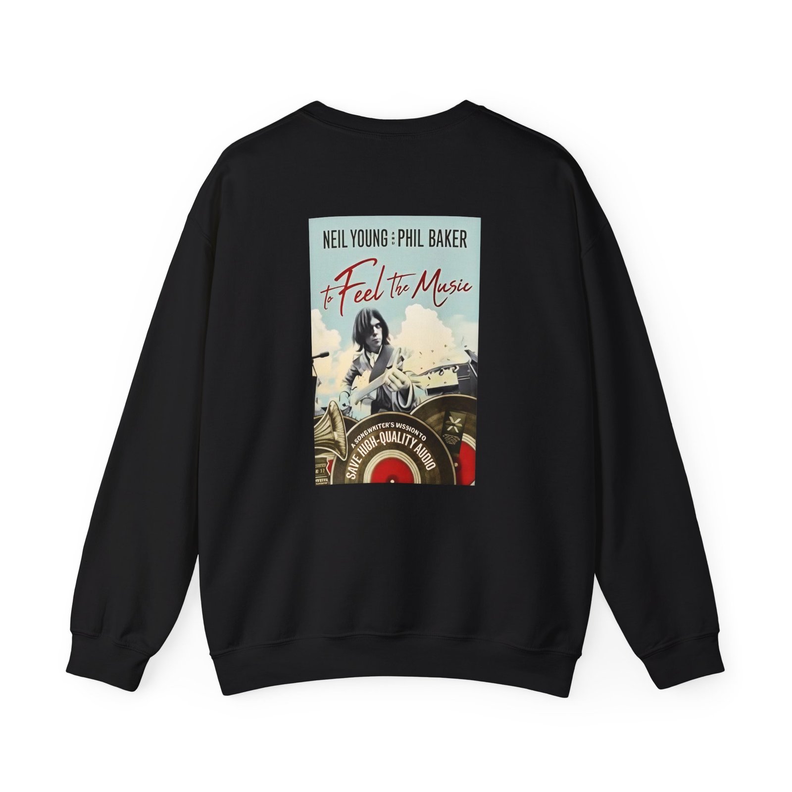 Ideal for any situation, a Neil Young to Feel the Music unisex heavy blend crewneck sweatshirt is pure comfort. These garments are made from polyester and cotton. This combination helps designs come out looking fresh and beautiful. The collar is ribbed knit, so it retains its shape even after washing. There are no itchy side seams on these sweaters.