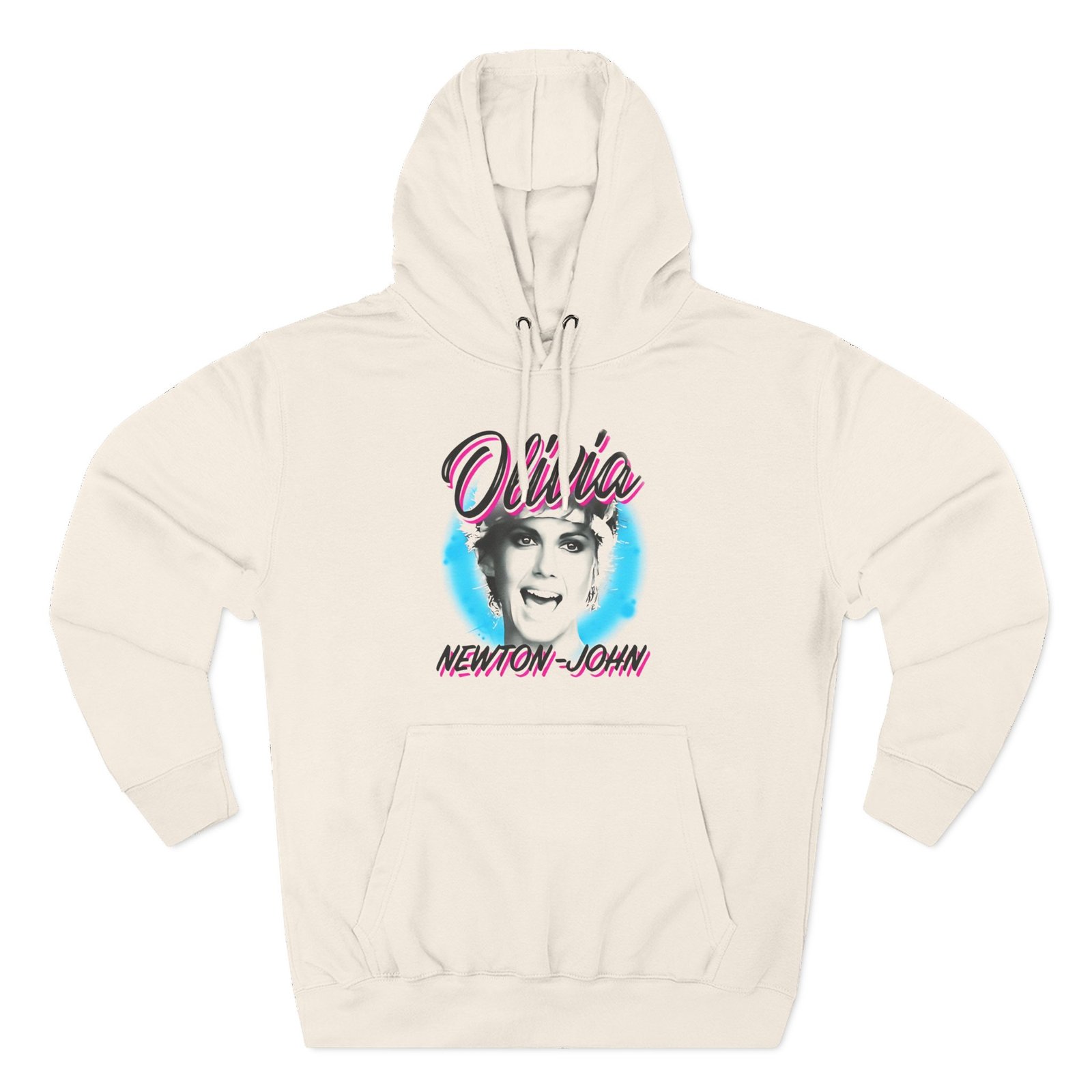 Beat the cold with this Olivia Newton John Pastel Paint premium pullover hoodie that’s just the right layer of warm and cozy. Made with three-panel fleece lining, this pullover is double stitched for durability and roomy. Pick one in your favorite color to match your style.