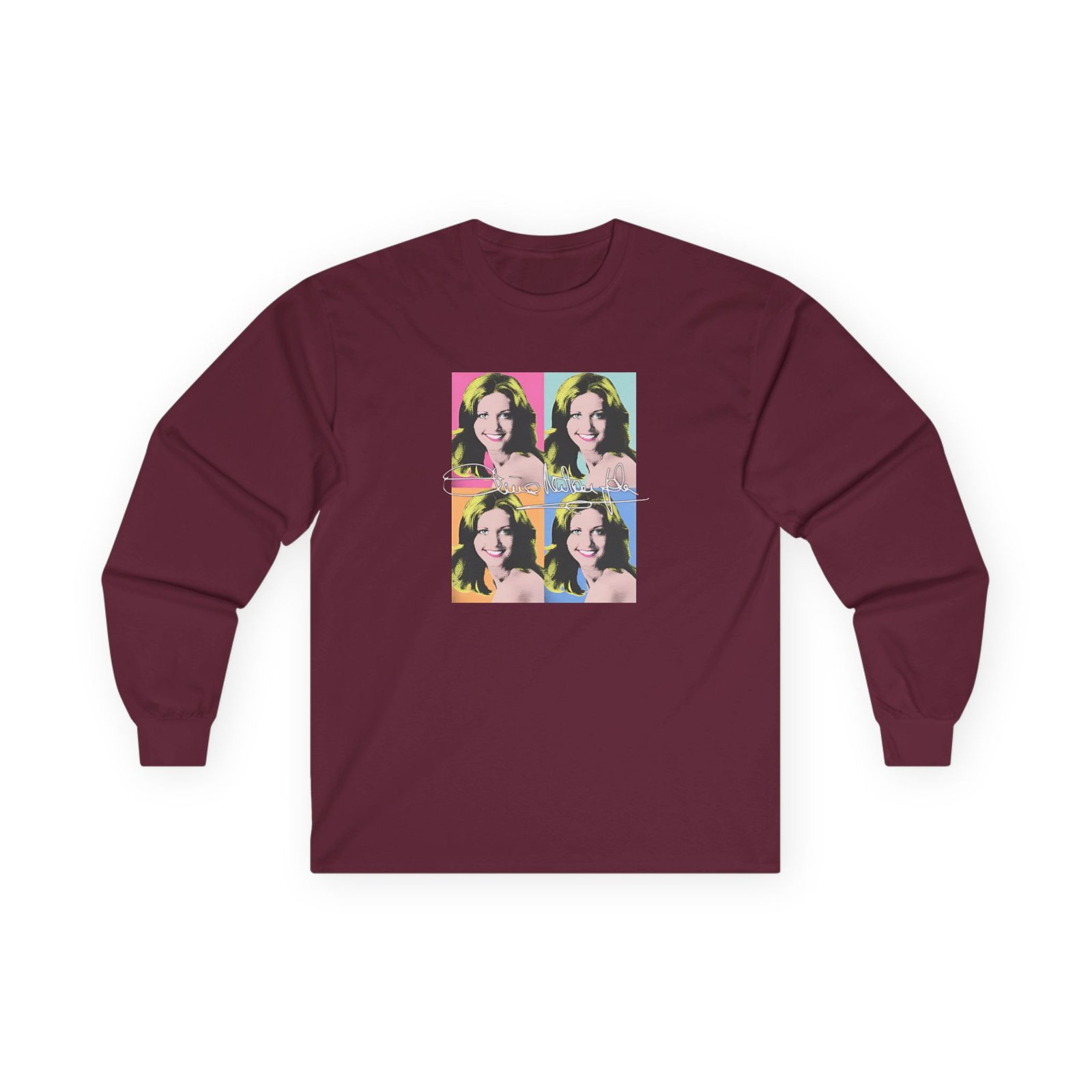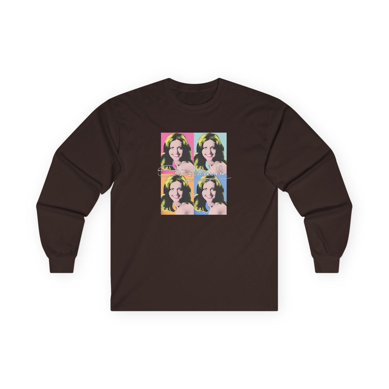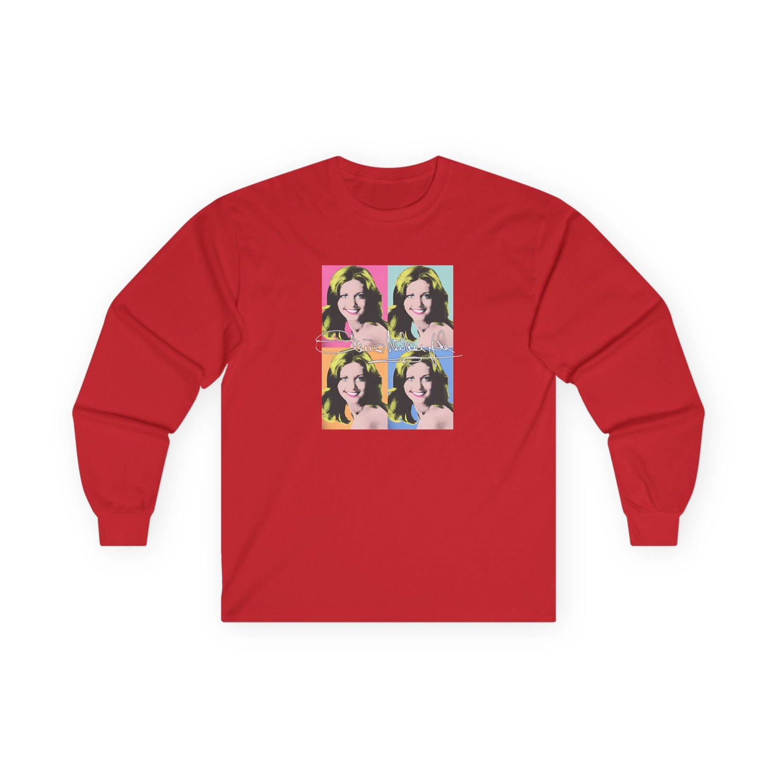 A bit more formal than a standard-issue t-shirt, the Olivia Newton John Pop Art ultra cotton long sleeve tee is a clear comfort winner. The sleeves also act as a nice frame. There are no side seams. The shoulders are taped for improved durability. This makes for a good fitting around the shoulders and neck. The cotton used for these shirts is environmentally friendly.