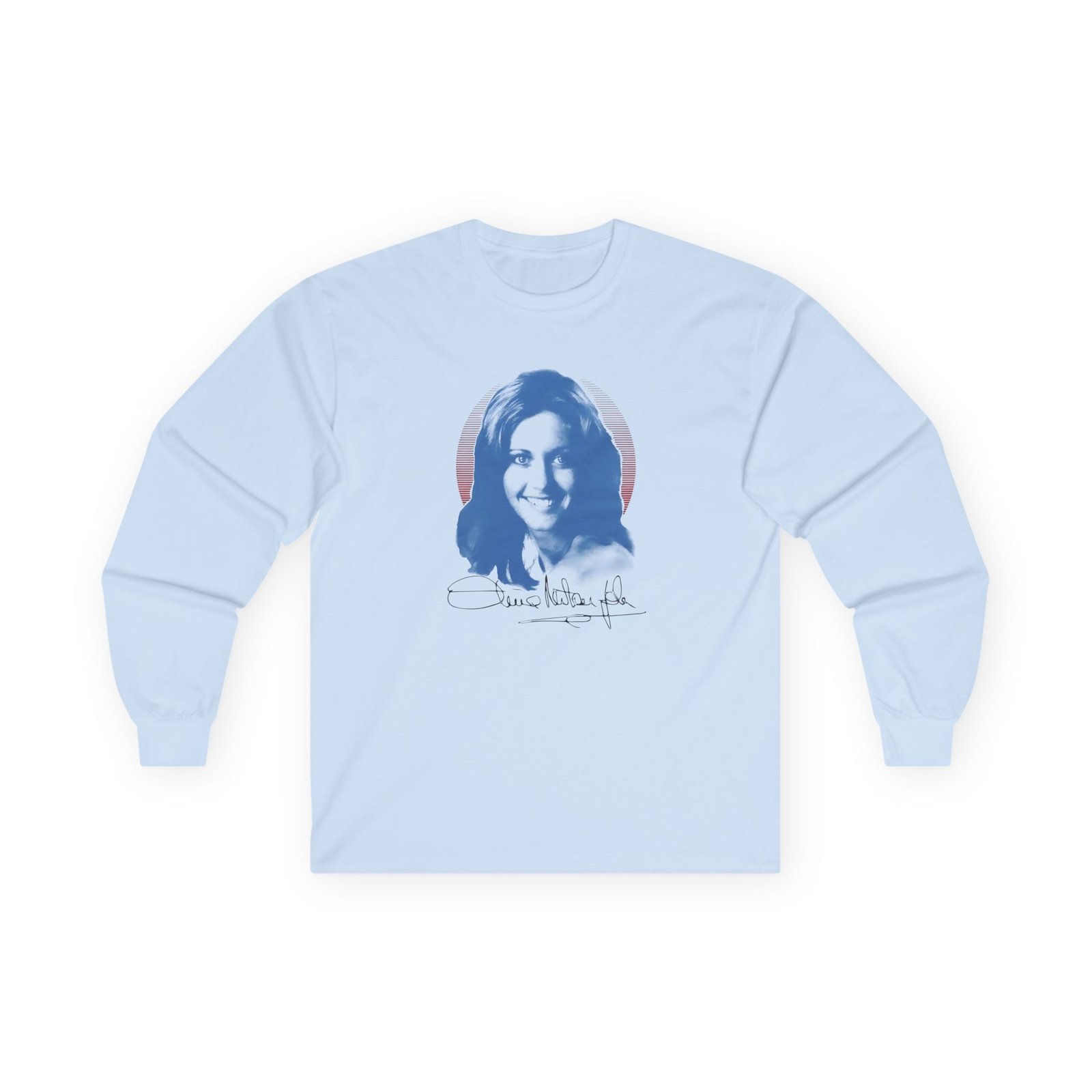 A bit more formal than a standard-issue t-shirt, the Olivia Newton John Smiles & Signs ultra cotton long sleeve tee is a clear comfort winner. The sleeves also act as a nice frame. There are no side seams. The shoulders are taped for improved durability. This makes for a good fitting around the shoulders and neck. The cotton used for these shirts is environmentally friendly.