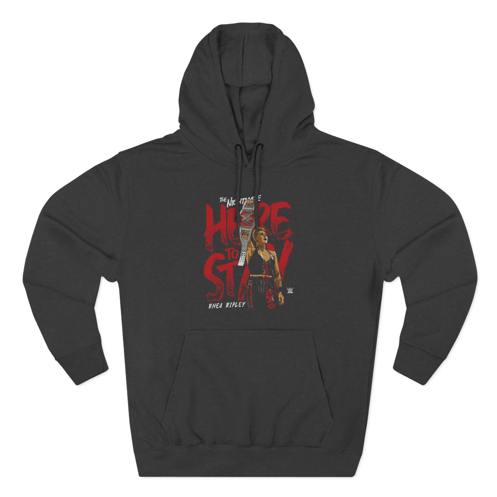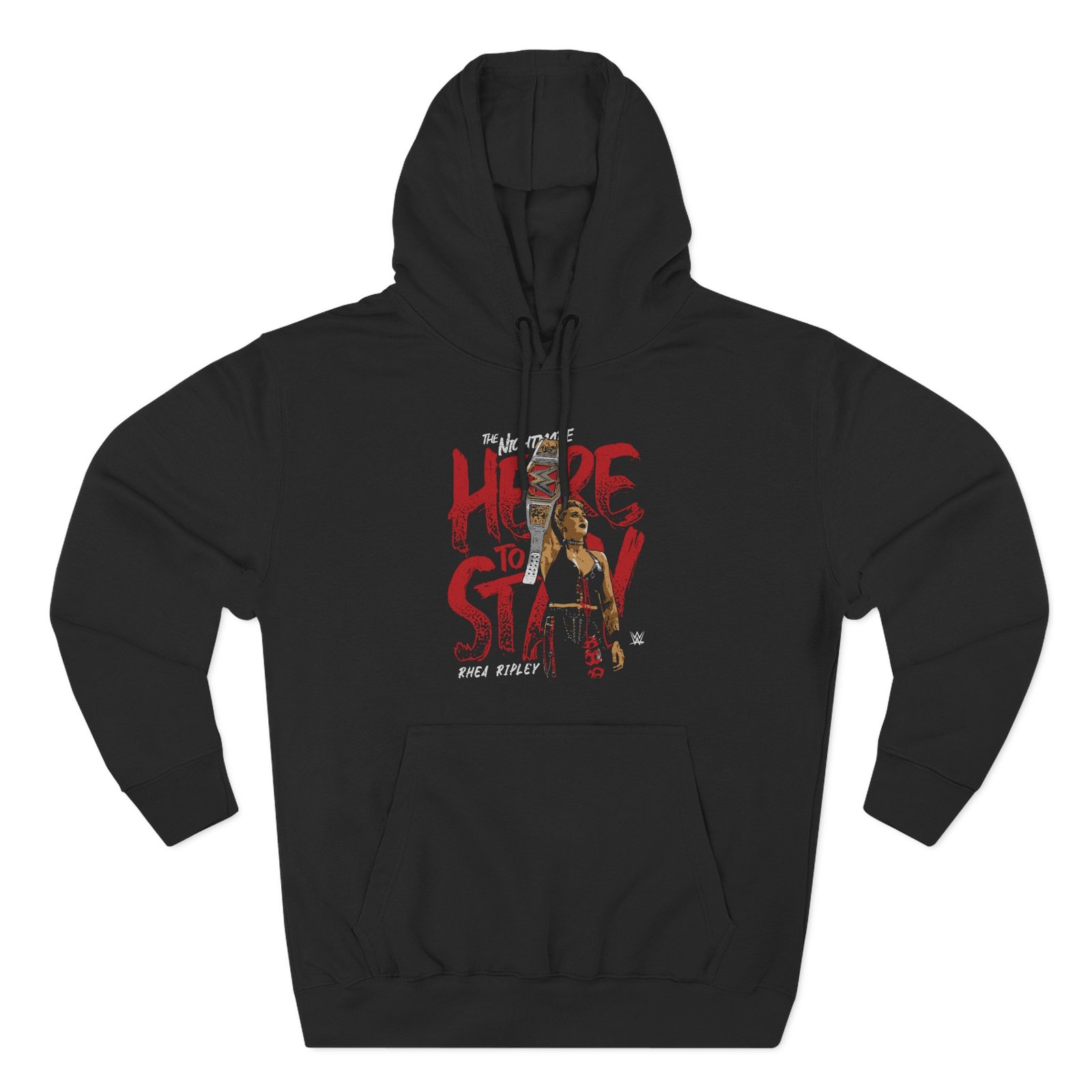 Beat the cold with this Rhea Ripley Here to Stay WHT premium pullover hoodie that’s just the right layer of warm and cozy. Made with three-panel fleece lining, this pullover is double stitched for durability and roomy. Pick one in your favorite color to match your style.