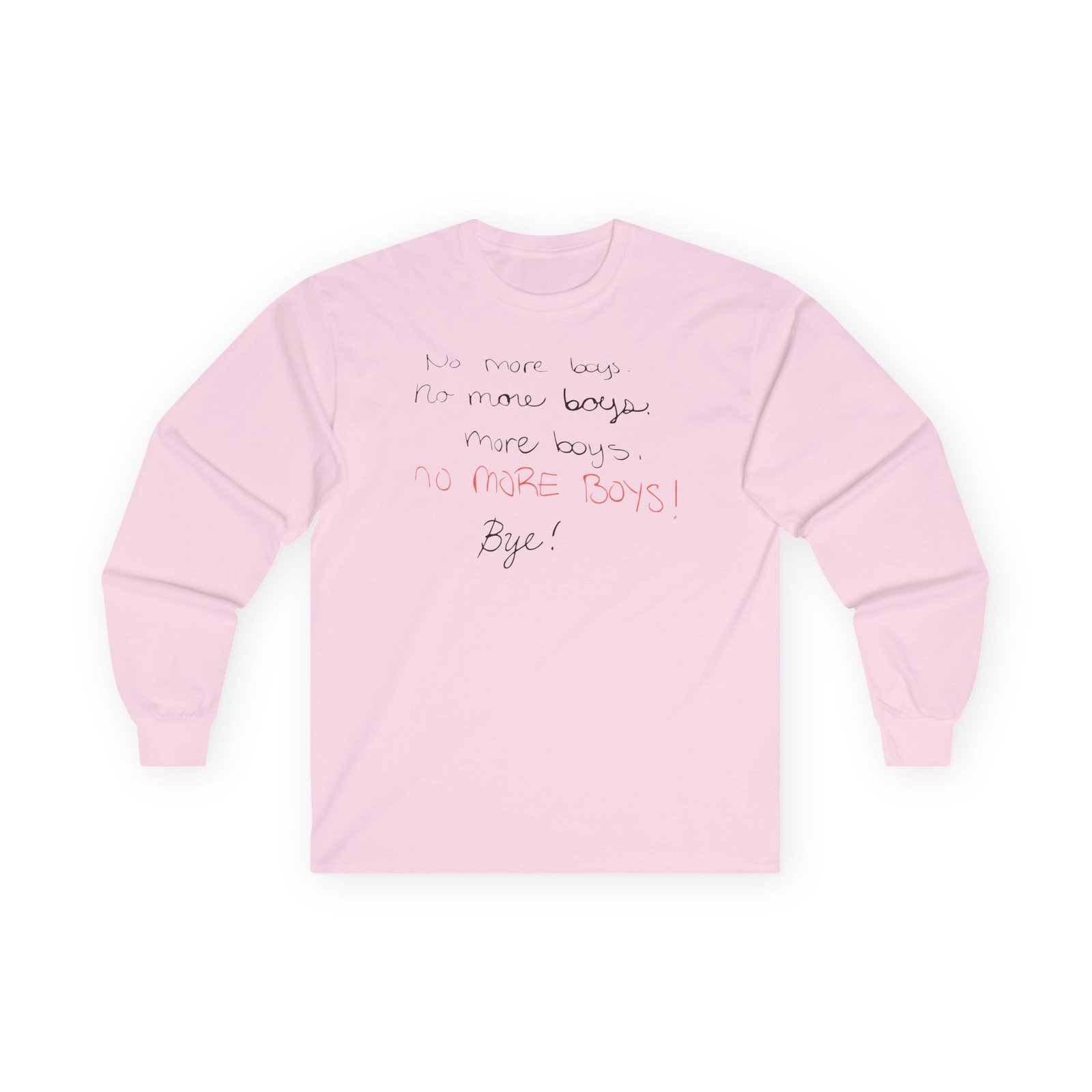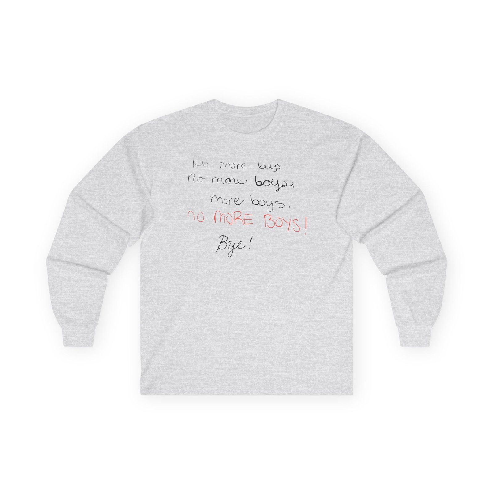 A bit more formal than a standard-issue t-shirt, the Smosh No More Boys ultra cotton long sleeve tee is a clear comfort winner. The sleeves also act as a nice frame. There are no side seams. The shoulders are taped for improved durability. This makes for a good fitting around the shoulders and neck. The cotton used for these shirts is environmentally friendly.