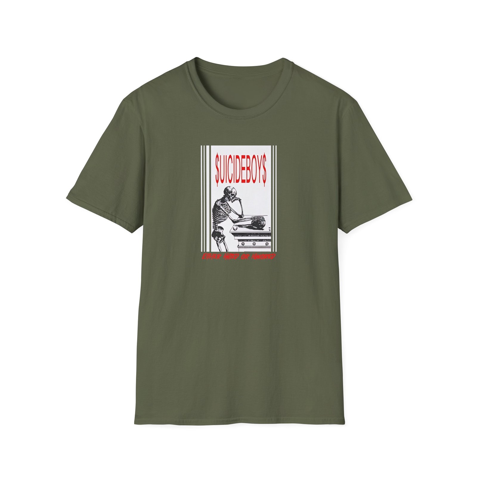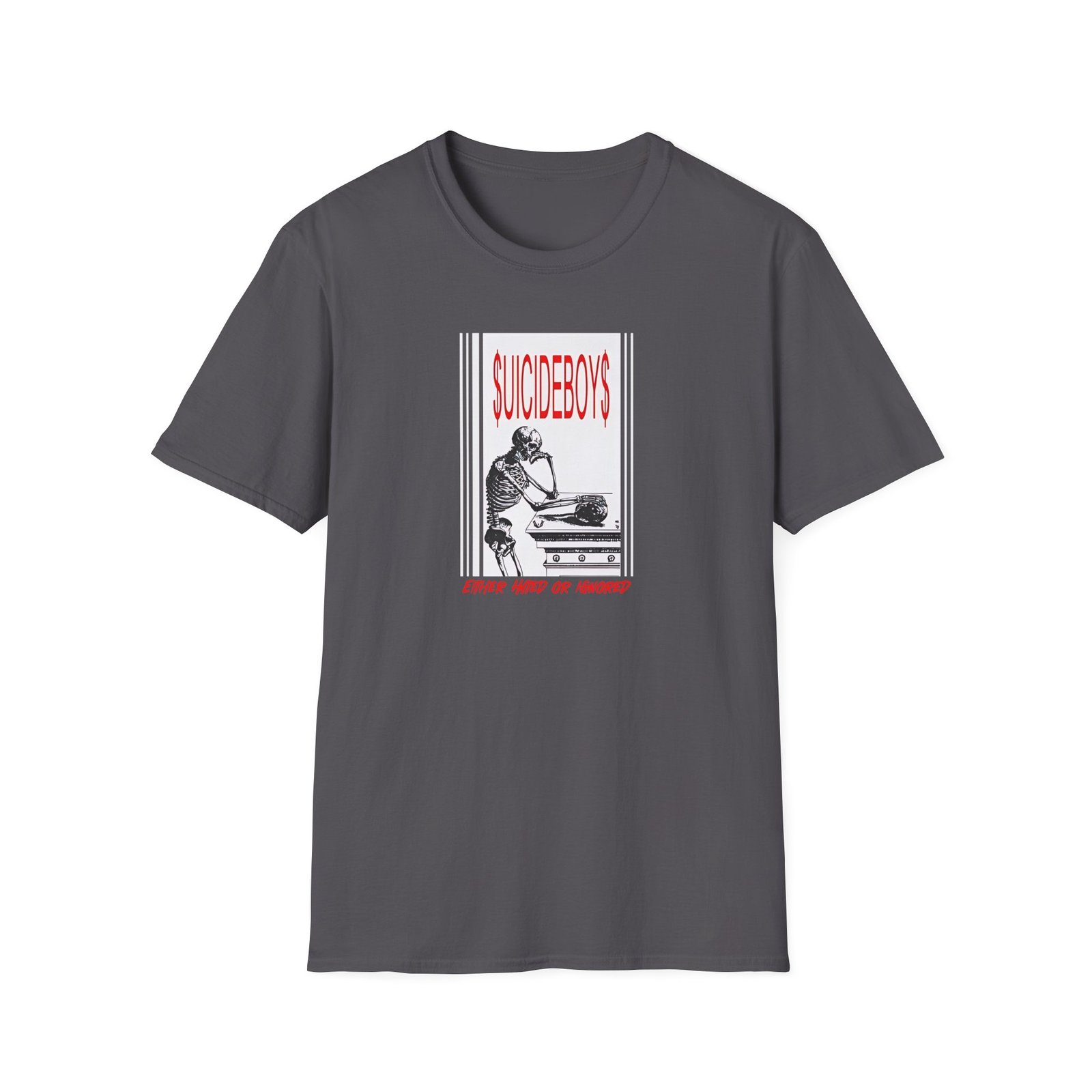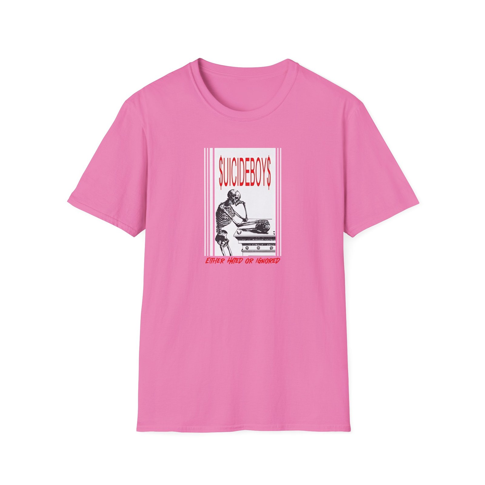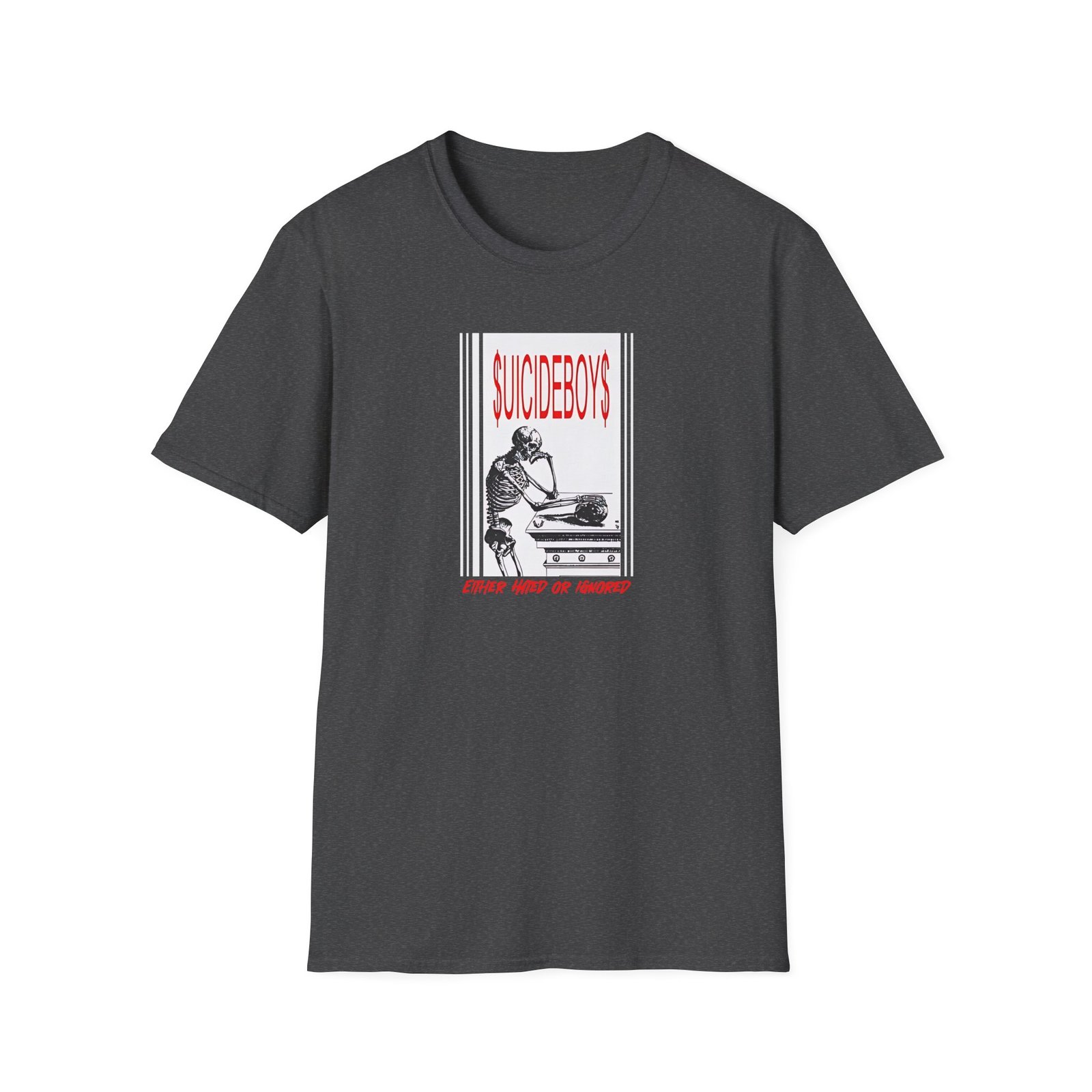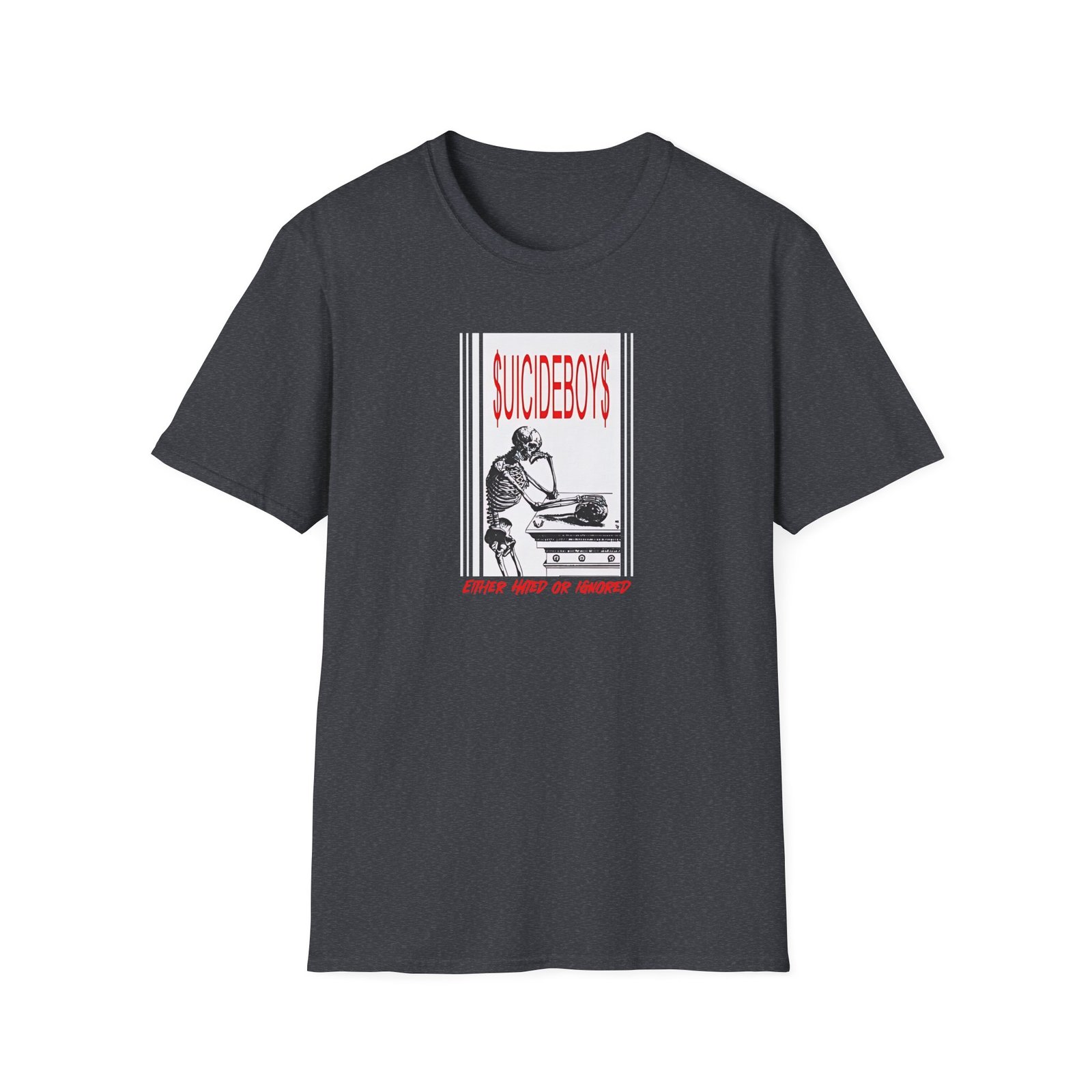 The Suicide Boys Either Hated or Ignored unisex soft-style t-shirt puts a new spin on casual comfort. Made from very soft materials, this tee is 100% cotton for solid colors. Heather colors and sports grey include polyester. The shoulders have twill tape for improved durability. There are no side seams. The collar is made with ribbed knitting to prevent curling damage.