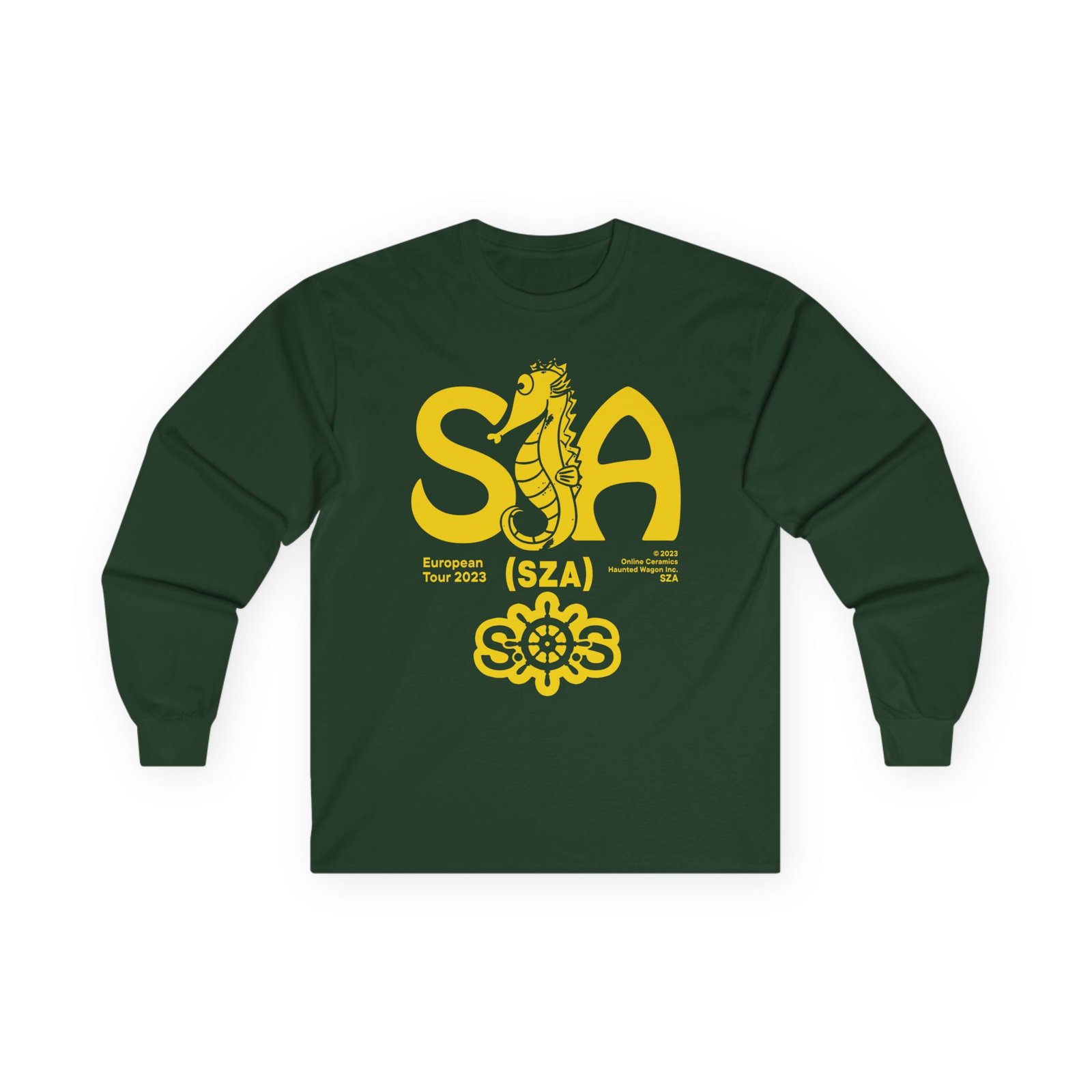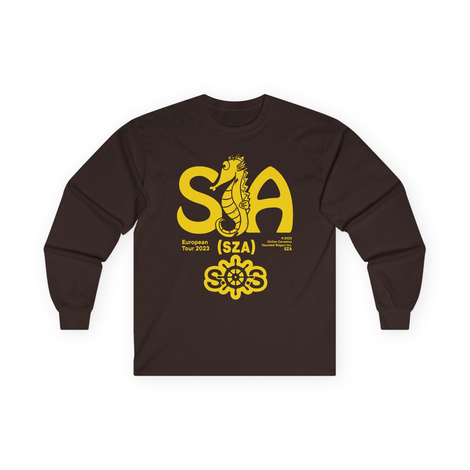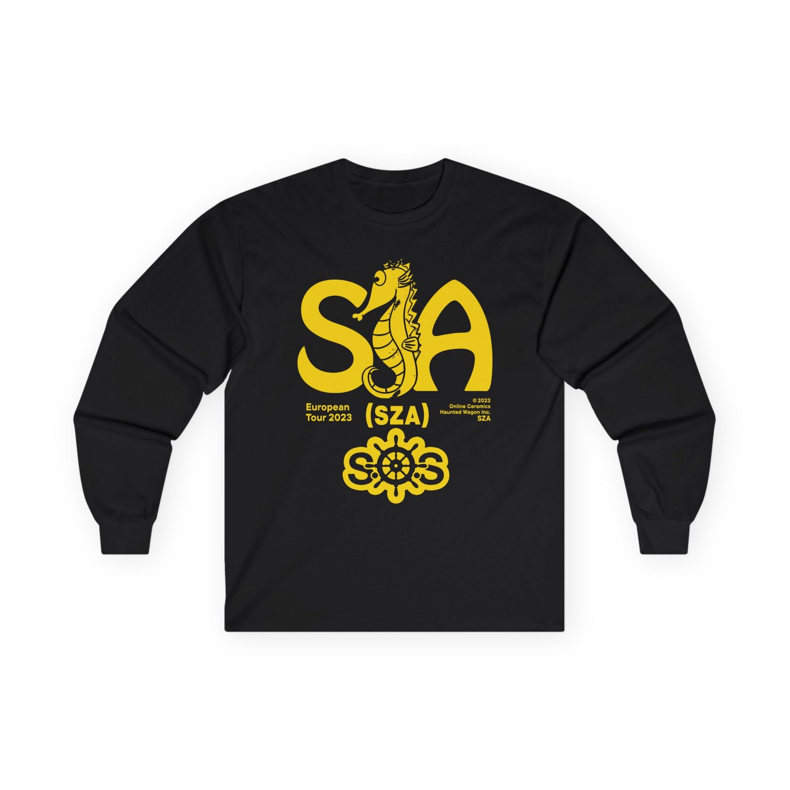 A bit more formal than a standard-issue t-shirt, the Sza Sos Seahouse Tour ultra cotton long sleeve tee is a clear comfort winner. The sleeves also act as a nice frame. There are no side seams. The shoulders are taped for improved durability. This makes for a good fitting around the shoulders and neck. The cotton used for these shirts is environmentally friendly.