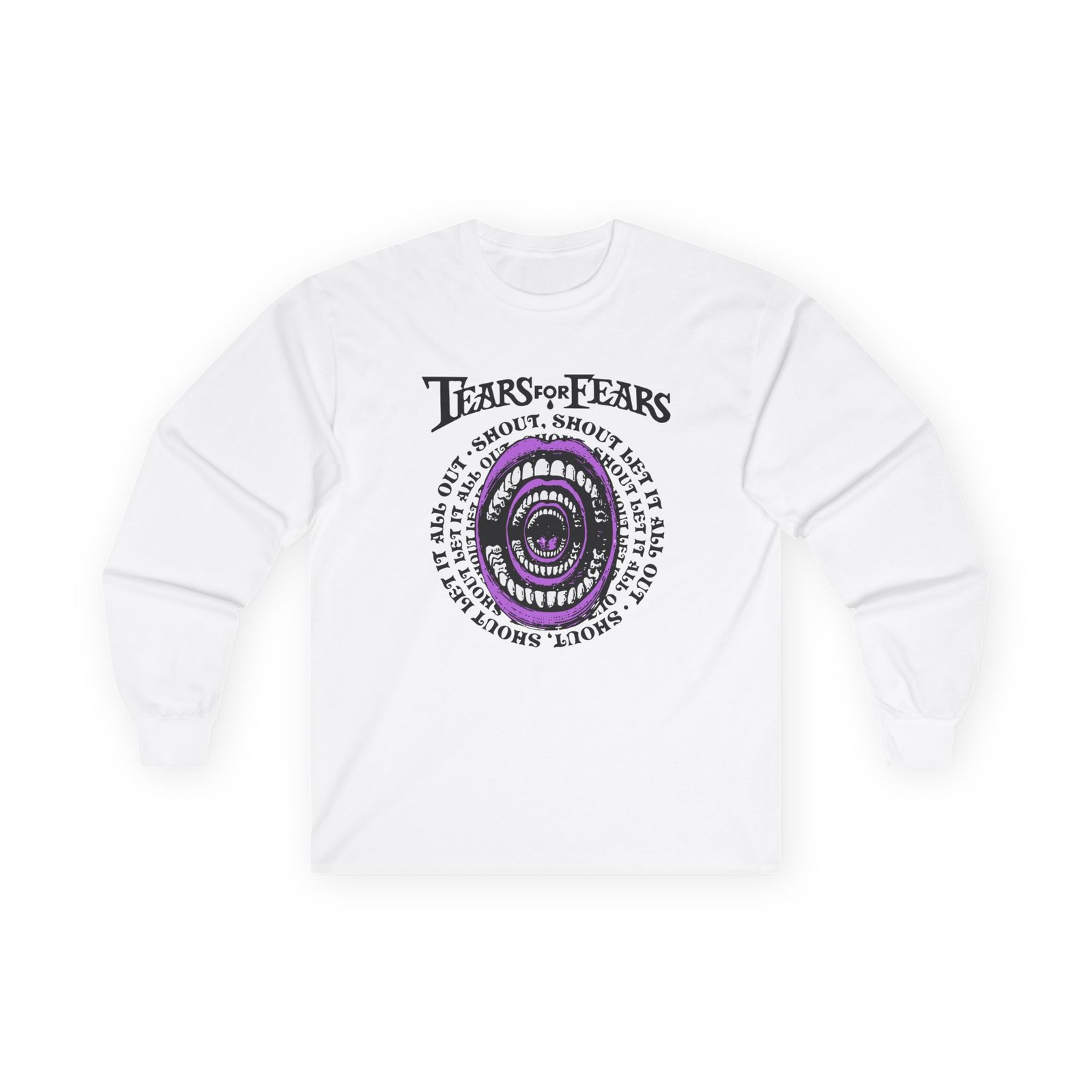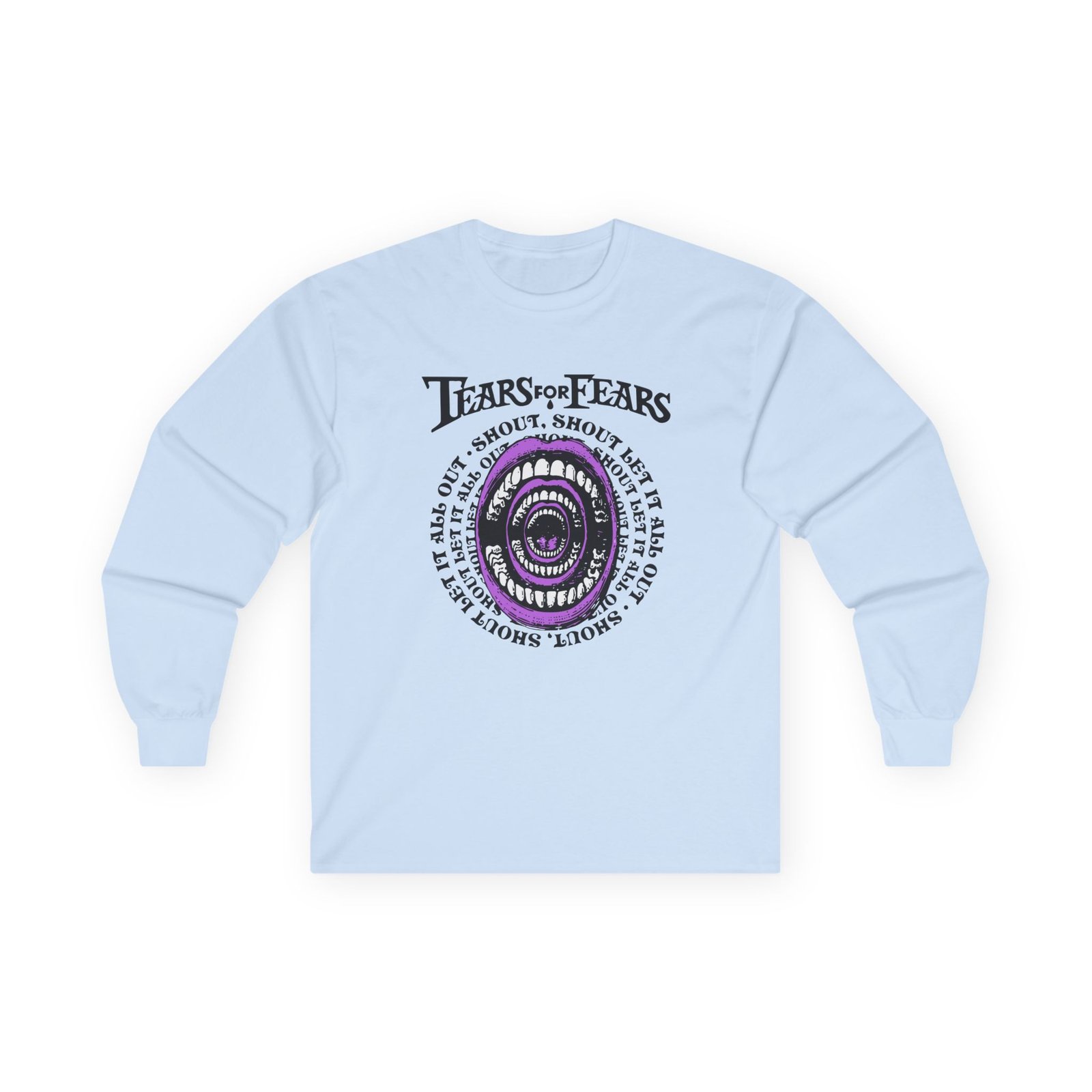A bit more formal than a standard-issue t-shirt, the Tears for Fears Shout Let It All Out ultra cotton long sleeve tee is a clear comfort winner. The sleeves also act as a nice frame. There are no side seams. The shoulders are taped for improved durability. This makes for a good fitting around the shoulders and neck. The cotton used for these shirts is environmentally friendly.
