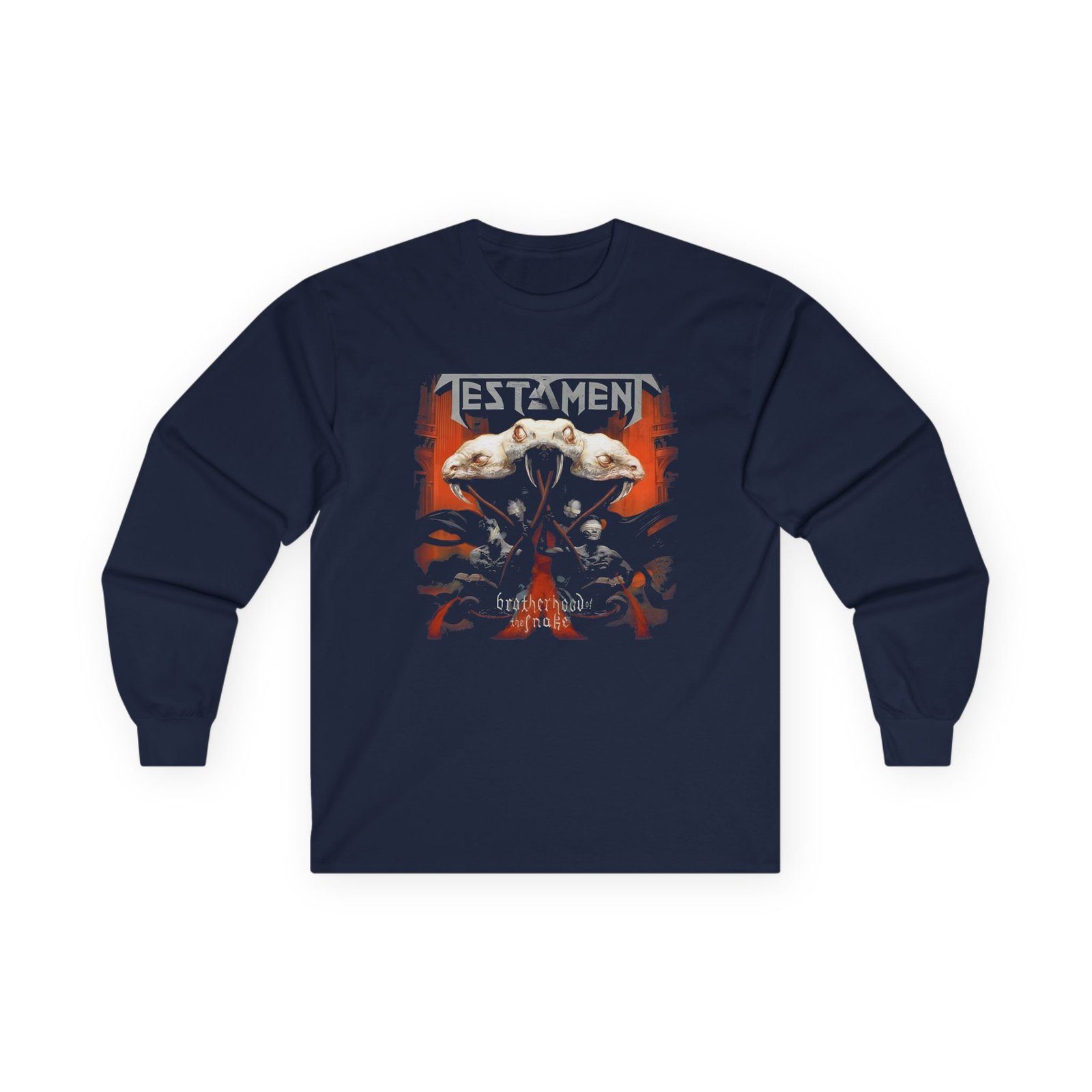 A bit more formal than a standard-issue t-shirt, the Testament Brotherhood of the Snake ultra cotton long sleeve tee is a clear comfort winner. The sleeves also act as a nice frame. There are no side seams. The shoulders are taped for improved durability. This makes for a good fitting around the shoulders and neck. The cotton used for these shirts is environmentally friendly.