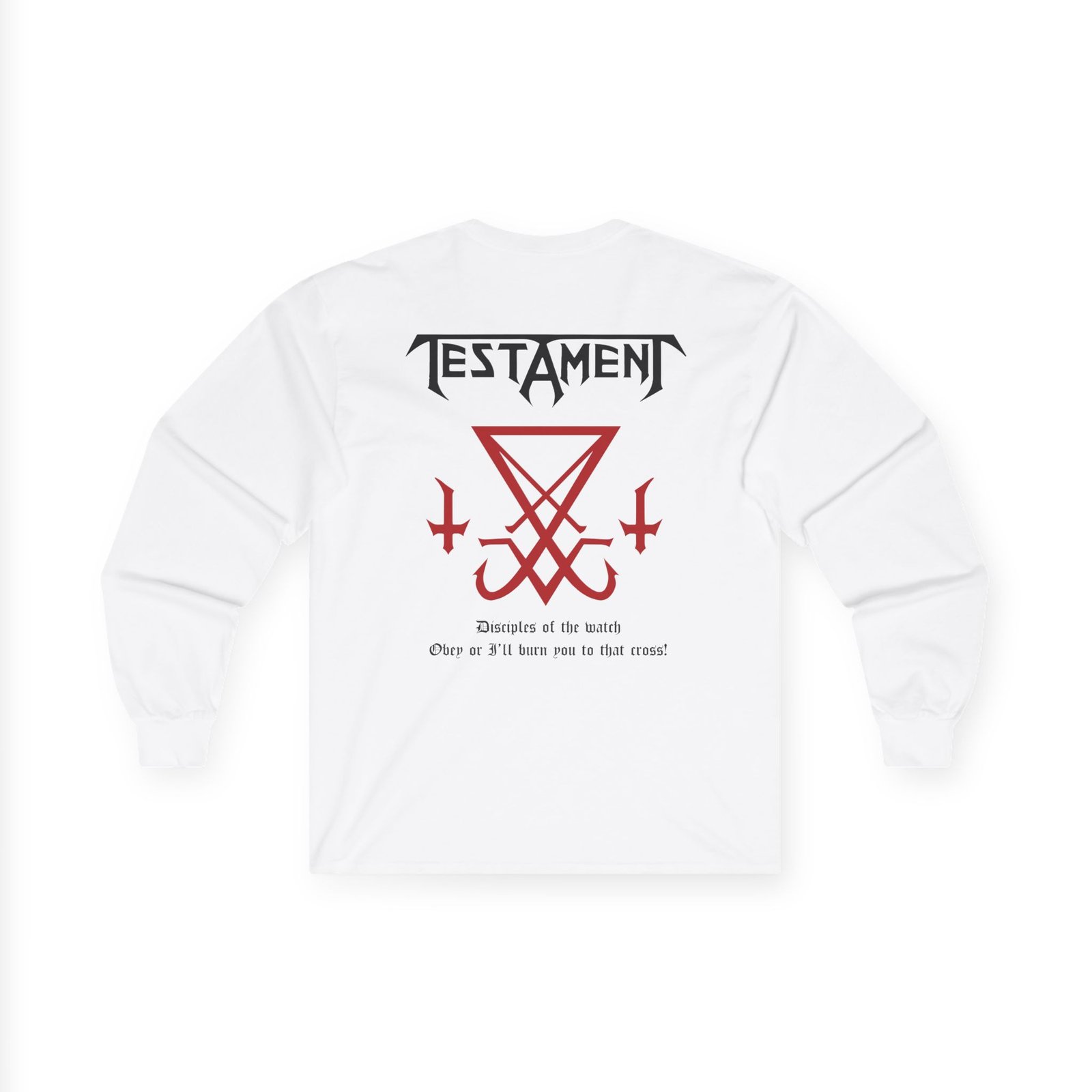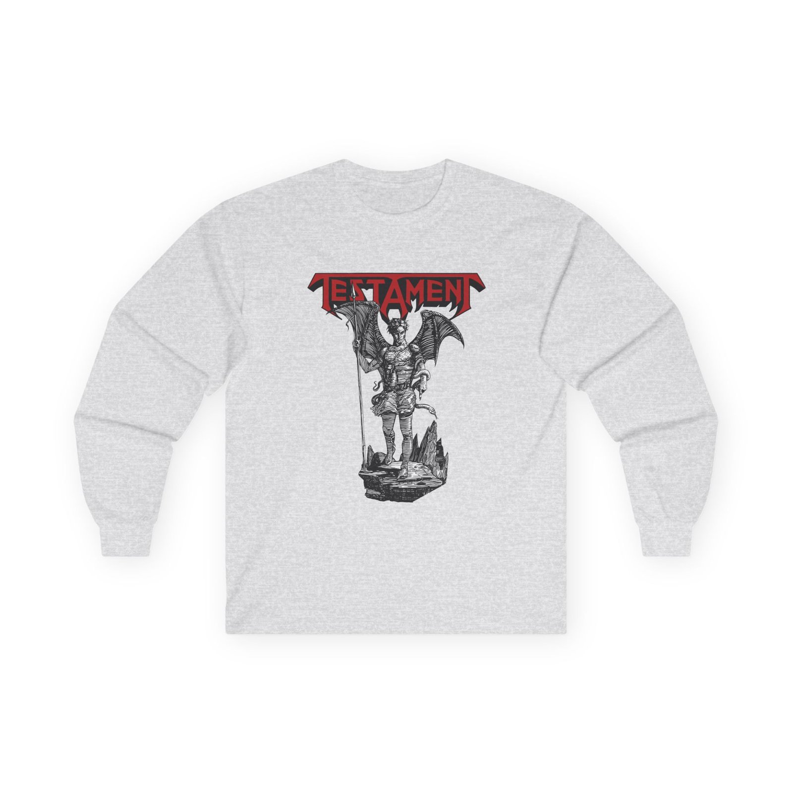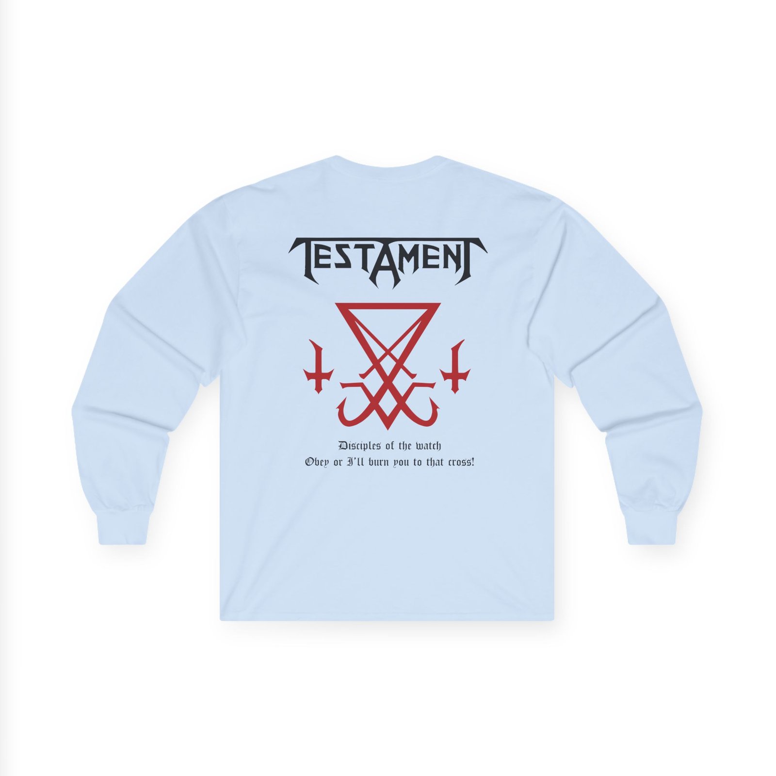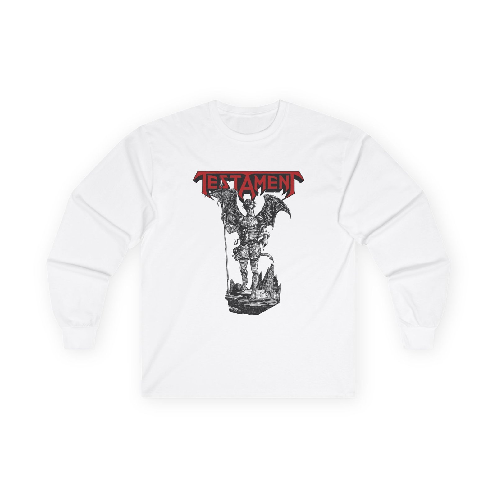 A bit more formal than a standard-issue t-shirt, the Testament Lucifer ultra cotton long sleeve tee is a clear comfort winner. The sleeves also act as a nice frame. There are no side seams. The shoulders are taped for improved durability. This makes for a good fitting around the shoulders and neck. The cotton used for these shirts is environmentally friendly.