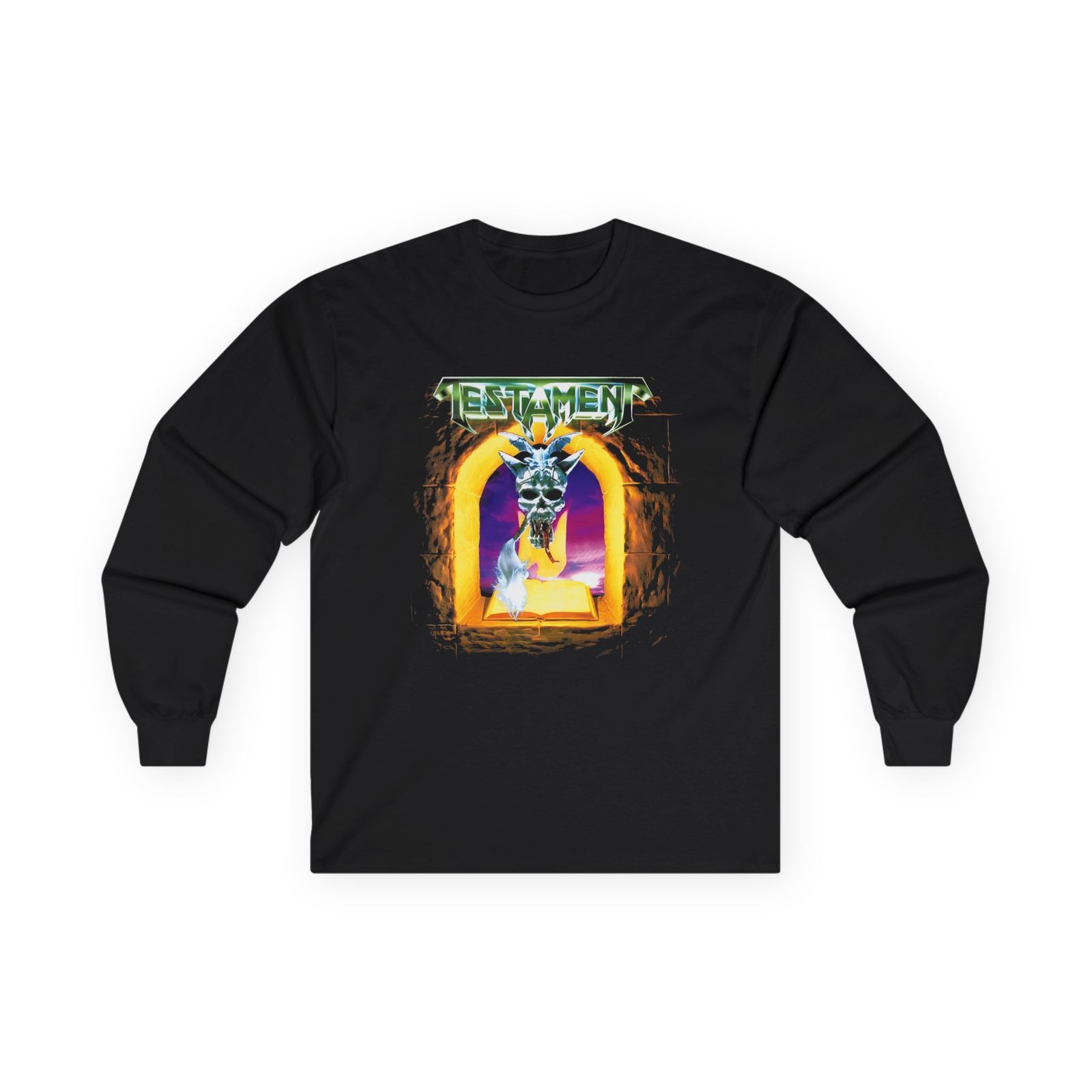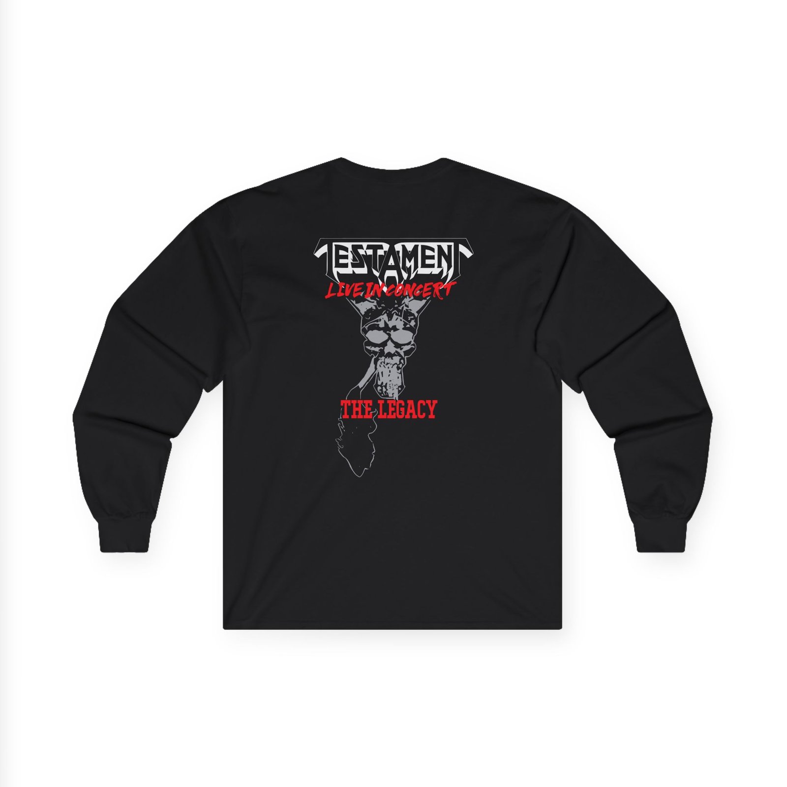 A bit more formal than a standard-issue t-shirt, the Testament the Legacy Live in Concert ultra cotton long sleeve tee is a clear comfort winner. The sleeves also act as a nice frame. There are no side seams. The shoulders are taped for improved durability. This makes for a good fitting around the shoulders and neck. The cotton used for these shirts is environmentally friendly.