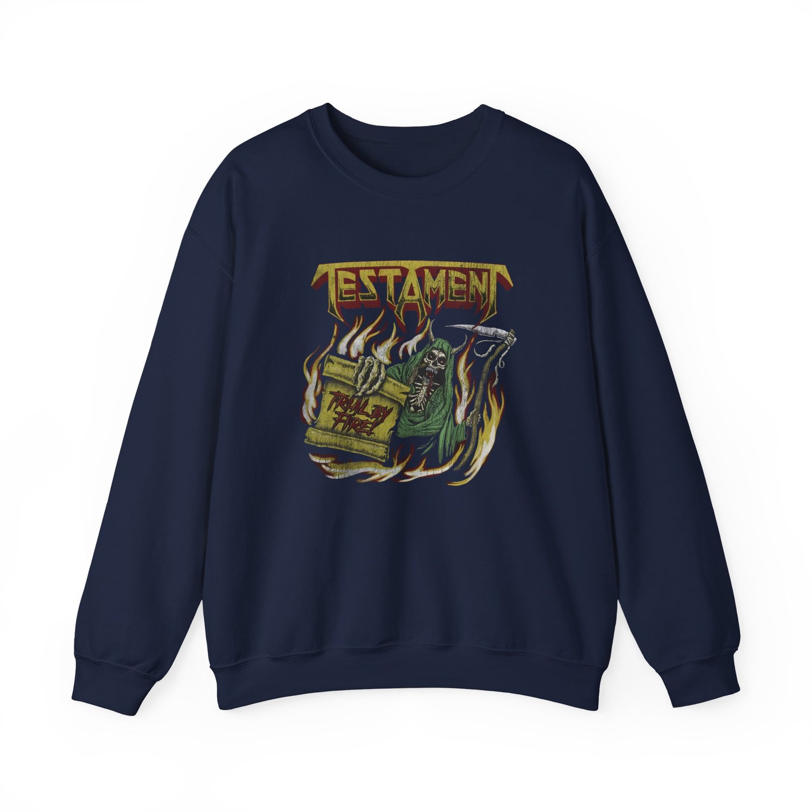 Ideal for any situation, a Testament Trial by Fire unisex heavy blend crewneck sweatshirt is pure comfort. These garments are made from polyester and cotton. This combination helps designs come out looking fresh and beautiful. The collar is ribbed knit, so it retains its shape even after washing. There are no itchy side seams on these sweaters.