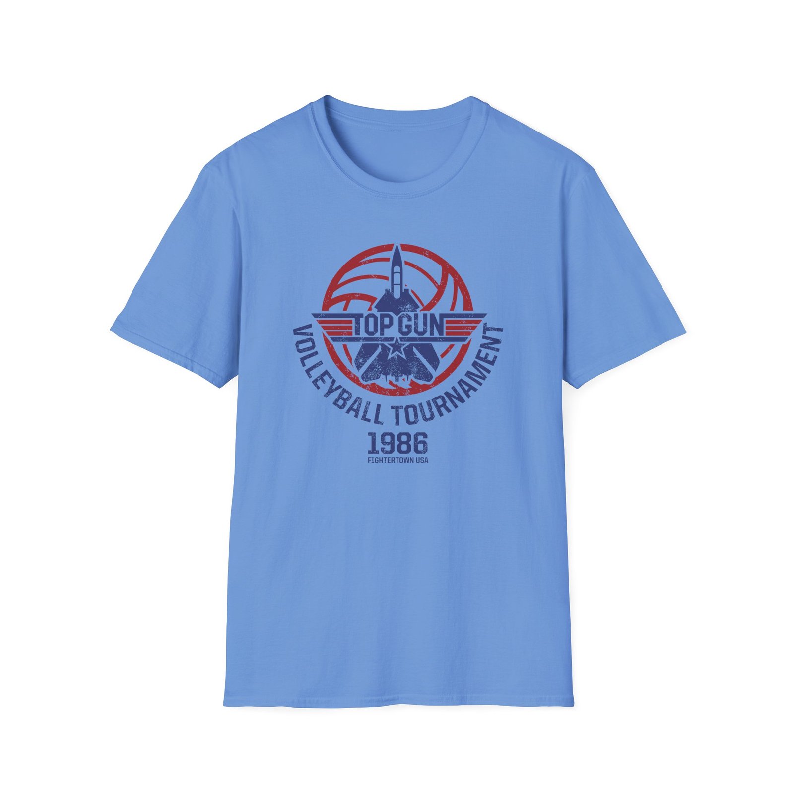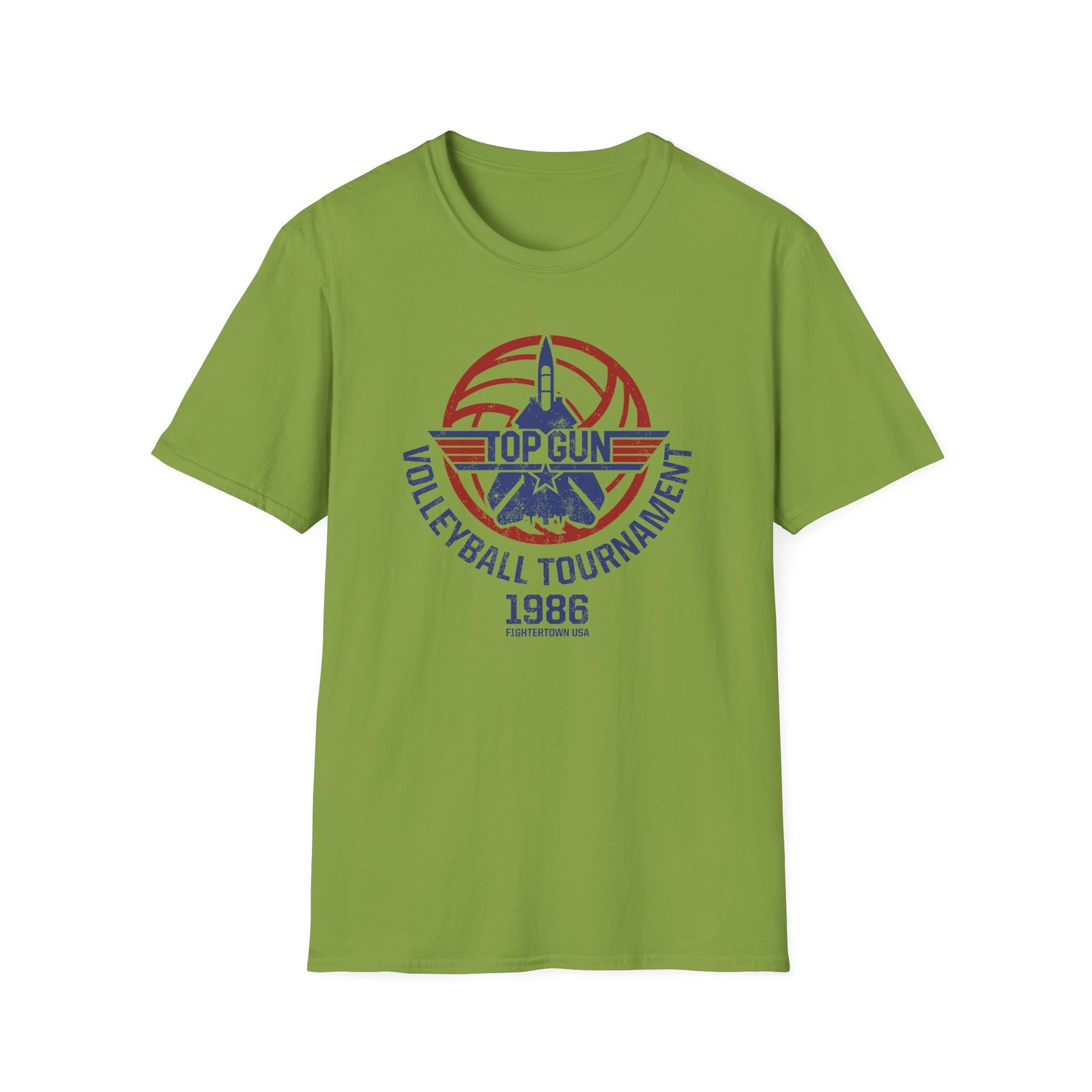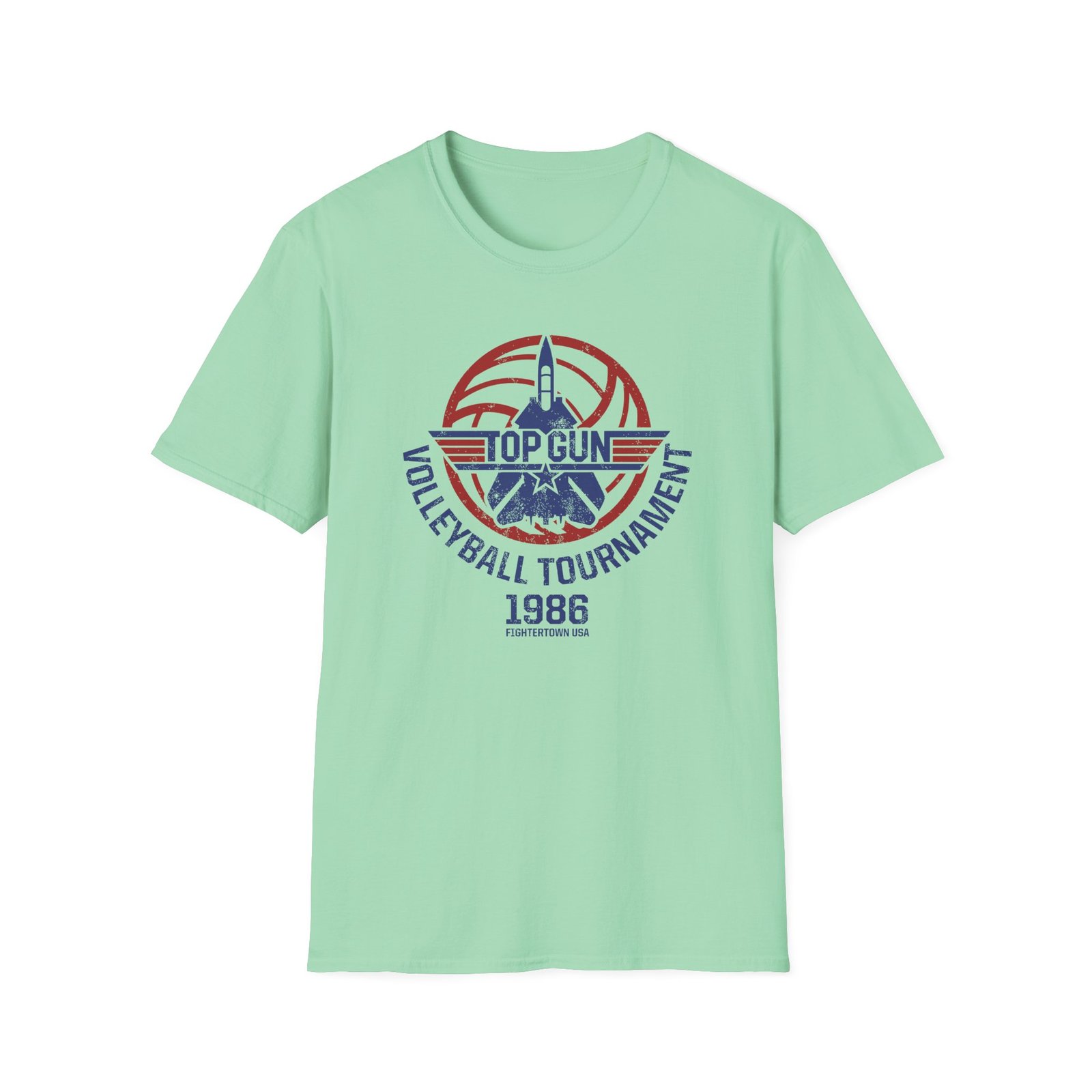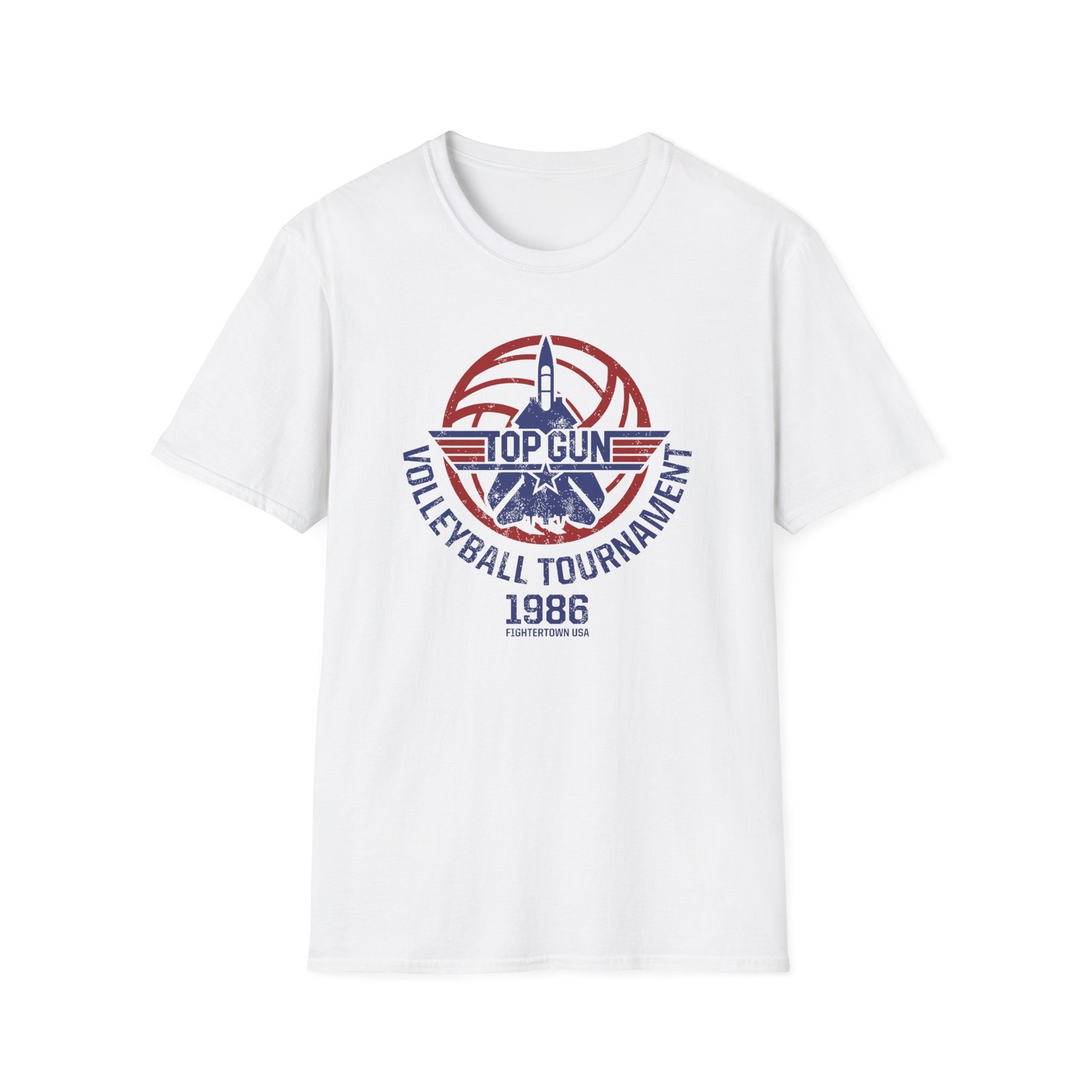 The Top Gun Volleyball Tournament unisex soft-style t-shirt puts a new spin on casual comfort. Made from very soft materials, this tee is 100% cotton for solid colors. Heather colors and sports grey include polyester. The shoulders have twill tape for improved durability. There are no side seams. The collar is made with ribbed knitting to prevent curling damage.