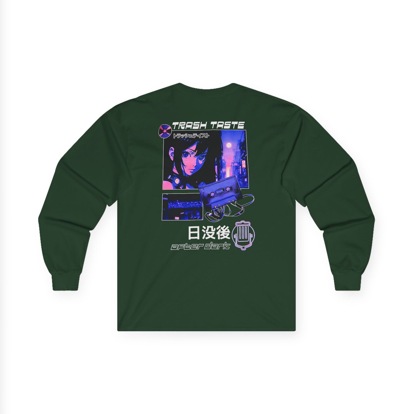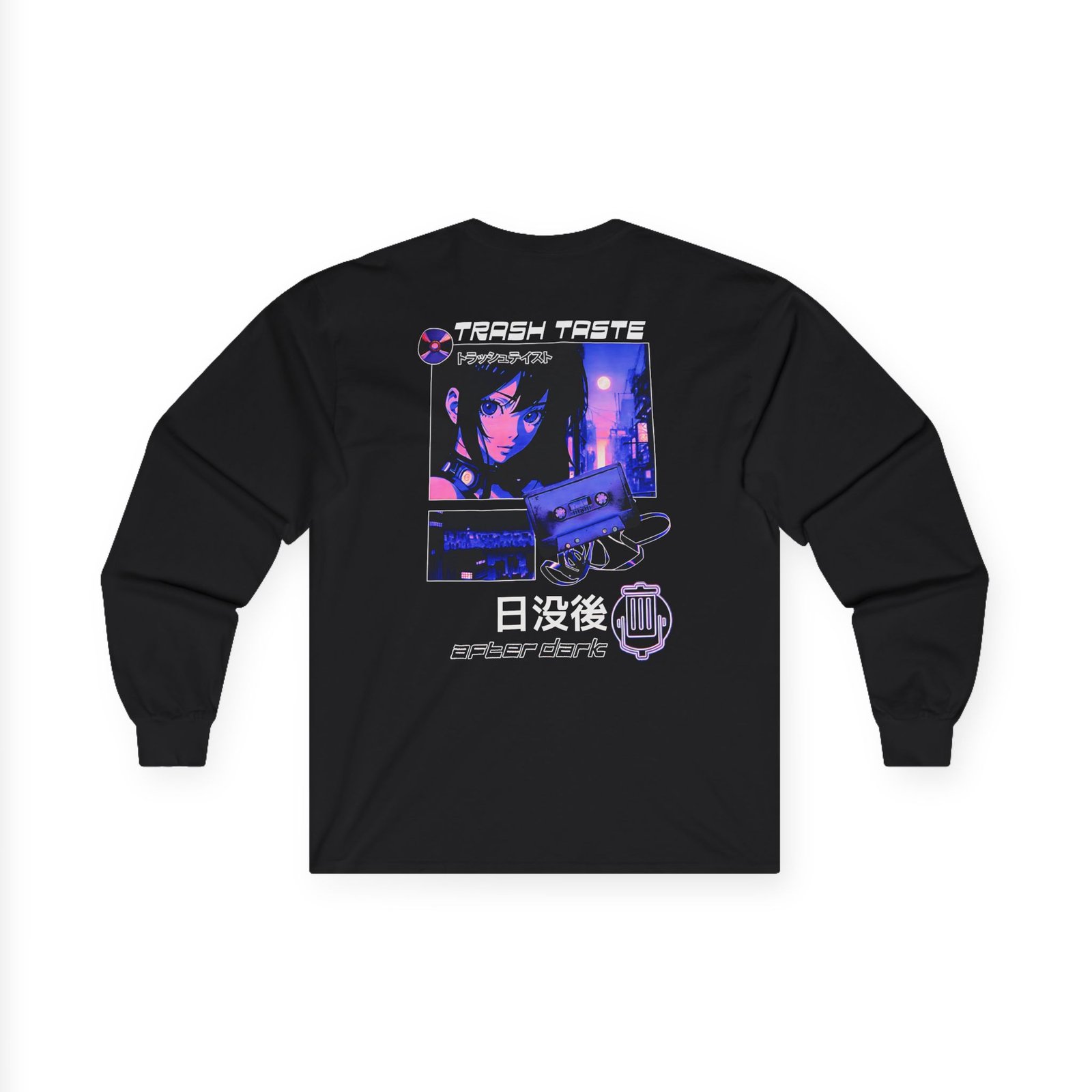 A bit more formal than a standard-issue t-shirt, the Trash Taste After Dark ultra cotton long sleeve tee is a clear comfort winner. The sleeves also act as a nice frame. There are no side seams. The shoulders are taped for improved durability. This makes for a good fitting around the shoulders and neck. The cotton used for these shirts is environmentally friendly.