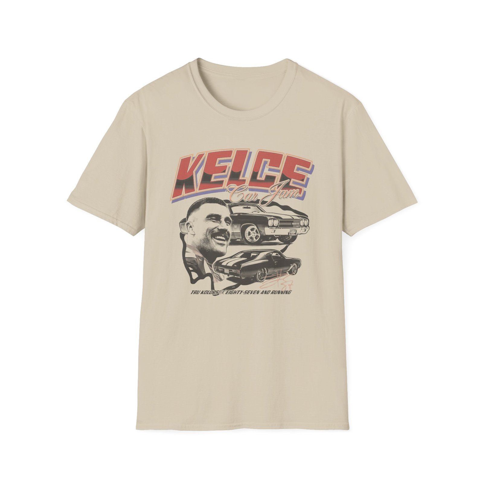 The Travis Kelce Car Jam Chevelle unisex soft-style t-shirt puts a new spin on casual comfort. Made from very soft materials, this tee is 100% cotton for solid colors. Heather colors and sports grey include polyester. The shoulders have twill tape for improved durability. There are no side seams. The collar is made with ribbed knitting to prevent curling damage.