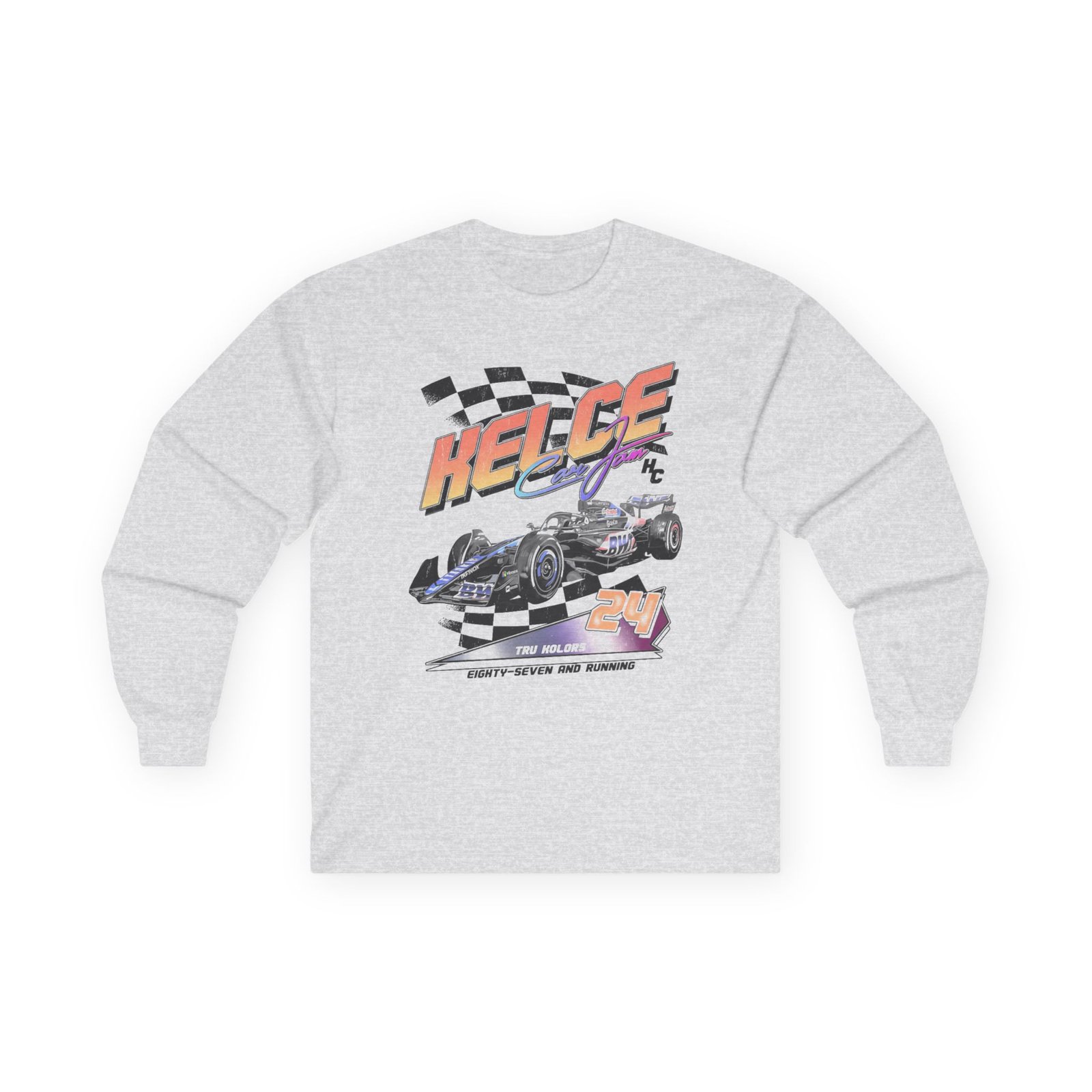 A bit more formal than a standard-issue t-shirt, the Travis Kelce Car Jam Racing ultra cotton long sleeve tee is a clear comfort winner. The sleeves also act as a nice frame. There are no side seams. The shoulders are taped for improved durability. This makes for a good fitting around the shoulders and neck. The cotton used for these shirts is environmentally friendly.