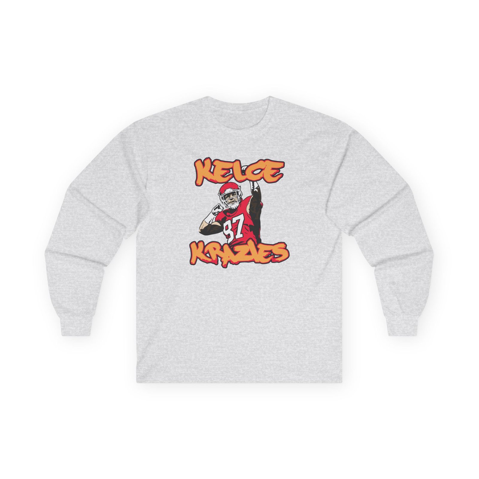A bit more formal than a standard-issue t-shirt, the Travis Kelce Krazies ultra cotton long sleeve tee is a clear comfort winner. The sleeves also act as a nice frame. There are no side seams. The shoulders are taped for improved durability. This makes for a good fitting around the shoulders and neck. The cotton used for these shirts is environmentally friendly.