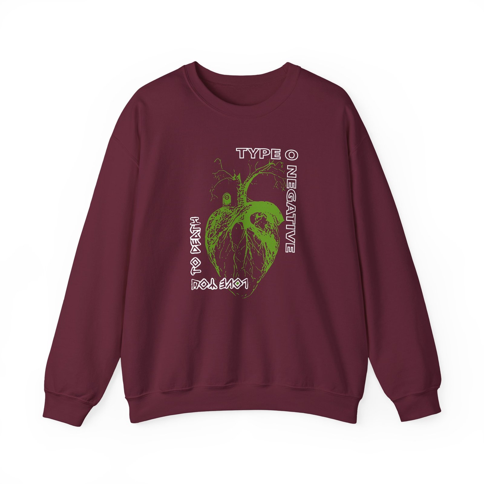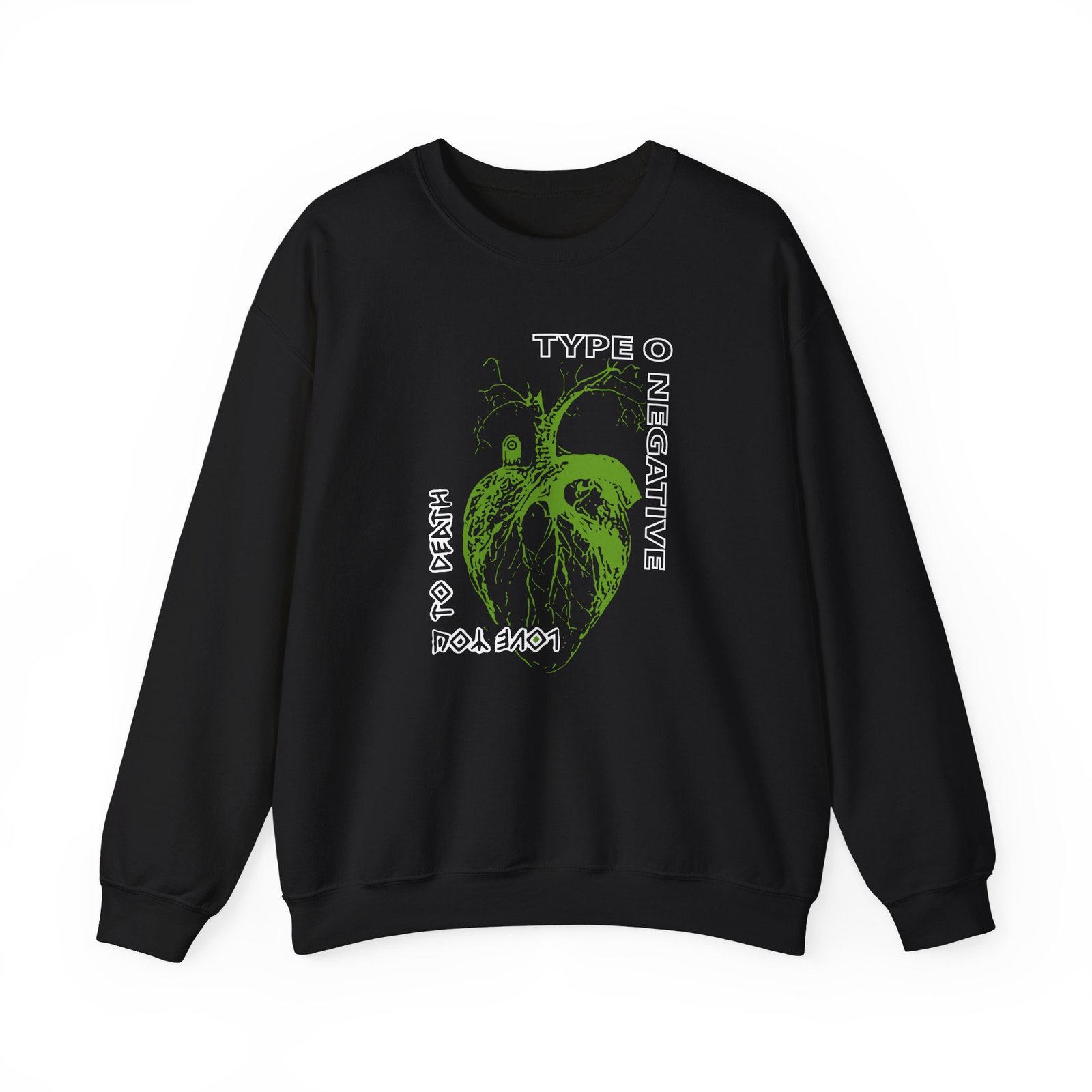Ideal for any situation, a Type O Negative Heart You to Death unisex heavy blend crewneck sweatshirt is pure comfort. These garments are made from polyester and cotton. This combination helps designs come out looking fresh and beautiful. The collar is ribbed knit, so it retains its shape even after washing. There are no itchy side seams on these sweaters.