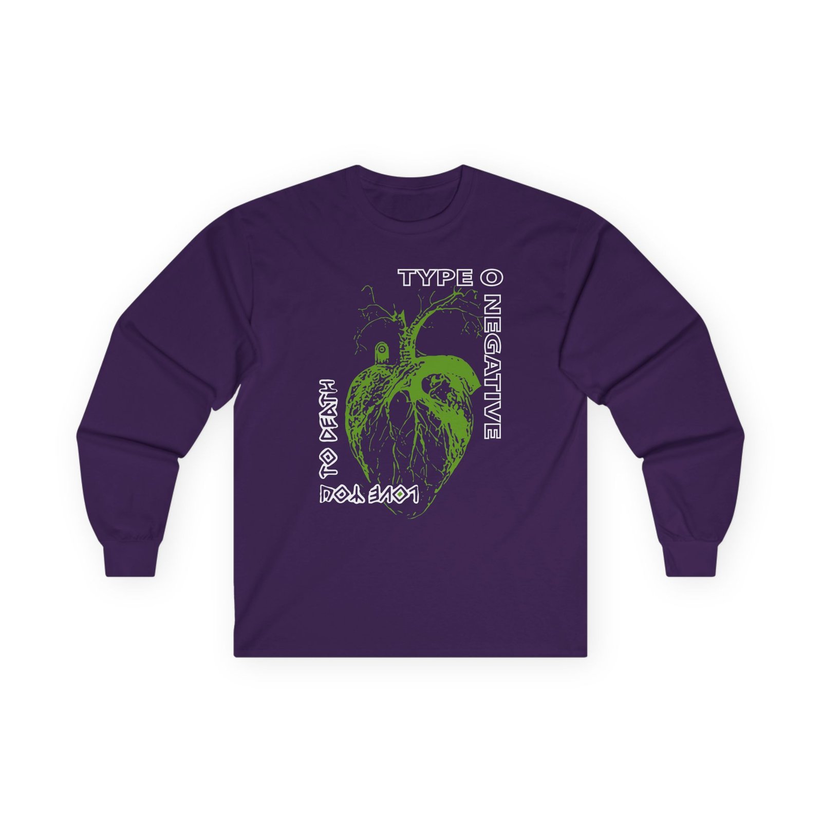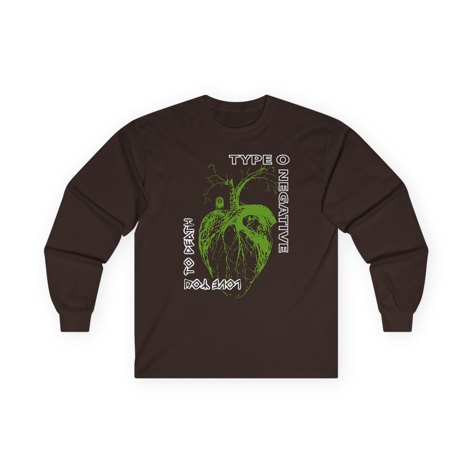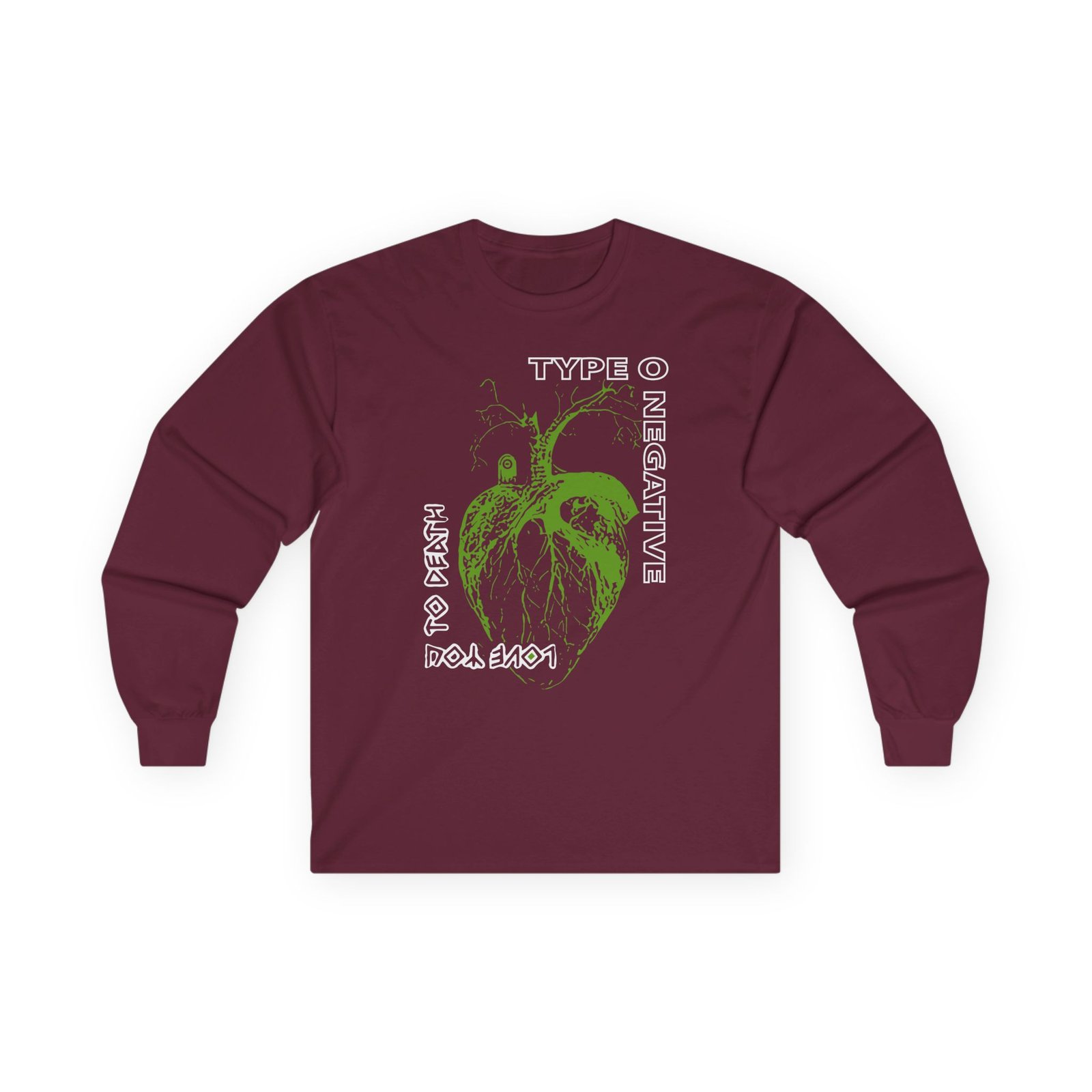 A bit more formal than a standard-issue t-shirt, the Type O Negative Heart You to Death ultra cotton long sleeve tee is a clear comfort winner. The sleeves also act as a nice frame. There are no side seams. The shoulders are taped for improved durability. This makes for a good fitting around the shoulders and neck. The cotton used for these shirts is environmentally friendly.