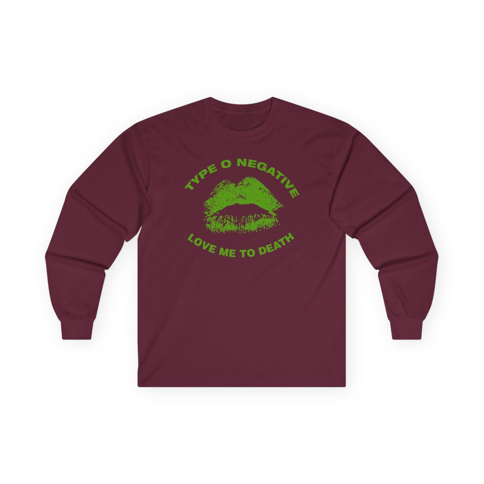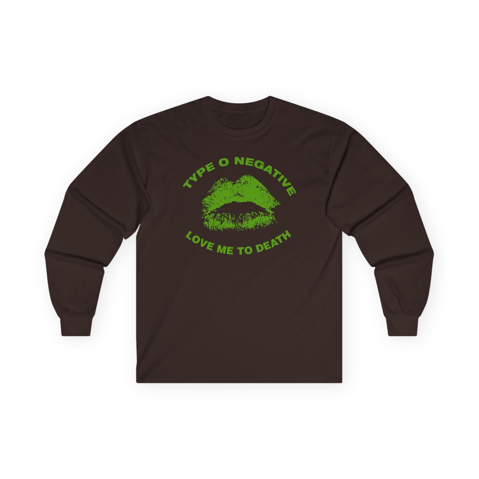 A bit more formal than a standard-issue t-shirt, the Type O Negative Love Me to Death ultra cotton long sleeve tee is a clear comfort winner. The sleeves also act as a nice frame. There are no side seams. The shoulders are taped for improved durability. This makes for a good fitting around the shoulders and neck. The cotton used for these shirts is environmentally friendly.