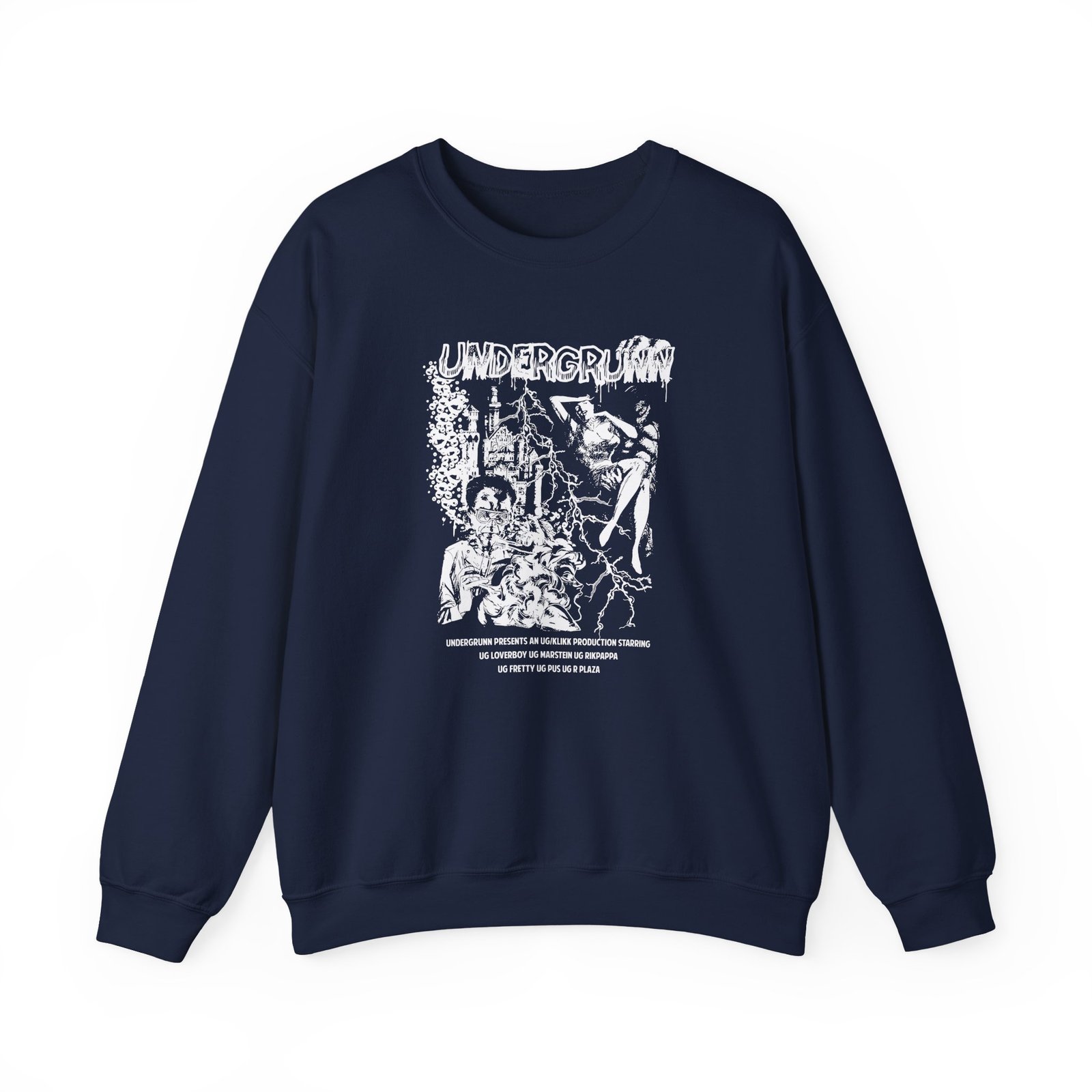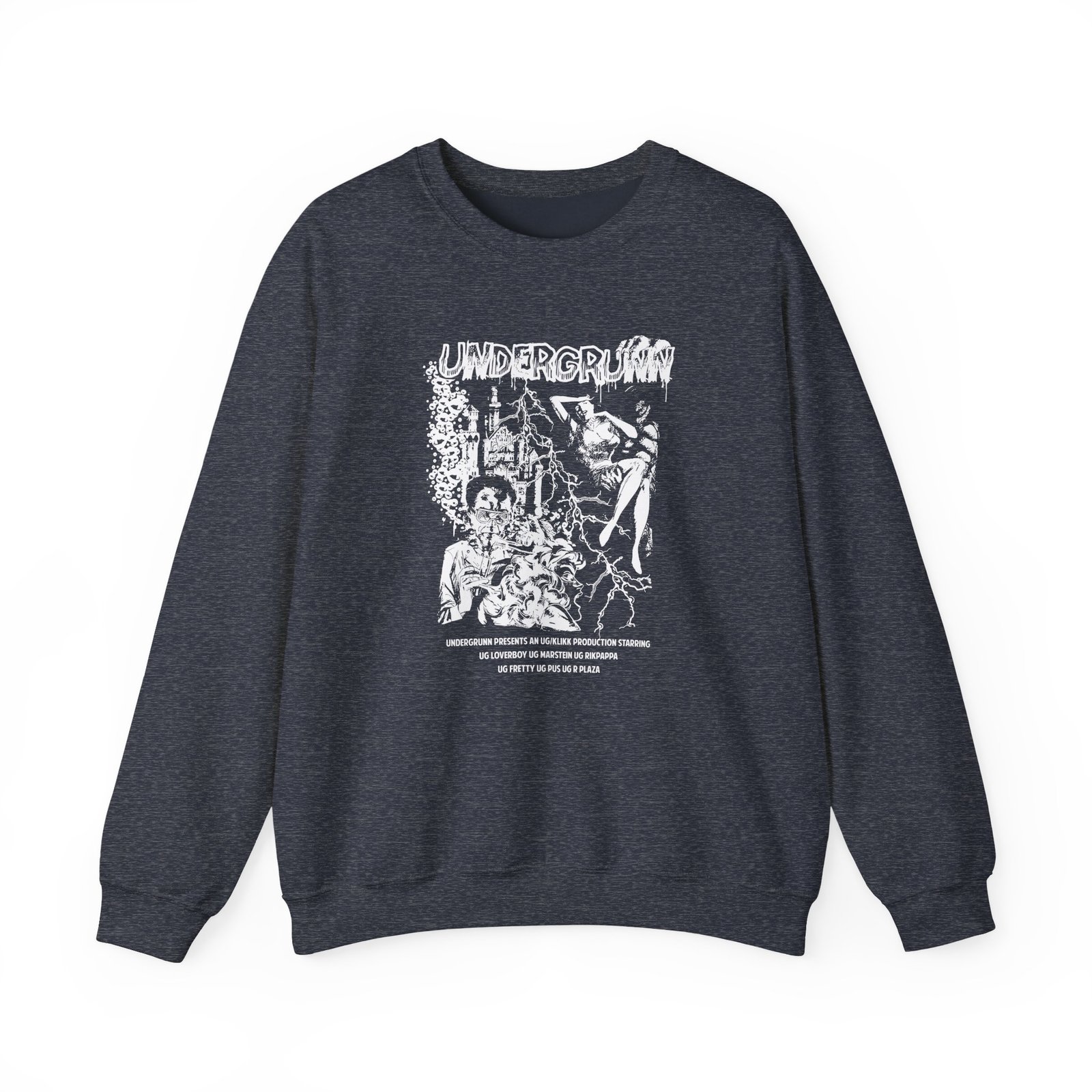 Ideal for any situation, a Undergrunn Halloween unisex heavy blend crewneck sweatshirt is pure comfort. These garments are made from polyester and cotton. This combination helps designs come out looking fresh and beautiful. The collar is ribbed knit, so it retains its shape even after washing. There are no itchy side seams on these sweaters.