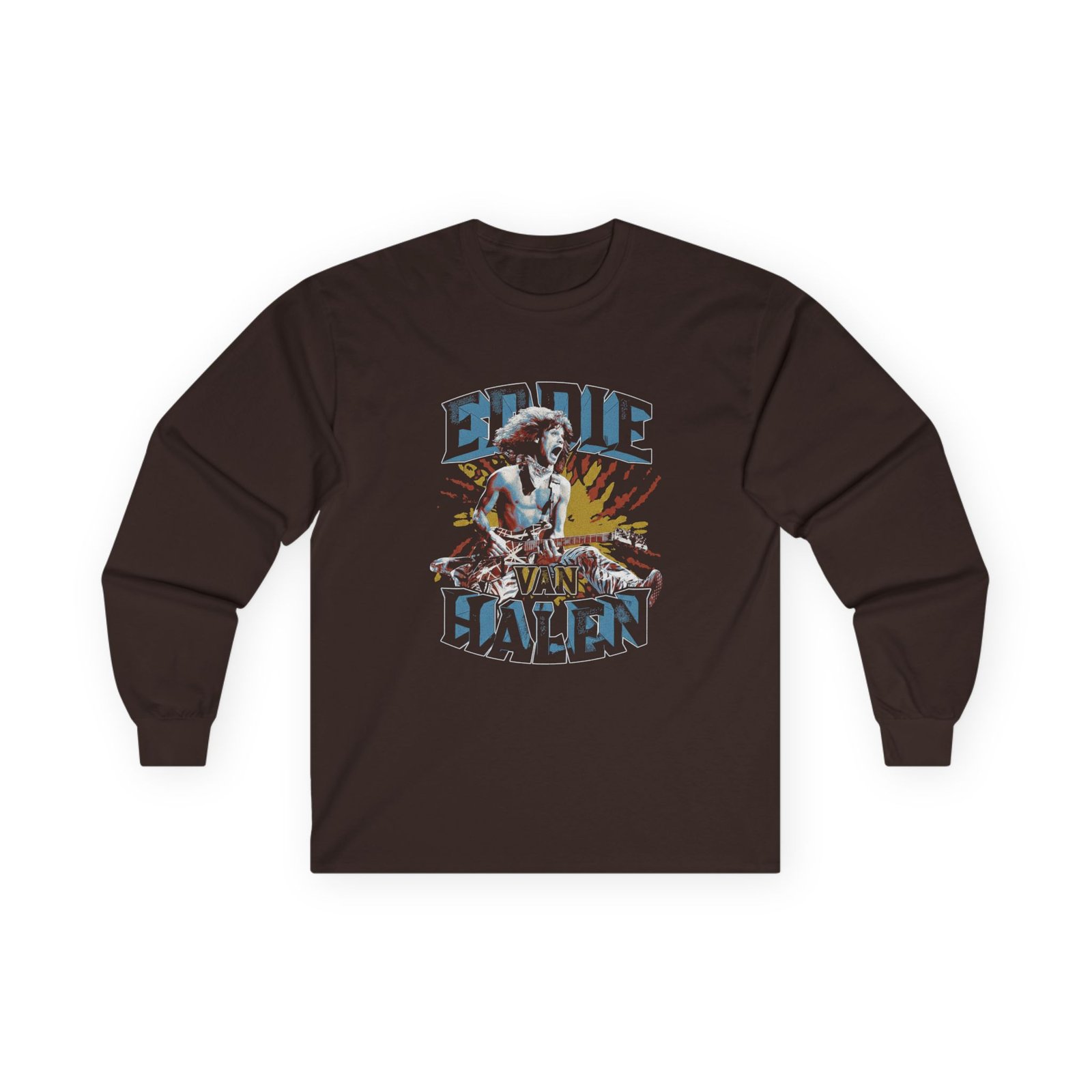 A bit more formal than a standard-issue t-shirt, the Van Halen Eddie ultra cotton long sleeve tee is a clear comfort winner. The sleeves also act as a nice frame. There are no side seams. The shoulders are taped for improved durability. This makes for a good fitting around the shoulders and neck. The cotton used for these shirts is environmentally friendly.