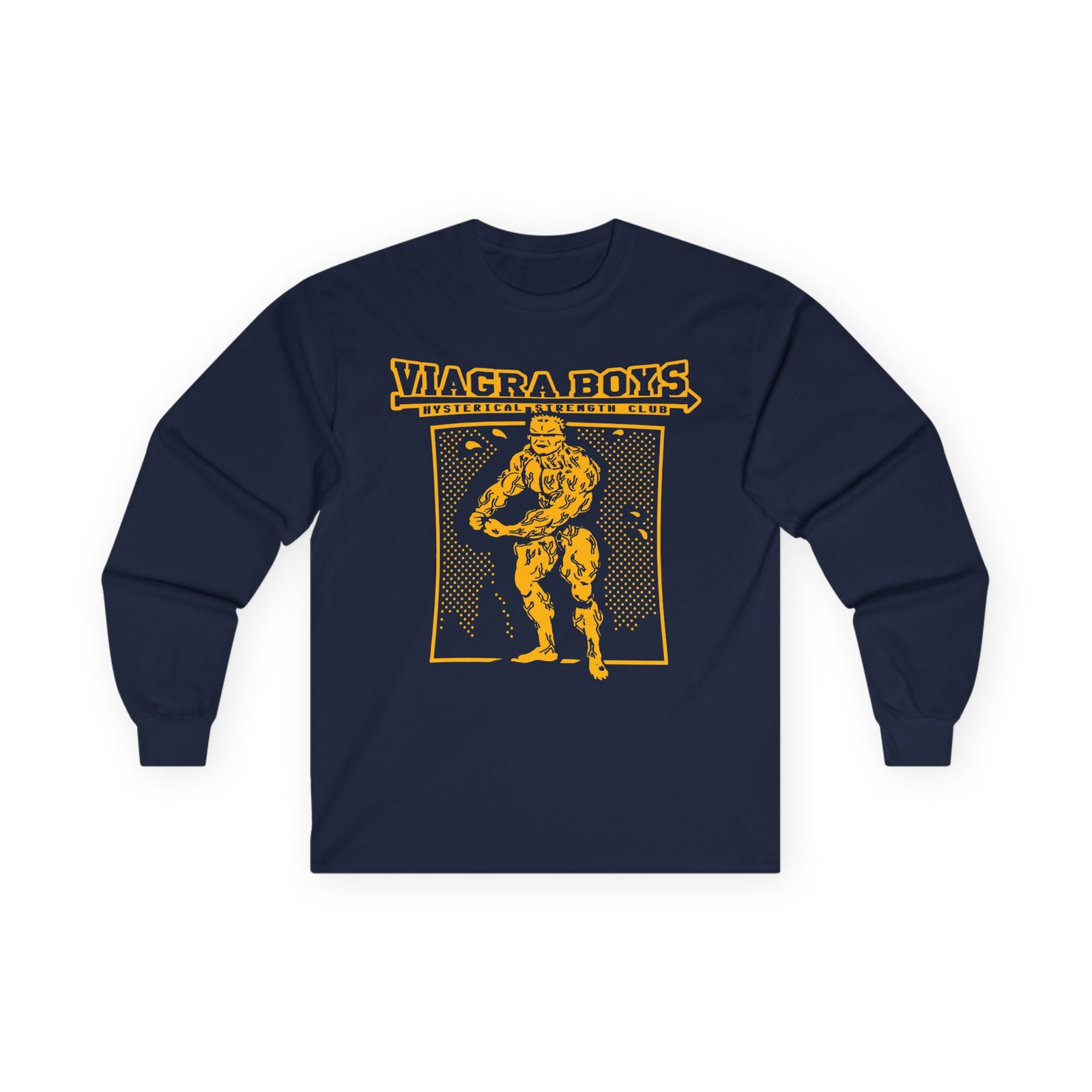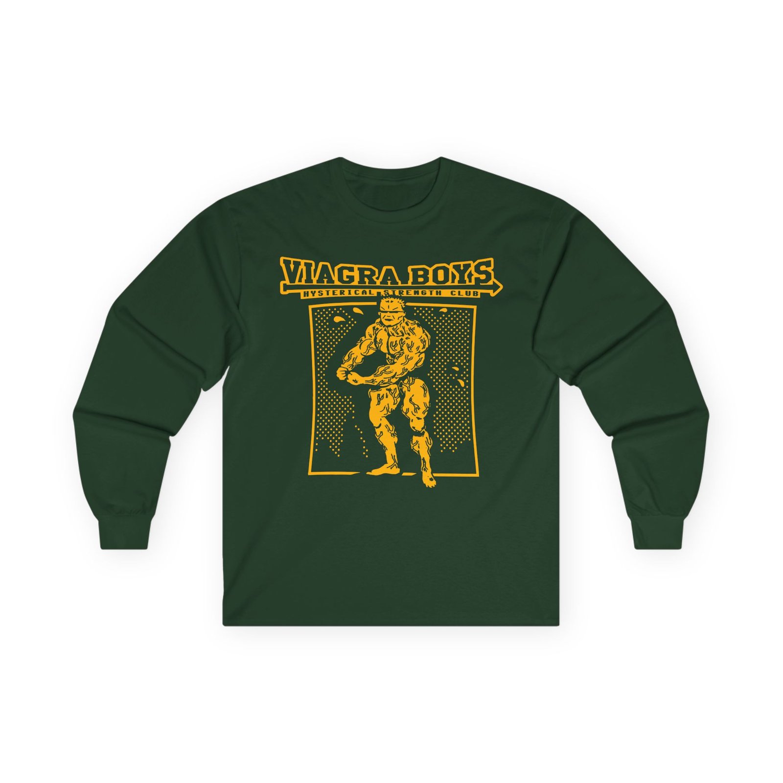 A bit more formal than a standard-issue t-shirt, the Viagra Boys Hysterical Strength Club ultra cotton long sleeve tee is a clear comfort winner. The sleeves also act as a nice frame. There are no side seams. The shoulders are taped for improved durability. This makes for a good fitting around the shoulders and neck. The cotton used for these shirts is environmentally friendly.