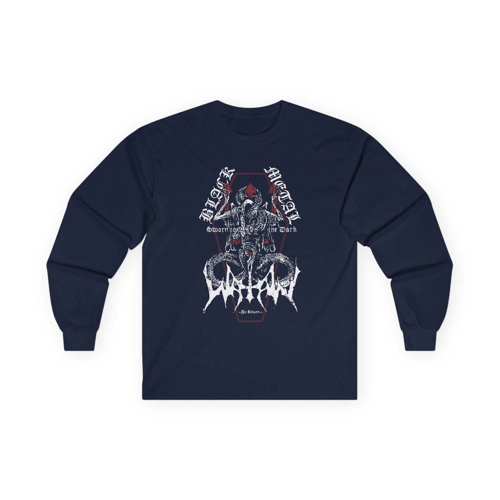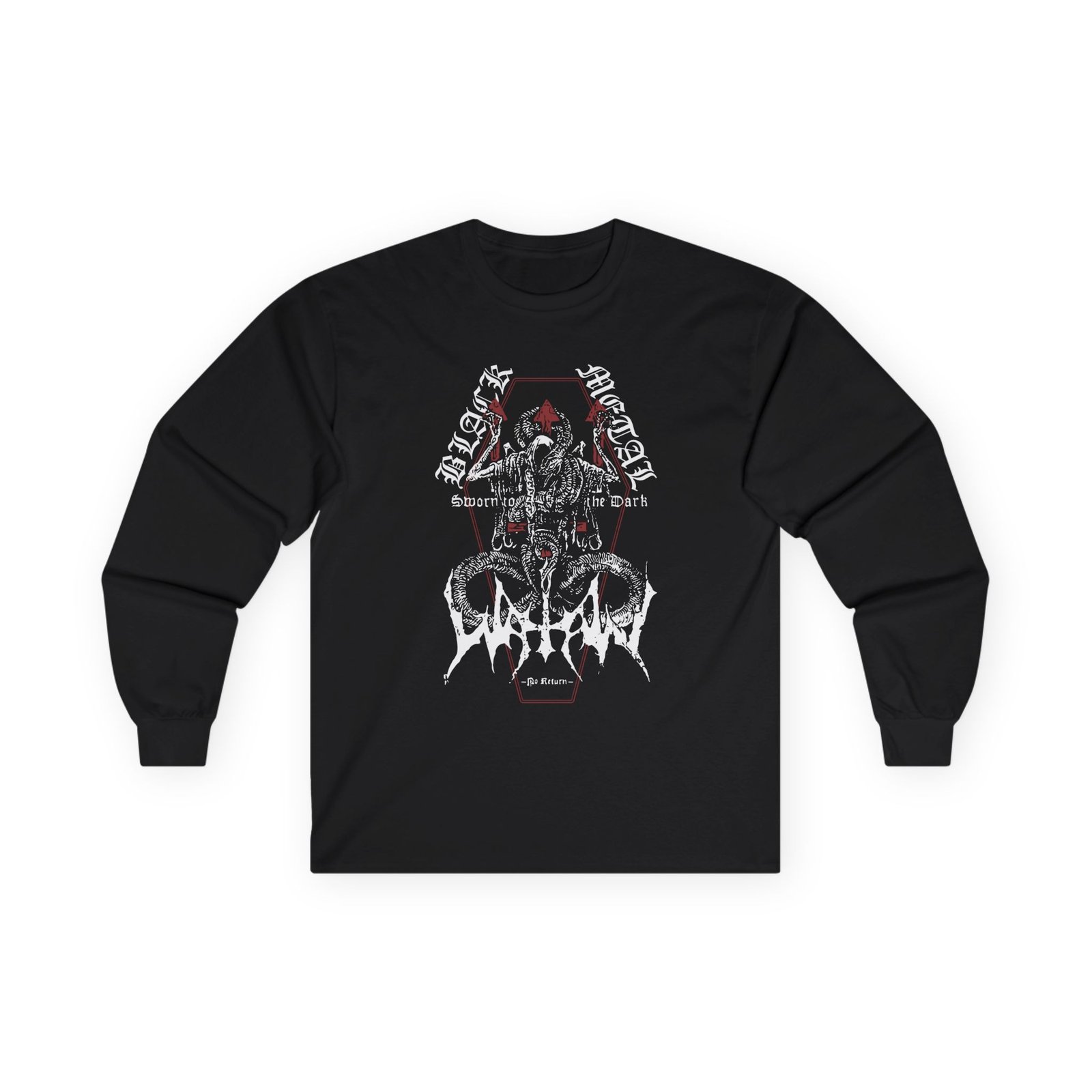 A bit more formal than a standard-issue t-shirt, the Watain Sworn to the Dark ultra cotton long sleeve tee is a clear comfort winner. The sleeves also act as a nice frame. There are no side seams. The shoulders are taped for improved durability. This makes for a good fitting around the shoulders and neck. The cotton used for these shirts is environmentally friendly.