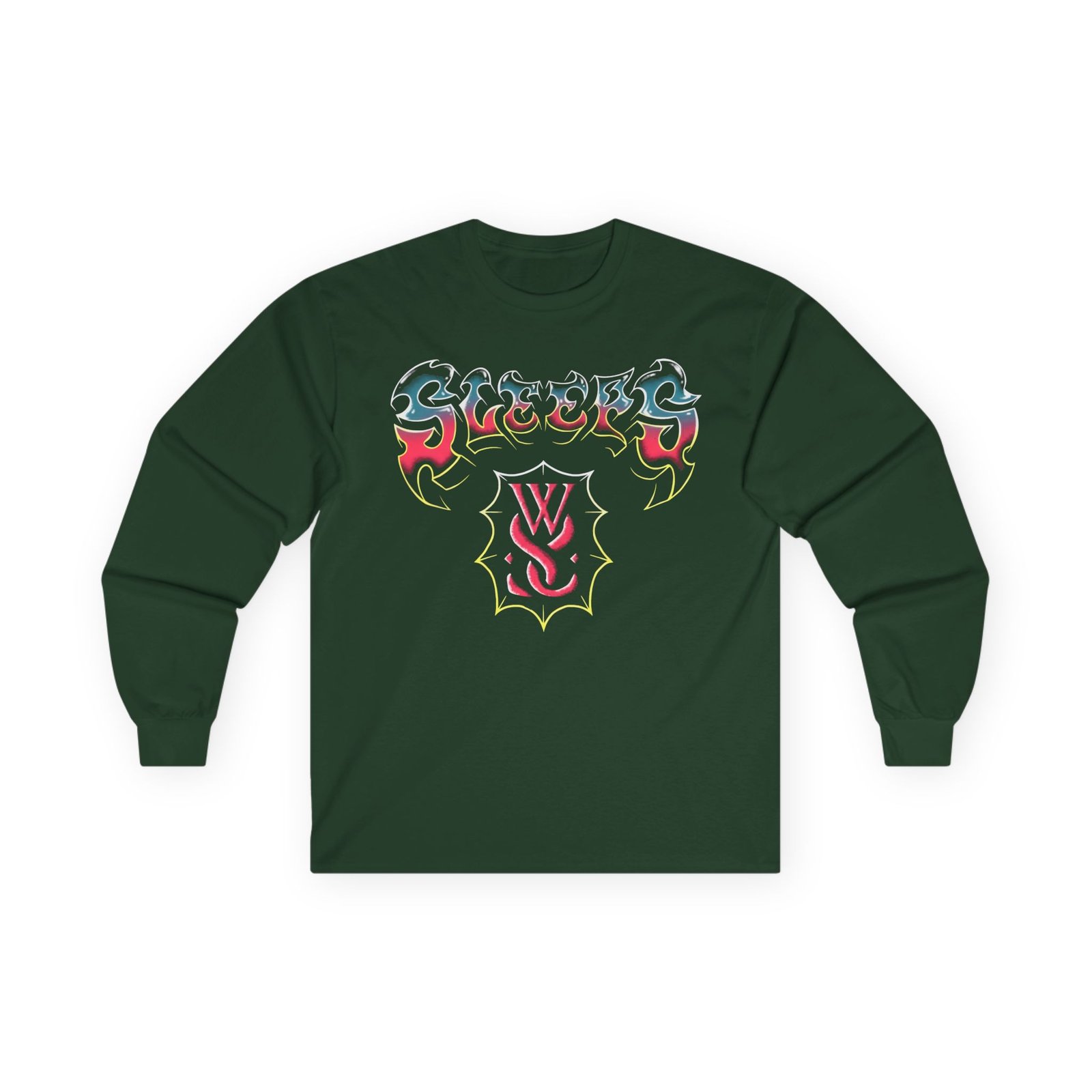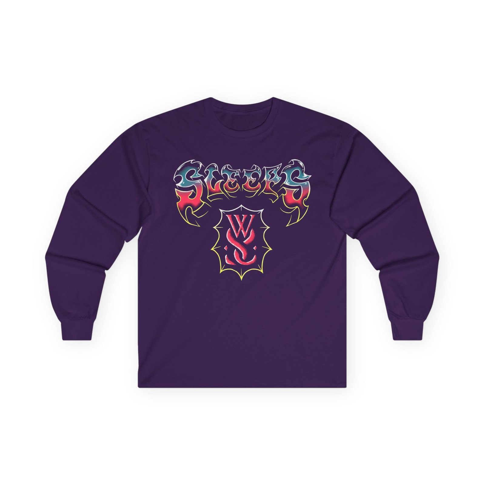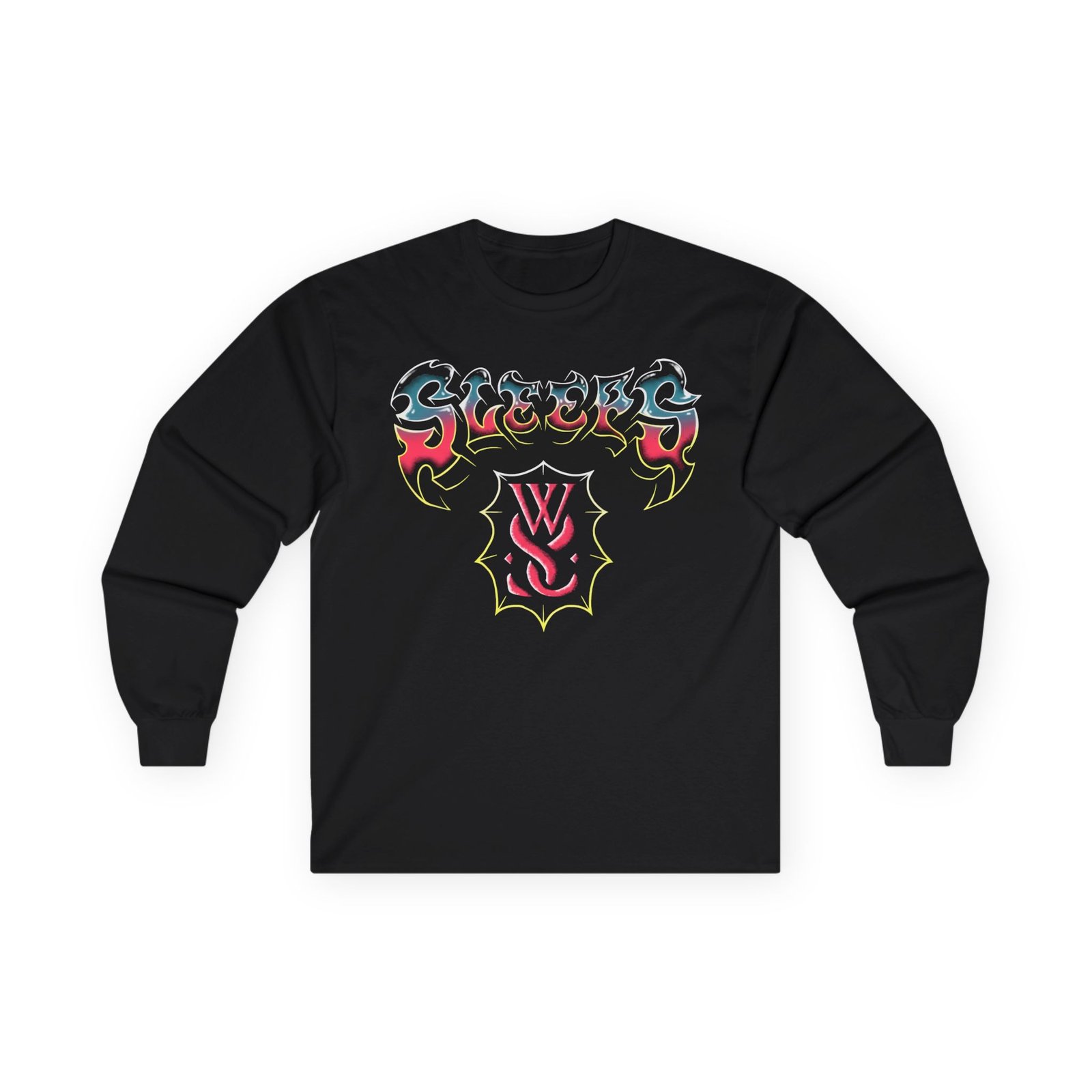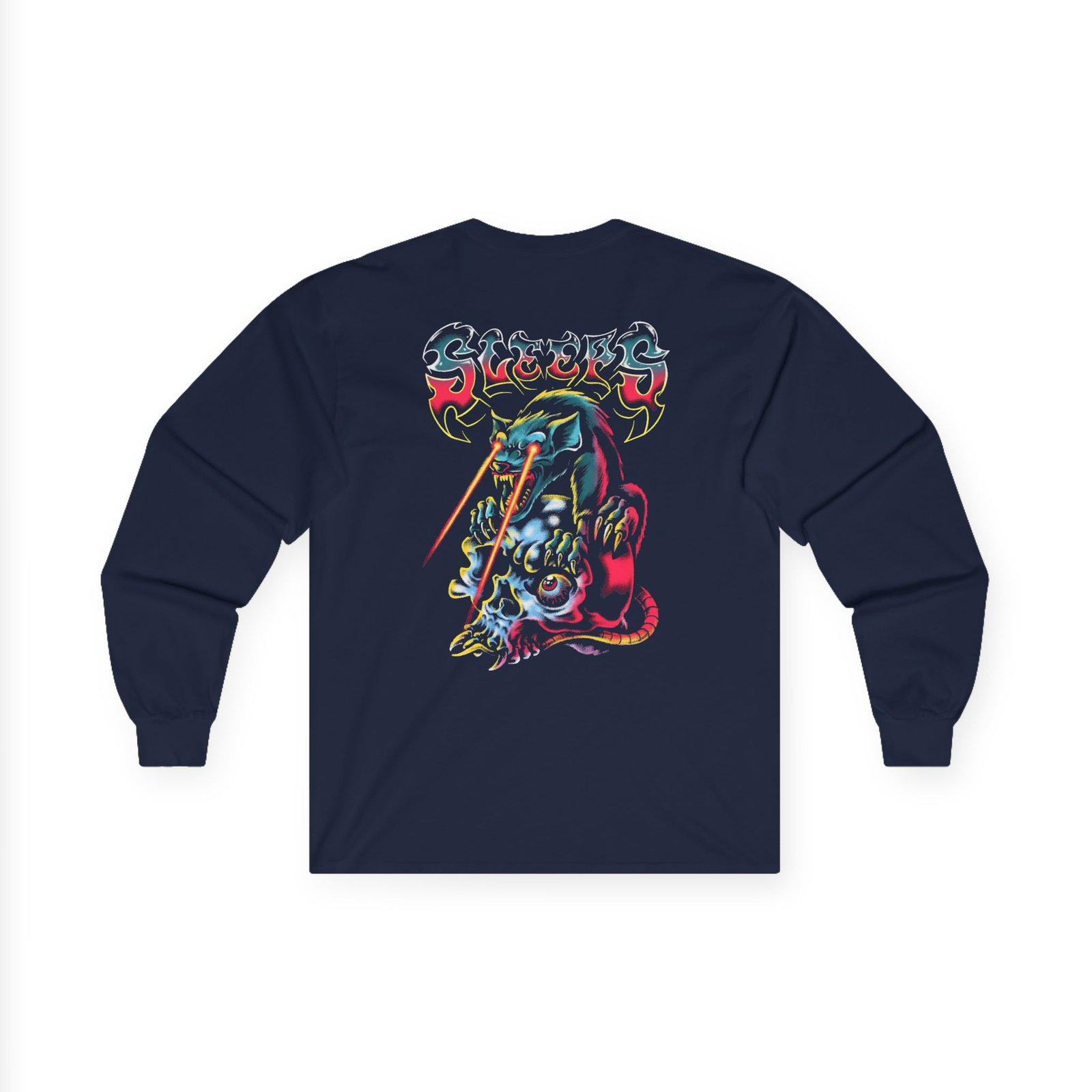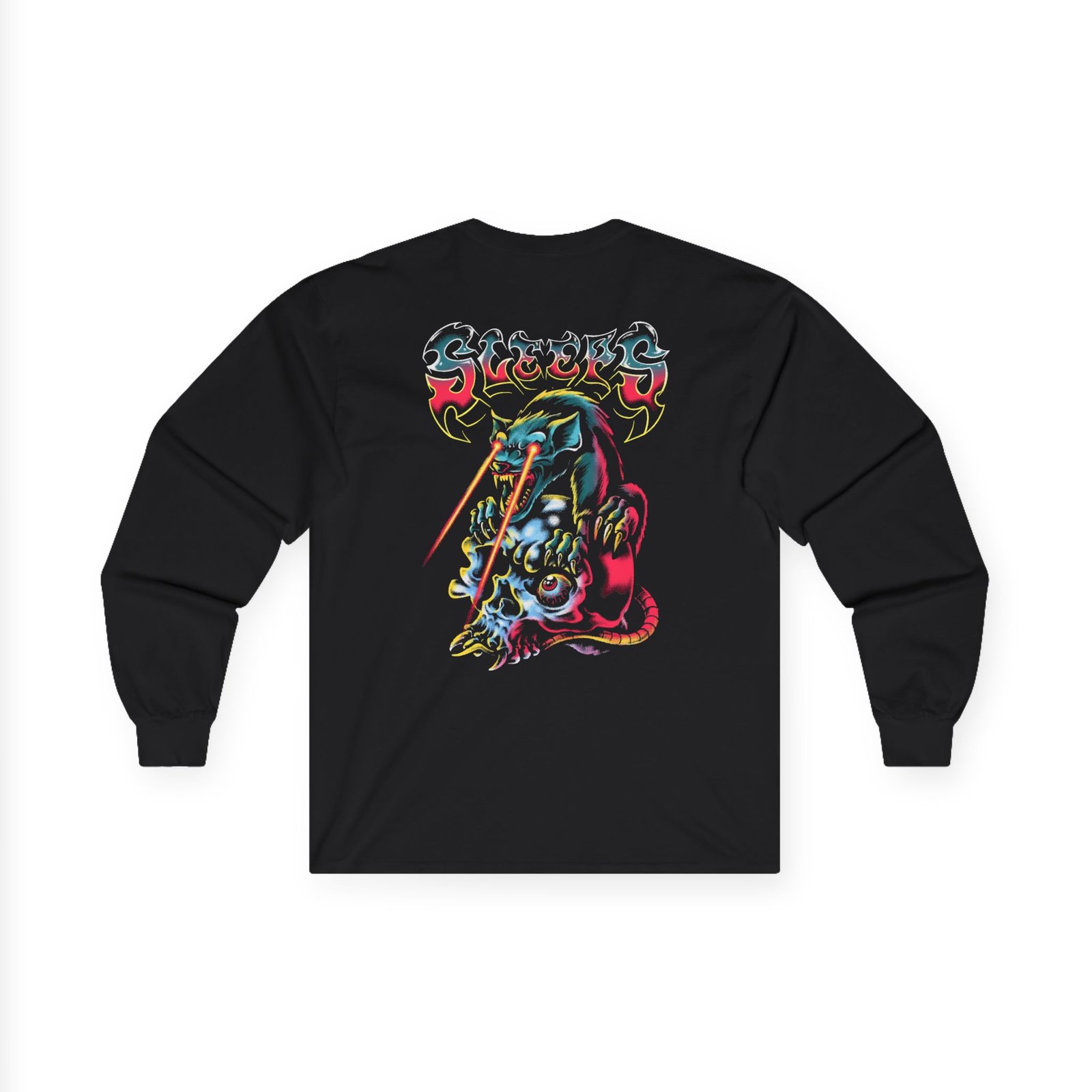 A bit more formal than a standard-issue t-shirt, the While She Sleeps Laser Rat ultra cotton long sleeve tee is a clear comfort winner. The sleeves also act as a nice frame. There are no side seams. The shoulders are taped for improved durability. This makes for a good fitting around the shoulders and neck. The cotton used for these shirts is environmentally friendly.