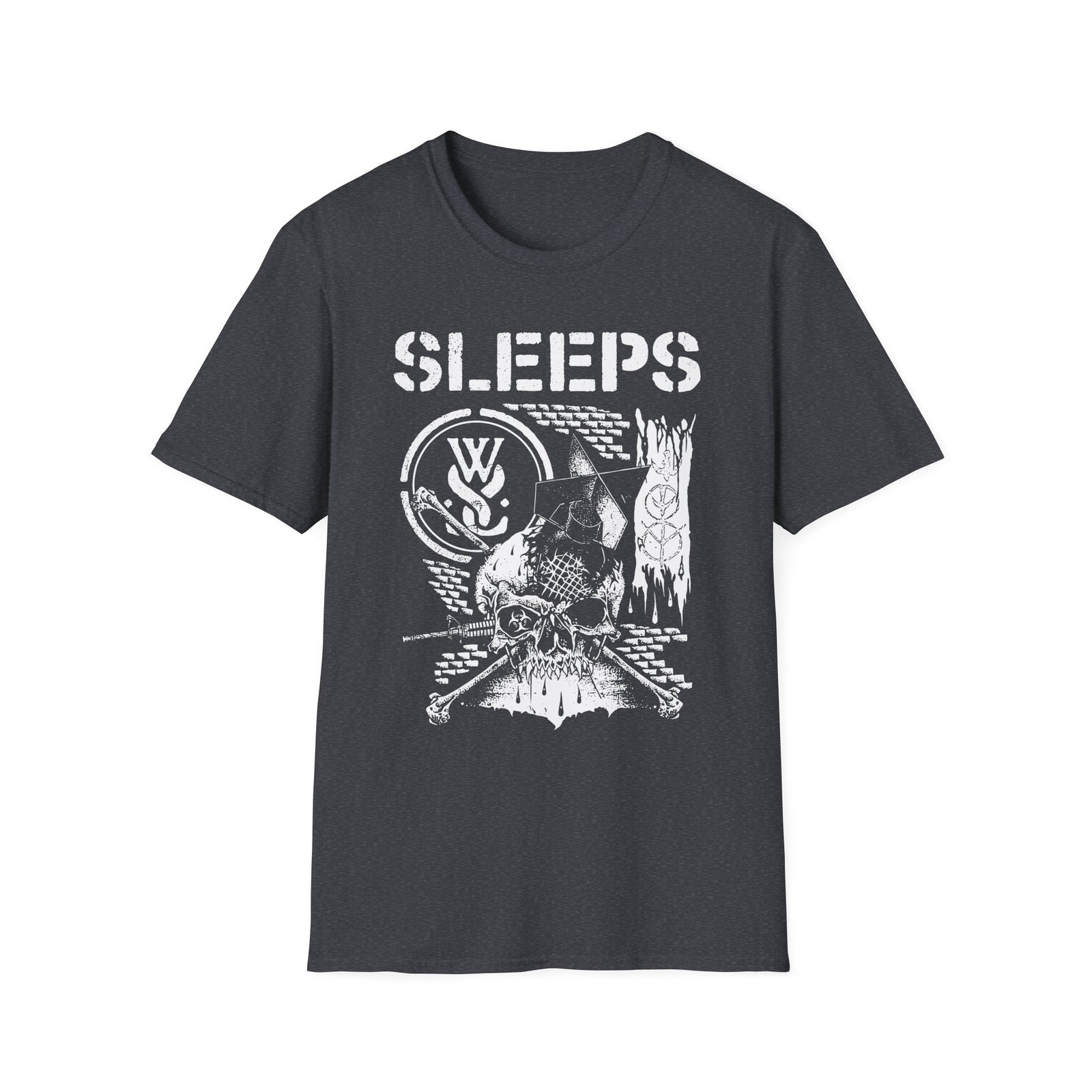 The While She Sleeps Scandinavia 2025 Tour unisex soft-style t-shirt puts a new spin on casual comfort. Made from very soft materials, this tee is 100% cotton for solid colors. Heather colors and sports grey include polyester. The shoulders have twill tape for improved durability. There are no side seams. The collar is made with ribbed knitting to prevent curling damage.