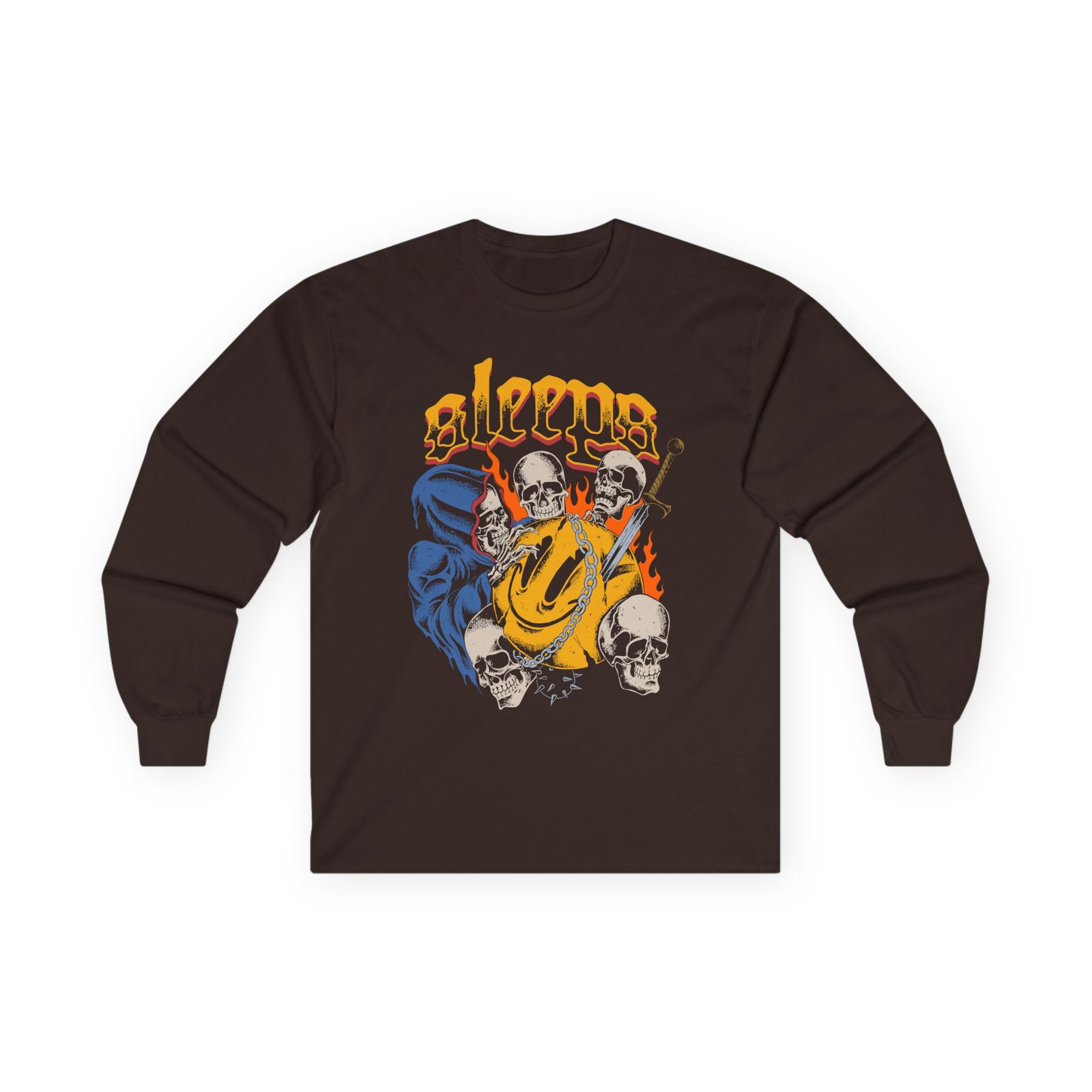 A bit more formal than a standard-issue t-shirt, the While She Sleeps Smile ultra cotton long sleeve tee is a clear comfort winner. The sleeves also act as a nice frame. There are no side seams. The shoulders are taped for improved durability. This makes for a good fitting around the shoulders and neck. The cotton used for these shirts is environmentally friendly.